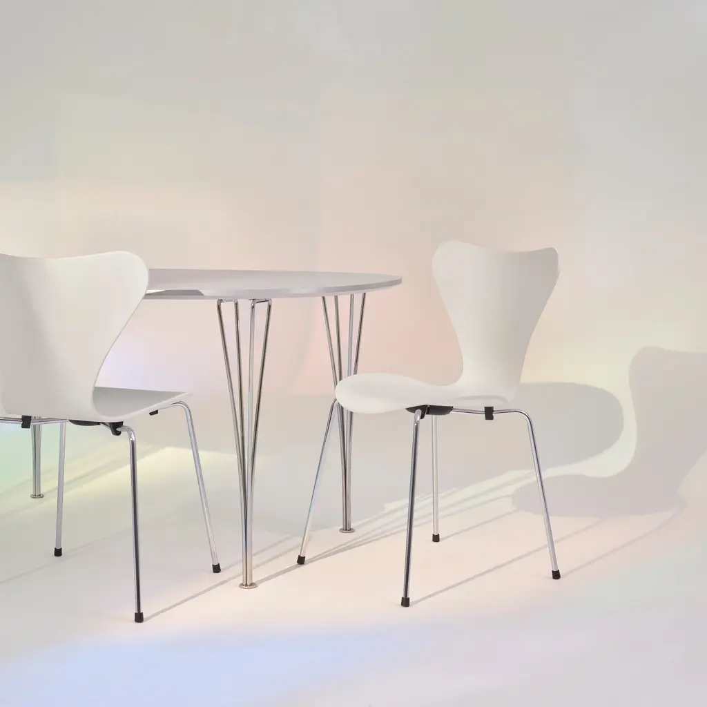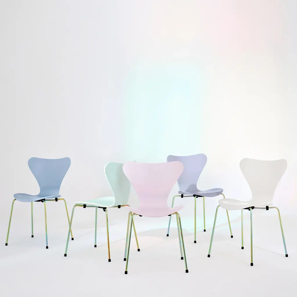 Elevate your dining experience with the new Series 7 7:14 AM Limited Edition Dining Chair from Fritz Hansen. Newly released, the iconic Series 7 chair gets redressed in ethereal pastel colors inspired by Denmark's morning light. Featuring a rainbow or chrome base and five serene colors, it complements any interior style–farmhouse to bohemian–and merges major Scandinavian designer sophistication (Arne Jacobsen) with a contemporary palette. Highlights