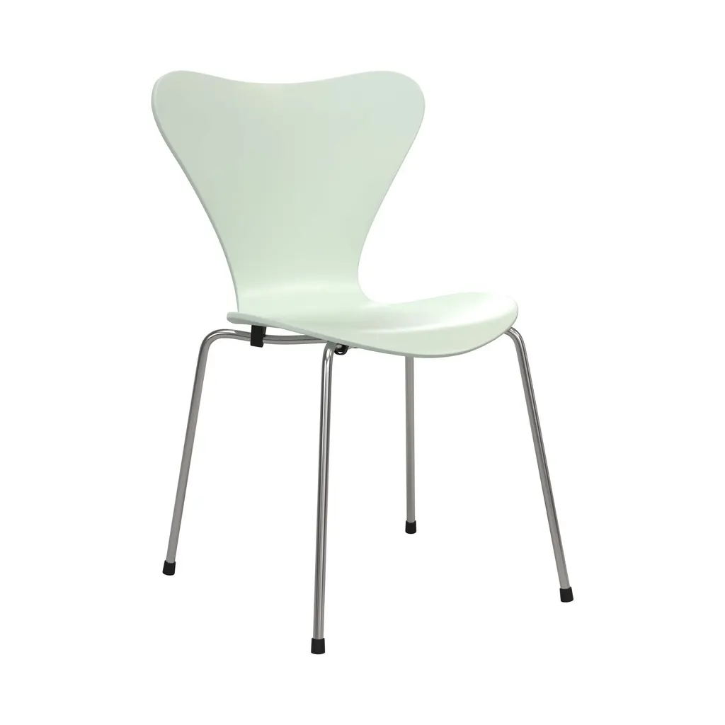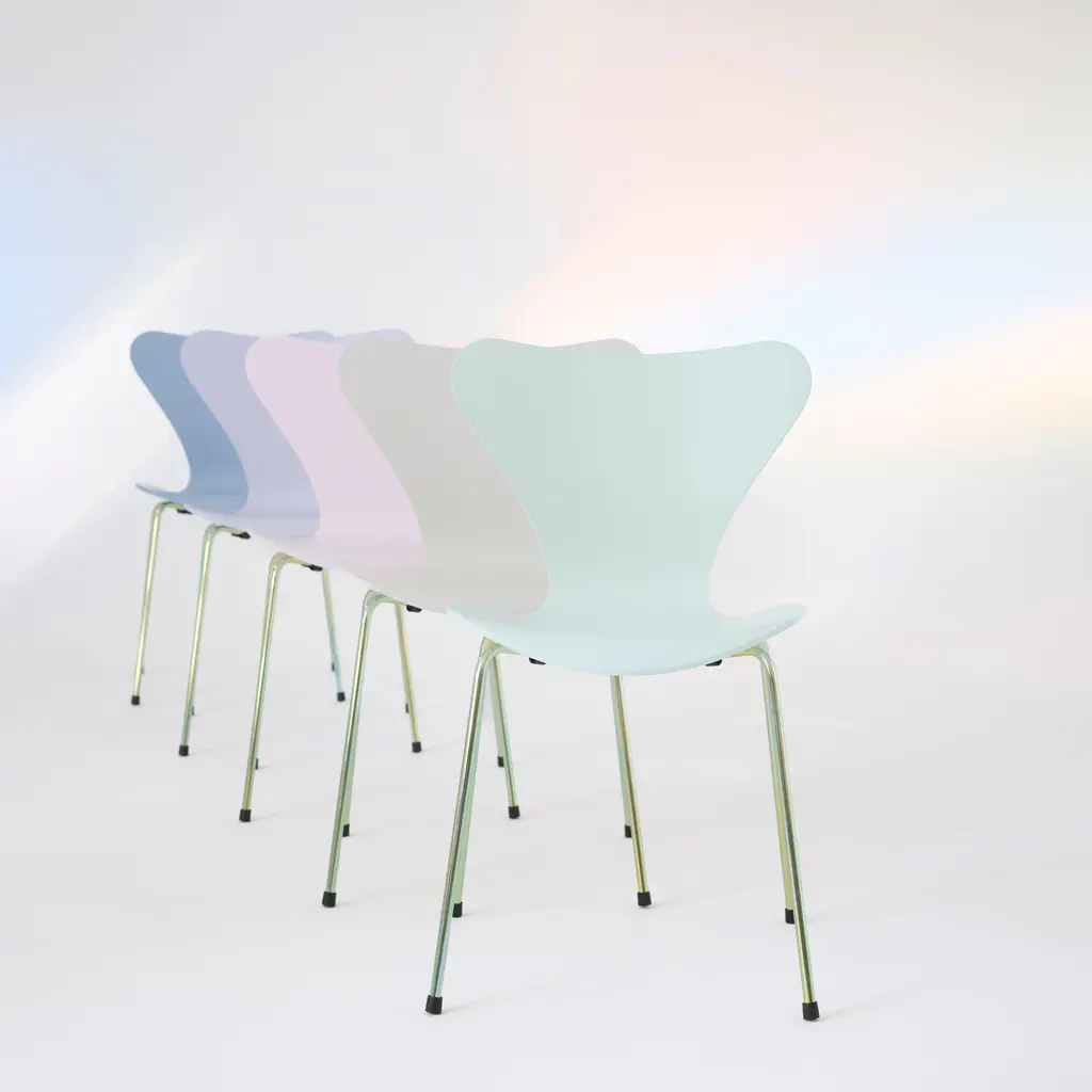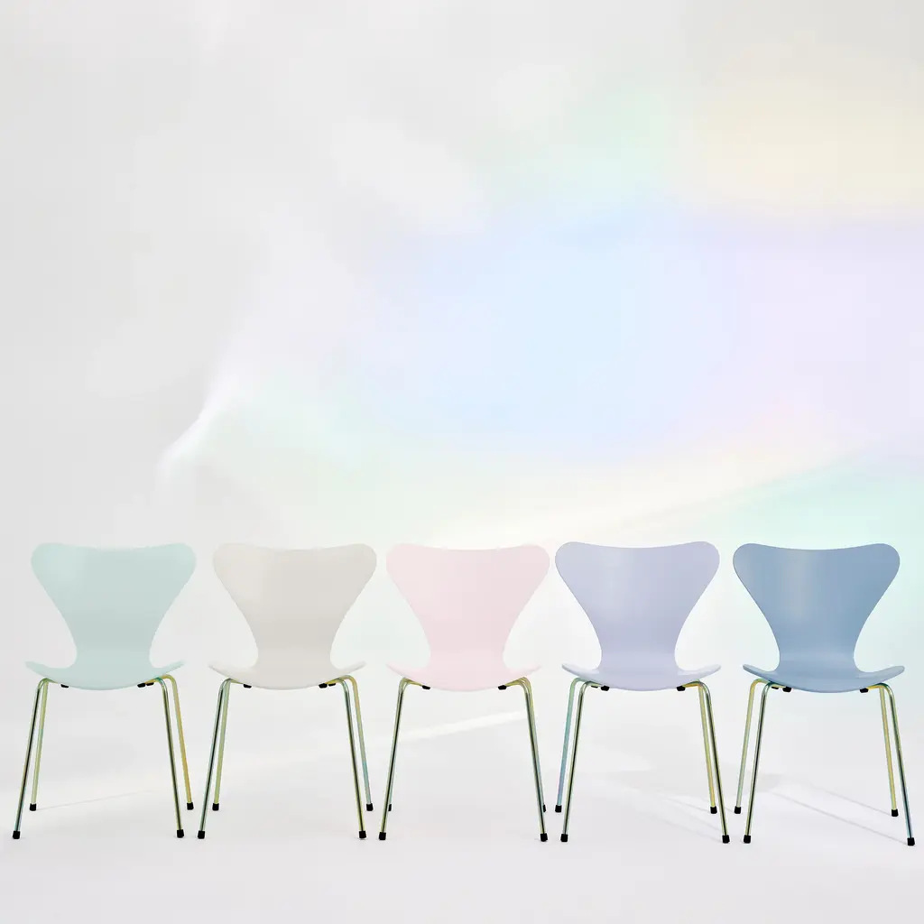 Elevate your dining experience with the new Series 7 7:14 AM Limited Edition Dining Chair from Fritz Hansen. Newly released, the iconic Series 7 chair gets redressed in ethereal pastel colors inspired by Denmark's morning light. Featuring a rainbow or chrome base and five serene colors, it complements any interior style–farmhouse to bohemian–and merges major Scandinavian designer sophistication (Arne Jacobsen) with a contemporary palette. Highlights