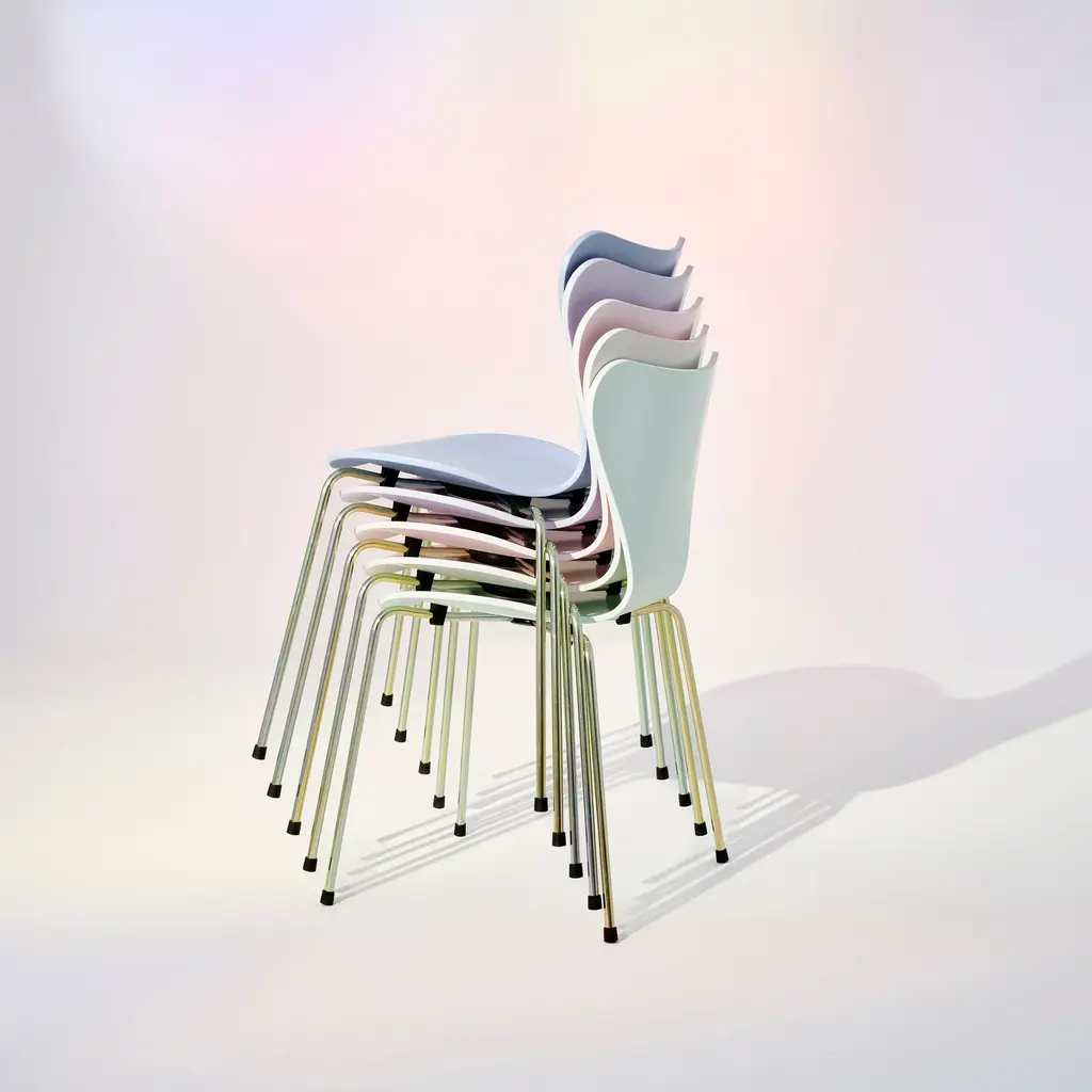 Elevate your dining experience with the new Series 7 7:14 AM Limited Edition Dining Chair from Fritz Hansen. Newly released, the iconic Series 7 chair gets redressed in ethereal pastel colors inspired by Denmark's morning light. Featuring a rainbow or chrome base and five serene colors, it complements any interior style–farmhouse to bohemian–and merges major Scandinavian designer sophistication (Arne Jacobsen) with a contemporary palette. Highlights