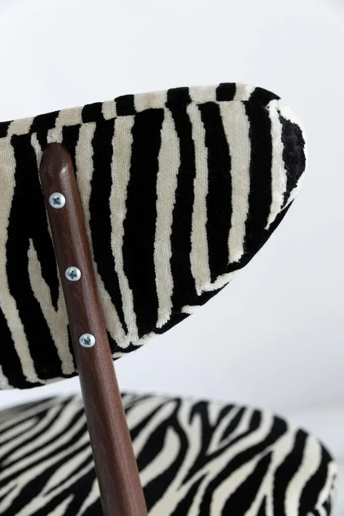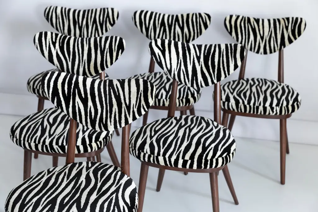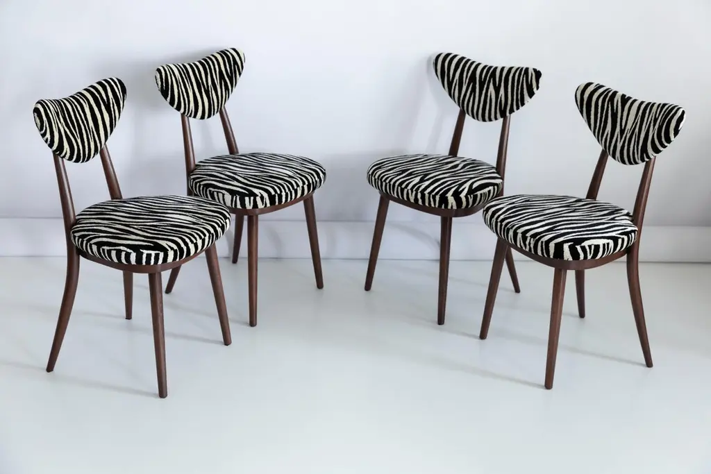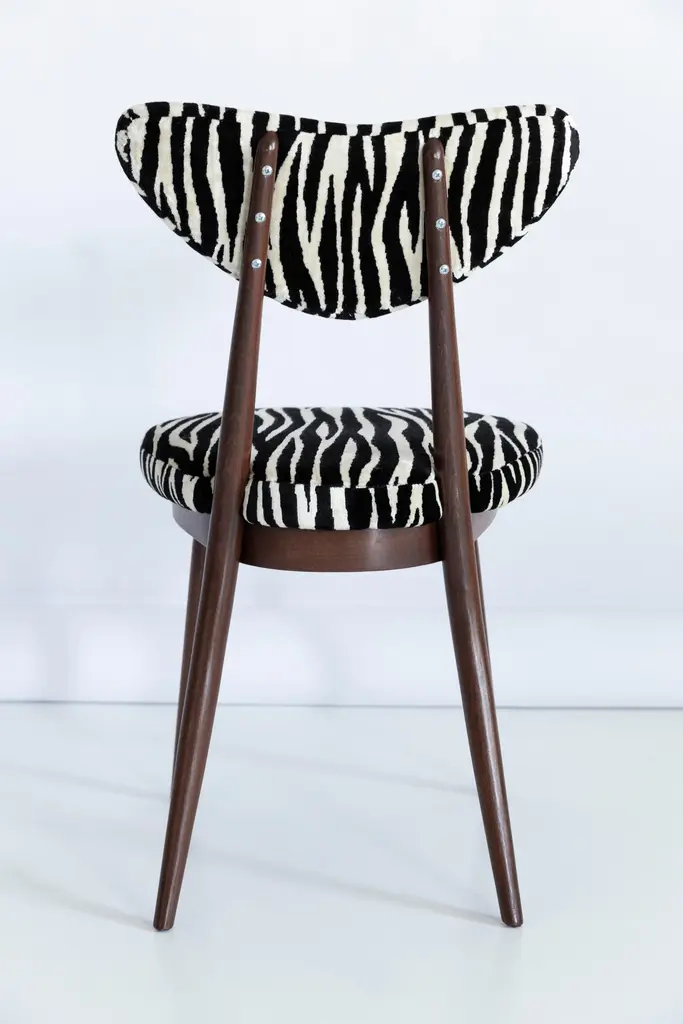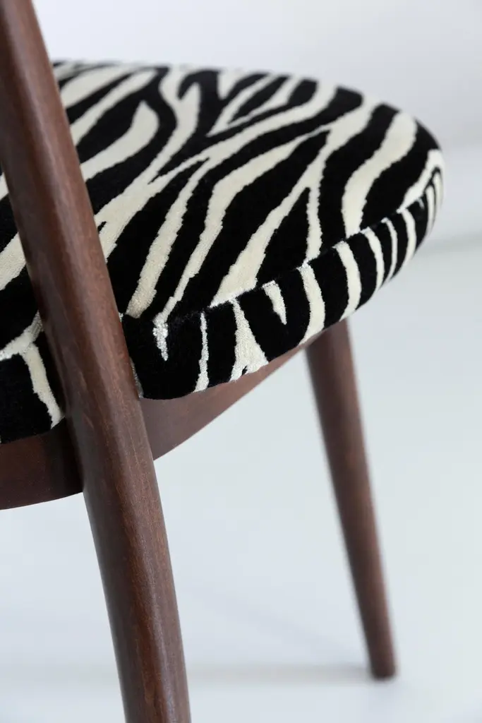 A set of 6 chairs type A5828. Colloquially called "heart" in amazing zebra fabric. The furniture was designed by Helena and Jerzy Kurmanowicz. They were produced in Radomsko Woodworking Factory and we thoroughly renovated them. The construction is made of beechwood dyed with water stain brown. The chairs are protected with acrylic varnish with a satin glow.Fabric - a collection of soft, viscose plush fabrics. They are an excellent choice for upholstery furniture for expressive and characterful interiors in the Art Deco, colonial, vintage or boho chic style. Abrasion Resistance Category A (30,000 cycles). Ingredients: Polyester 7%, viscose 93%.We can prepare also smaller or bigger sets of 2, 4, 8 or more chairs in different wood and fabric color.
