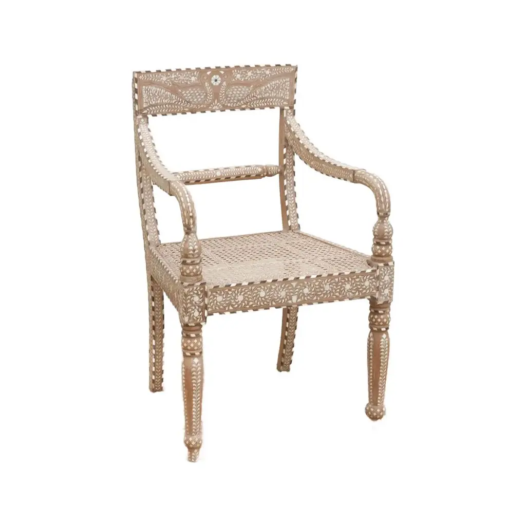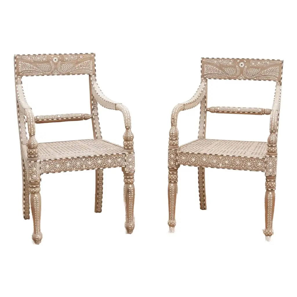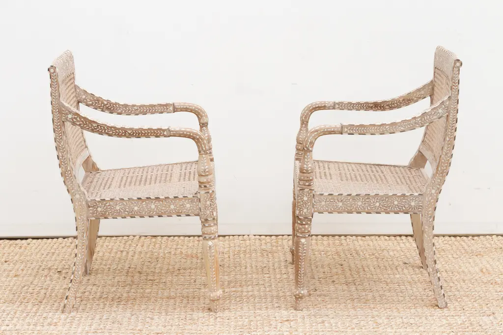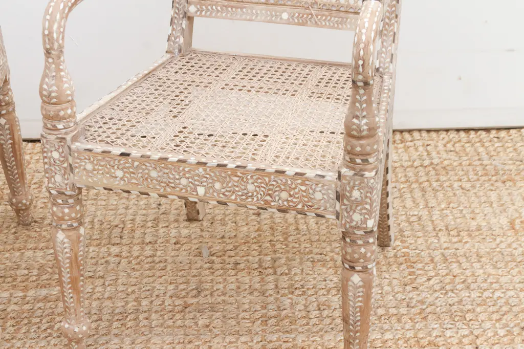 Elevate your space with this elegant pair of Anglo-Indian inlaid armchairs, featuring breathable cane seats and backs. Handcrafted with intricate inlay on the backrests, arms, and turned legs, they reflect the refined artistry of the British Colonial era. Each tiny inlay piece is meticulously cut and set by hand. Perfect for a sophisticated dining or living room setting.