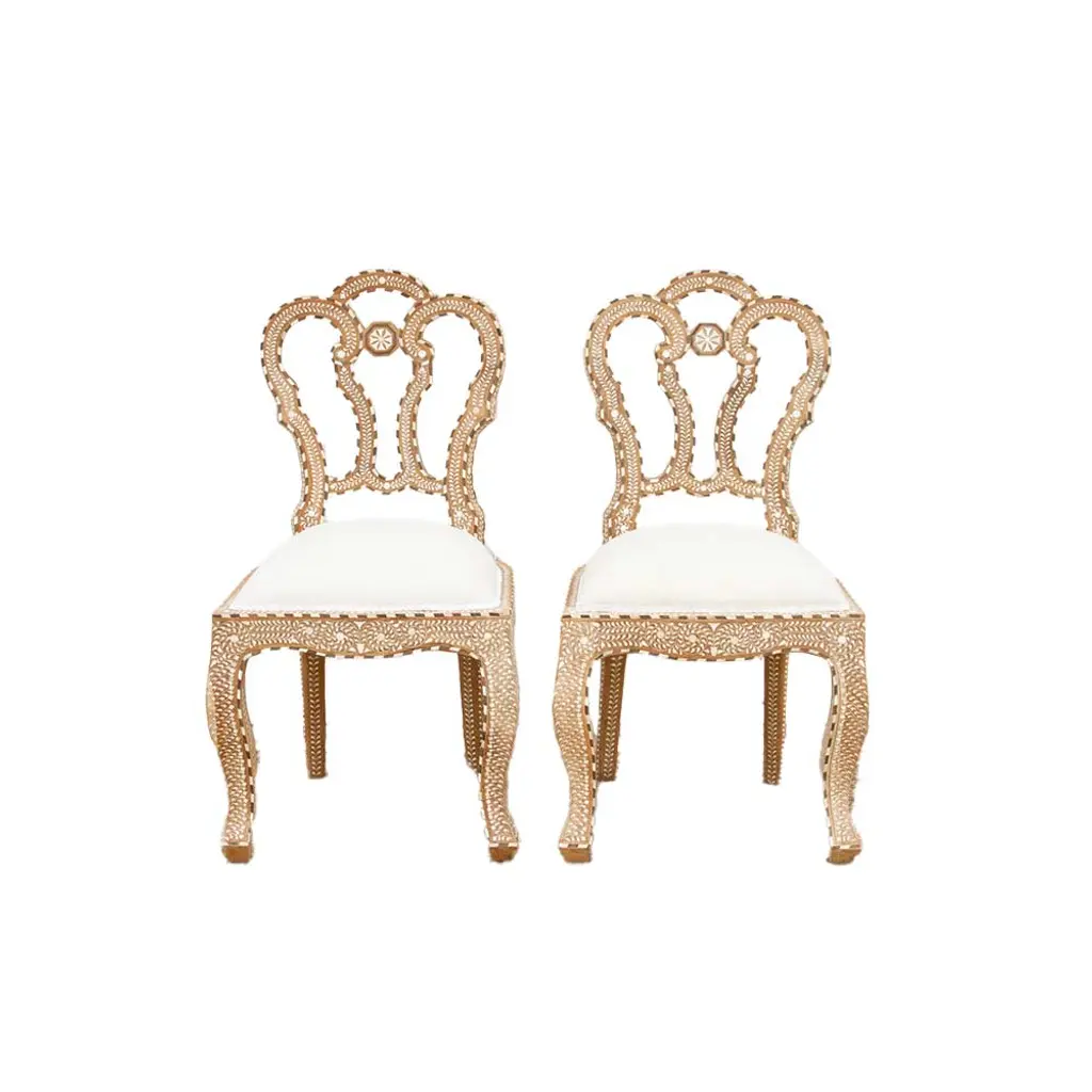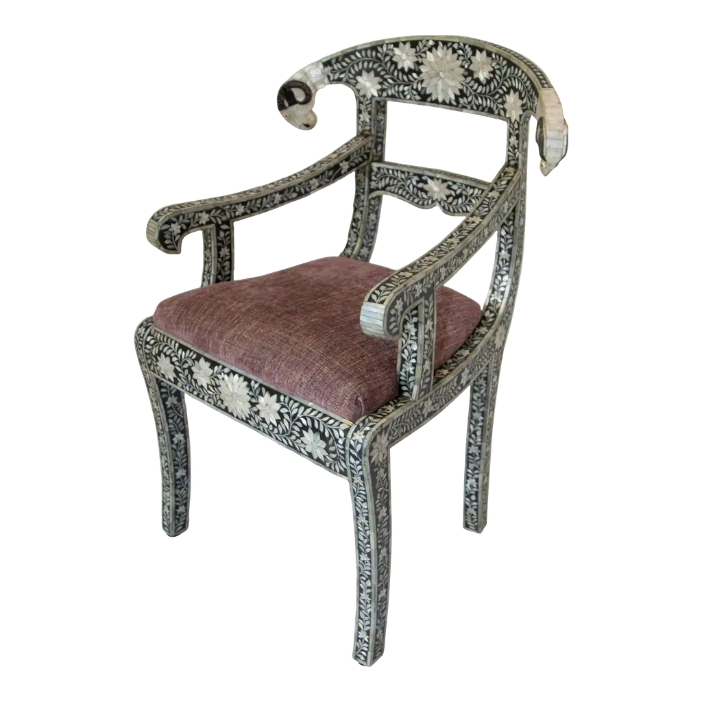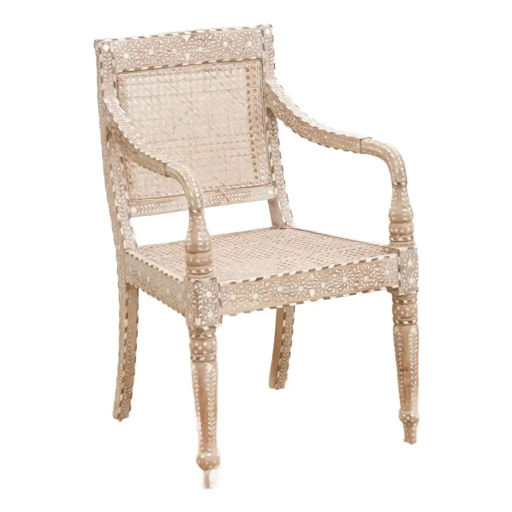 Elevate your space with this elegant pair of Anglo-Indian inlaid armchairs, featuring breathable cane seats and backs. Handcrafted with intricate inlay on the backrests, arms, and turned legs, they reflect the refined artistry of the British Colonial era. Each tiny inlay piece is meticulously cut and set by hand. Perfect for a sophisticated dining or living room setting.