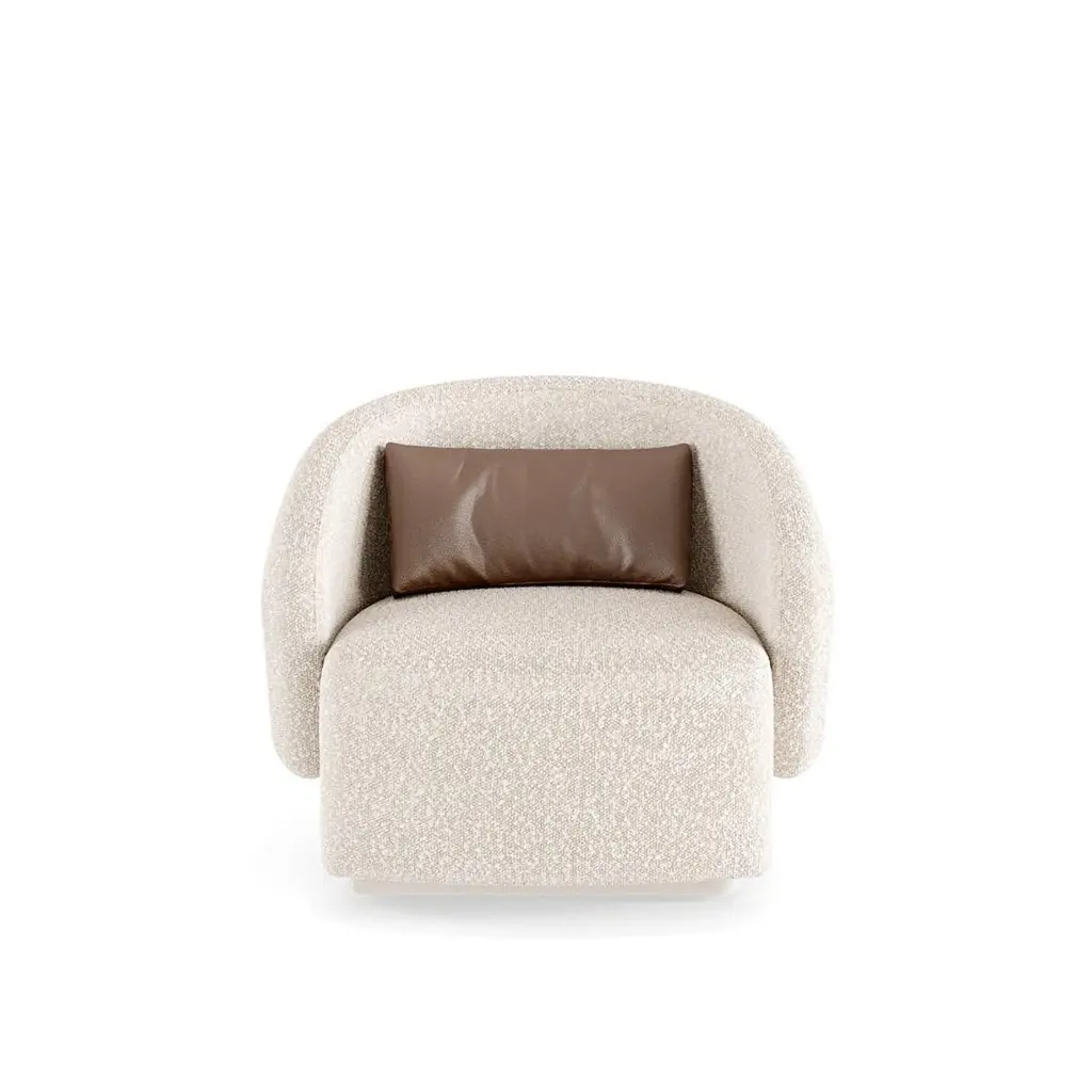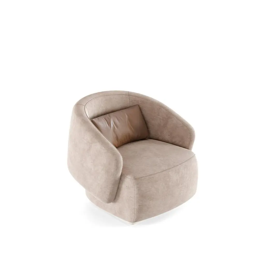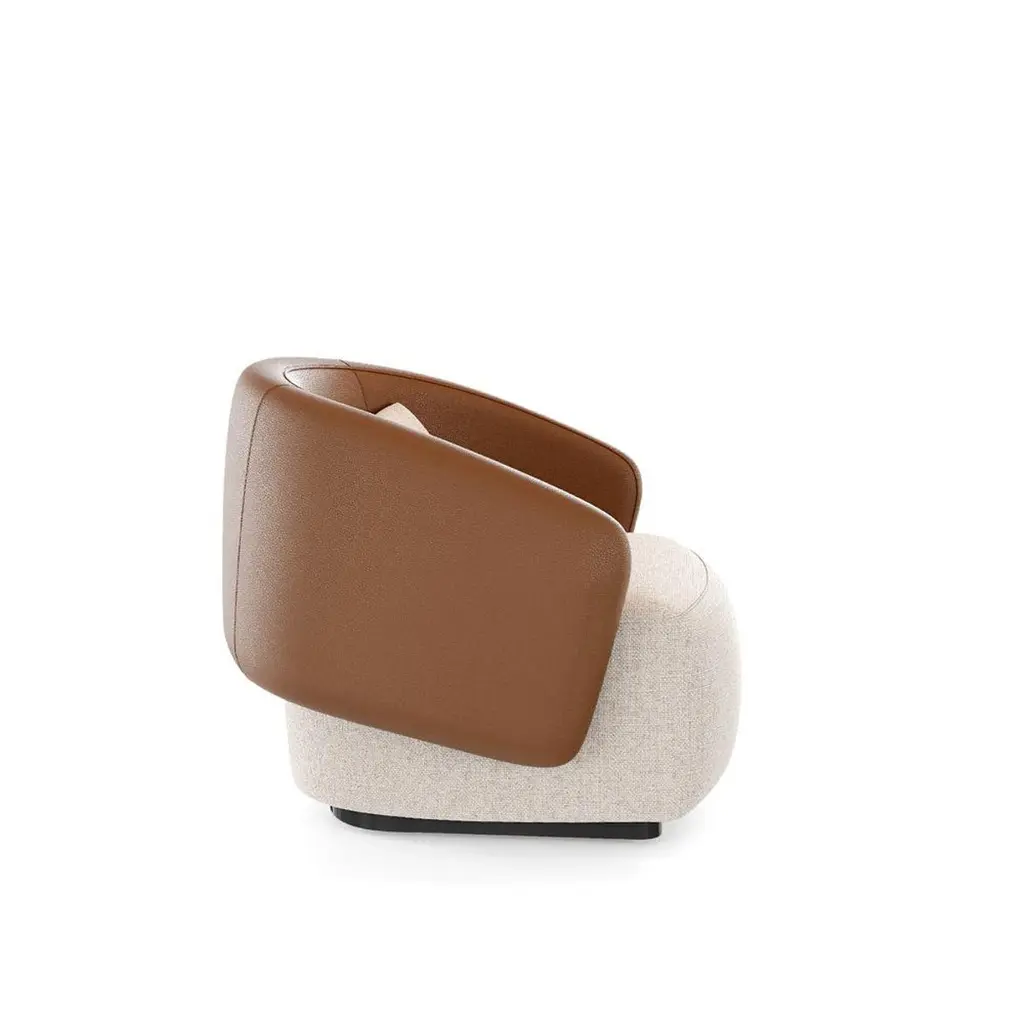 This armchair presents a sophisticated fusion of materials, featuring a contrasting leather backrest panel seamlessly integrated with a soft fabric base. The side profile highlights the sculptural quality of its design, showcasing an enveloping form that combines aesthetic appeal with ergonomic comfort. Its compact footprint and elegant contours make it a versatile choice for modern interiors, whether as a statement piece or part of a cohesive seating arrangement.The possibility of upholstering the seat and back with different fabrics offers great versatility, allowing you to create striking contrasts or elegant complements between patterned and solid-color materials. This customization enhances its adaptability, making it a perfect fit for living spaces and lounging. We do our best to expedite production and to ship and deliver product within the listed lead time, however current lead times might be longer due to global shipping backlog and delays. These delays are out of our control and cannot be a reason to cancel an order.Our pricing includes all costs for international shipping to the U.S., as well as duties and customs clearance fees. Please be aware that local delivery within the U.S. is not included. We offer white glove, front door, and warehouse delivery options. For shipments outside the U.S., kindly reach out to us for a detailed quote.