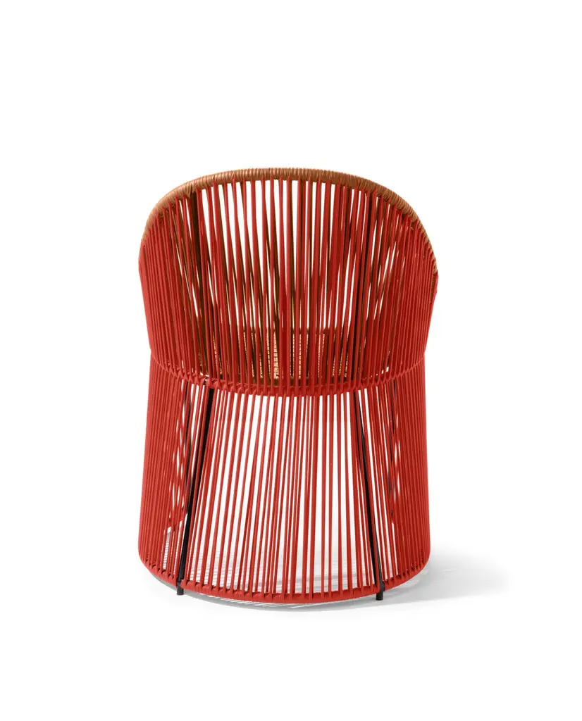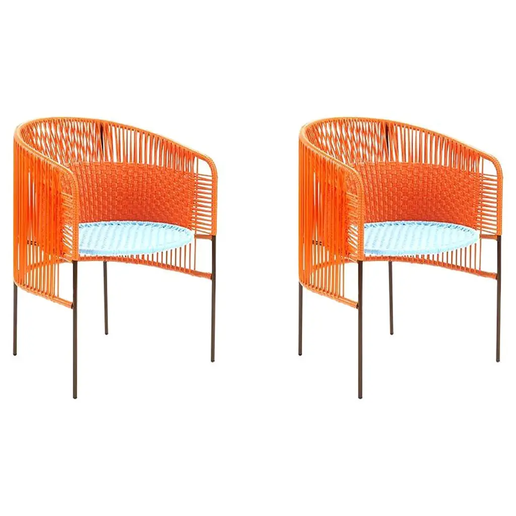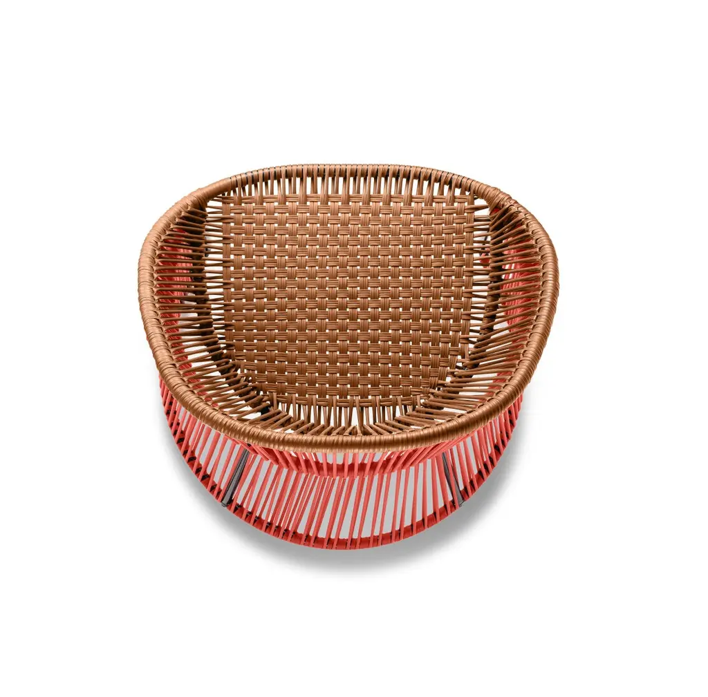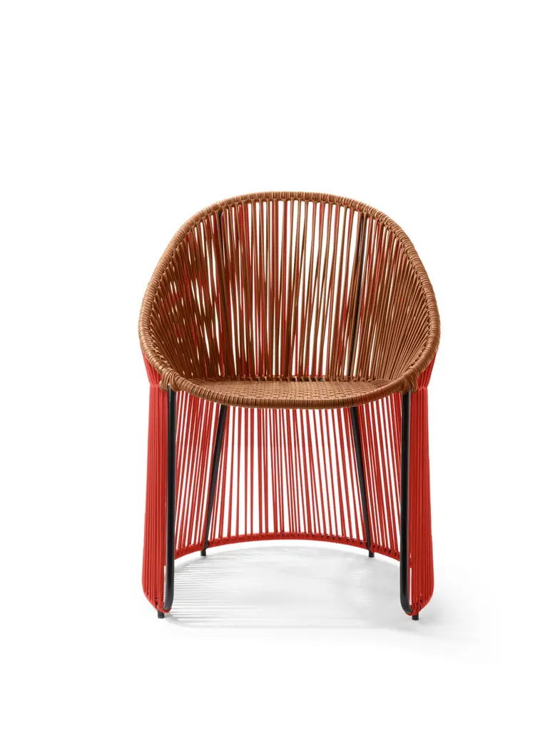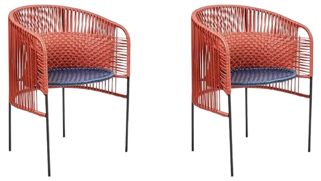 Set of 2 Coral / caramel cartagenas dining chair by Sebastian HerknerMaterials: PVC strings. Galvanized and powder-coated tubular steel frameTechnique: made from recycled plastic. Weaved by local craftspeople in Colombia. Dimensions: W 60.2 x D 53.8 x H 84 cm.Available in colors: black / black / black, coral/ caramel brown/ black, purple/ pastel blue/ black, purple/ olive / black, lila/ honey/ black. The colors and shape of the Cartagenas dining chair are inspired by Sebastian Herkner’s visit to Colombia’s buzzing coastal city Cartagena de Indias. “Fishing pelicans, women selling fruit, cozy restaurants: Cartagena lures you in with its many facets and this collection also plays with perspectives”, describes Sebastian the collection. The elegant, curved chair can be used indoors and outdoors and comes either with a seat and back in contrasting colors or a monochrome version. The colored strings, made from recycled PVC, are woven by hand around the steel frame, using two different colors for the seat and back. The Colombian craftspeople, based in Bogota, use an especially intricate weaving technique to create a neat contrast. It takes them three days to complete one chair.German designer Sebastian Herkner is a long-term collaborator of Ames and has visited Colombia multiple times to experience the country’s cities, nature and people first hand. He also visited many of the ateliers that Ames has partnered with to learn about the unique traditional crafts of Colombia's regions. A sought-after contemporary designer and recipient of many industry awards, he has worked with many international design brands, creating intriguing pieces that showcase his intuition for interesting material, color, and texture combinations