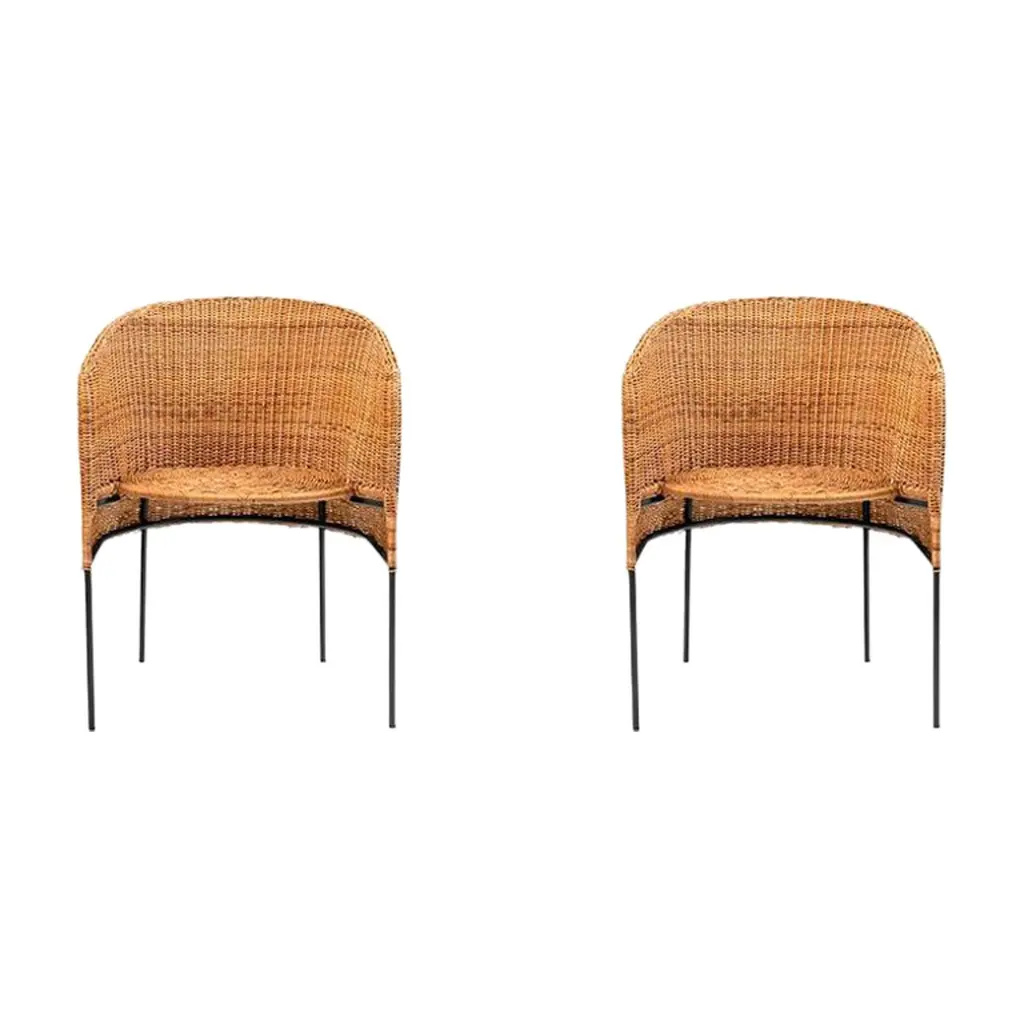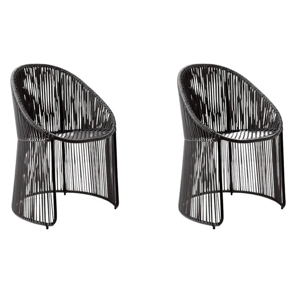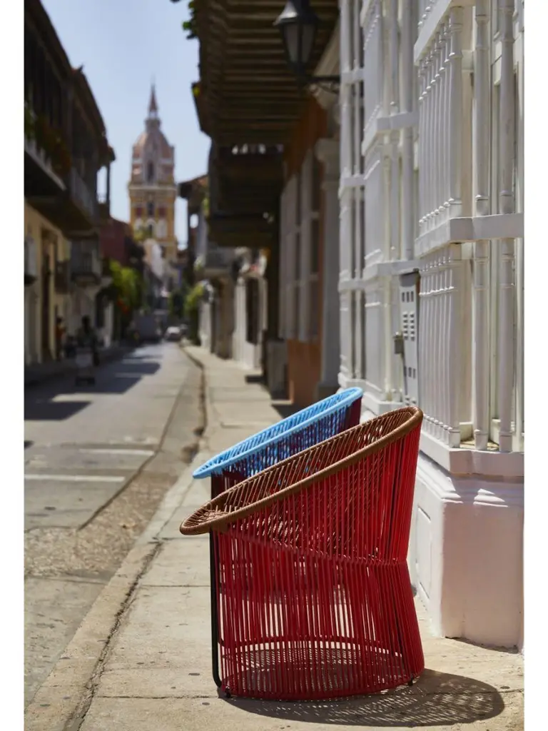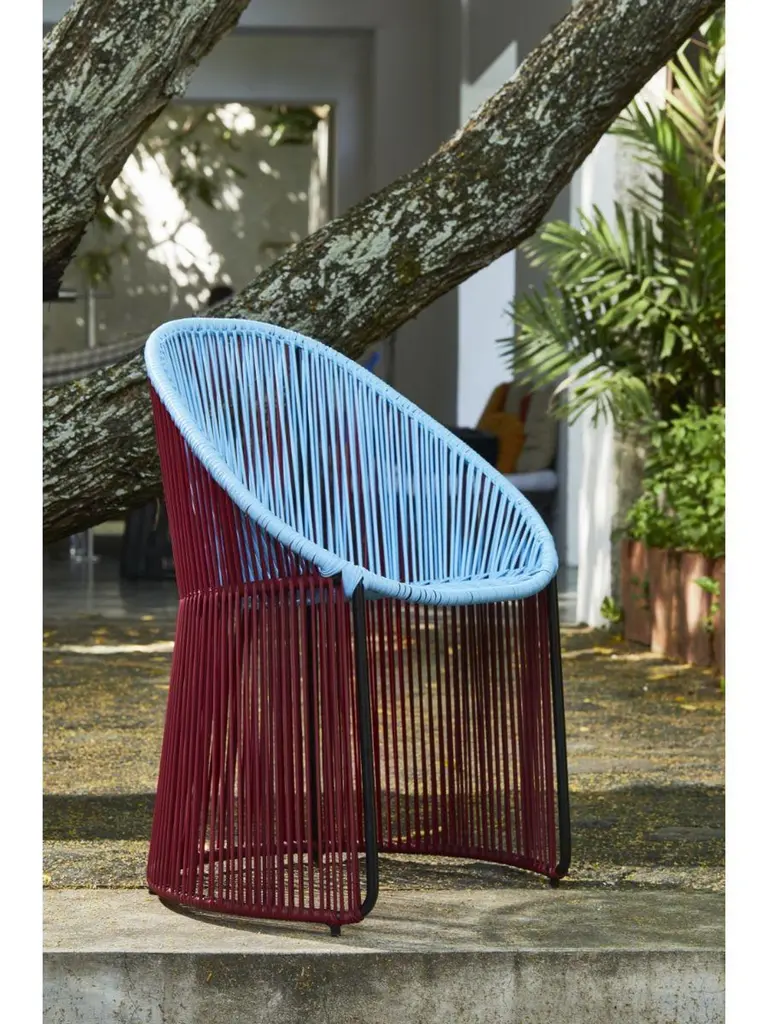 Set of 2 Coral / caramel cartagenas dining chair by Sebastian HerknerMaterials: PVC strings. Galvanized and powder-coated tubular steel frameTechnique: made from recycled plastic. Weaved by local craftspeople in Colombia. Dimensions: W 60.2 x D 53.8 x H 84 cm.Available in colors: black / black / black, coral/ caramel brown/ black, purple/ pastel blue/ black, purple/ olive / black, lila/ honey/ black. The colors and shape of the Cartagenas dining chair are inspired by Sebastian Herkner’s visit to Colombia’s buzzing coastal city Cartagena de Indias. “Fishing pelicans, women selling fruit, cozy restaurants: Cartagena lures you in with its many facets and this collection also plays with perspectives”, describes Sebastian the collection. The elegant, curved chair can be used indoors and outdoors and comes either with a seat and back in contrasting colors or a monochrome version. The colored strings, made from recycled PVC, are woven by hand around the steel frame, using two different colors for the seat and back. The Colombian craftspeople, based in Bogota, use an especially intricate weaving technique to create a neat contrast. It takes them three days to complete one chair.German designer Sebastian Herkner is a long-term collaborator of Ames and has visited Colombia multiple times to experience the country’s cities, nature and people first hand. He also visited many of the ateliers that Ames has partnered with to learn about the unique traditional crafts of Colombia's regions. A sought-after contemporary designer and recipient of many industry awards, he has worked with many international design brands, creating intriguing pieces that showcase his intuition for interesting material, color, and texture combinations