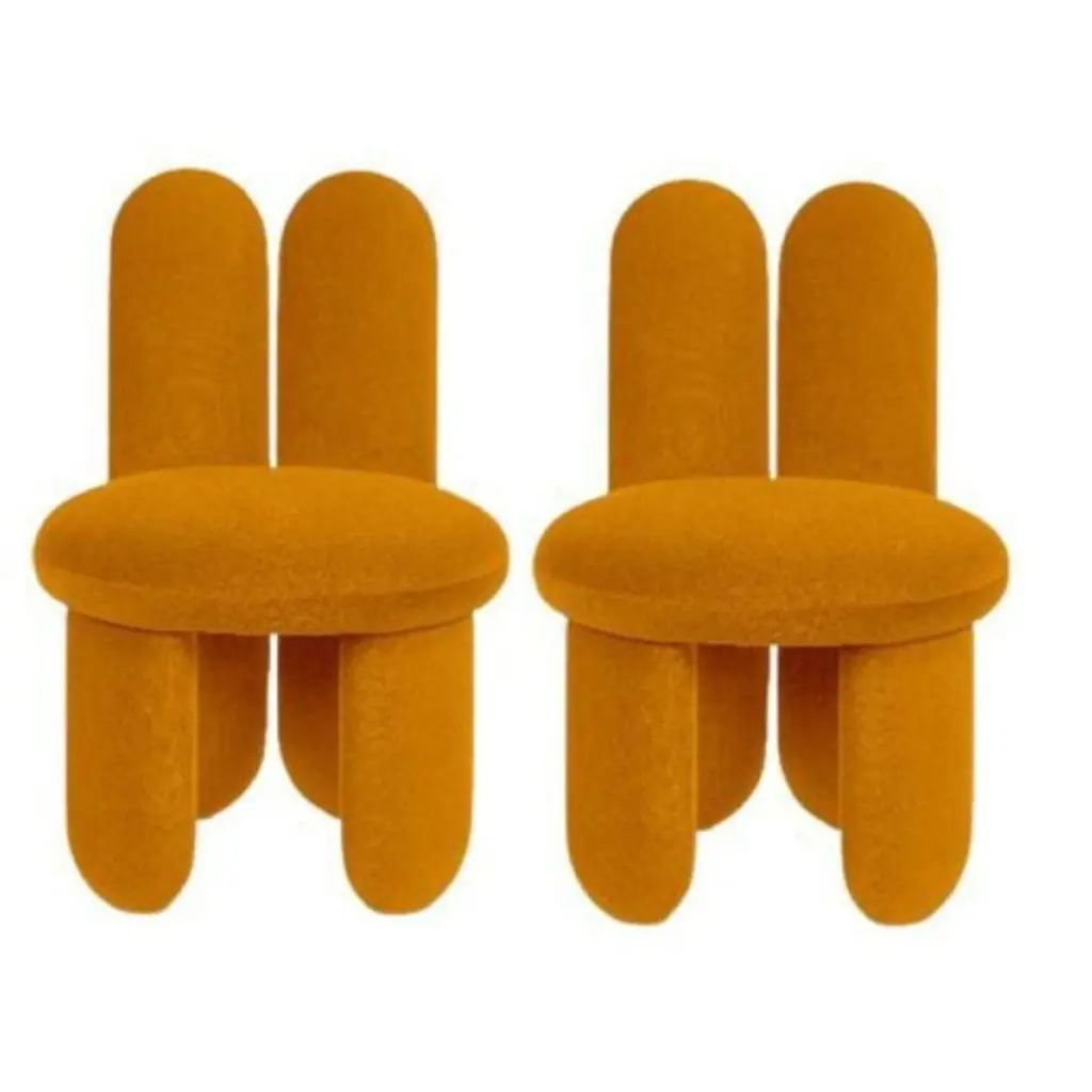 Set of 2 glazy chairs, gentle 443 by Royal Stranger.Dimensions: W 58 D 58 H 85 cm SH 50 SD 46 cm.Materials: Upholstery.Also available: upholstery in all Royal Stranger’s fabric collection, & COM (Client’s Own Material). Base available lacquered in all NCS/RAL colors, or in gold, copper and silver leaf, with glossy or matte finish.Step into a world of eye candy furniture with Glazy Chair. There is a groovy feeling to the rounded lines defining its round seat, and biscuit-shaped backrest and legs. An irresistible furniture piece where velvety upholstery playfully meets a glazed back finishing. Glazy Chair is the icing on the cake of your interior designs.Royal Stranger is an exclusive furniture brand determined to bring you the best unique pieces of art and design.Fusing design, art, and the best craftsmanship, they strive to deliver the best state of handmade art furniture. The design team works every day to create meaningful products that represent values such as passion, function, aesthetics, and know-how. Values that are meant to represent Royal Stranger’s DNA. This dedication is present at all stages of production and the combination of craftsmanship and innovative design contributes toour final purpose: To produce certified high-quality products, made with passion and expertise and using royal materials such as gold leaves, rich woods, and high-quality lacquers.It was in 2013, as architects, that Sofia Santos & Rui Santos started to push the boundaries of innovation in several retail design concepts for some of the best stores in Portugal. This resolution has always been present in their work, and that’s how the brand was born.