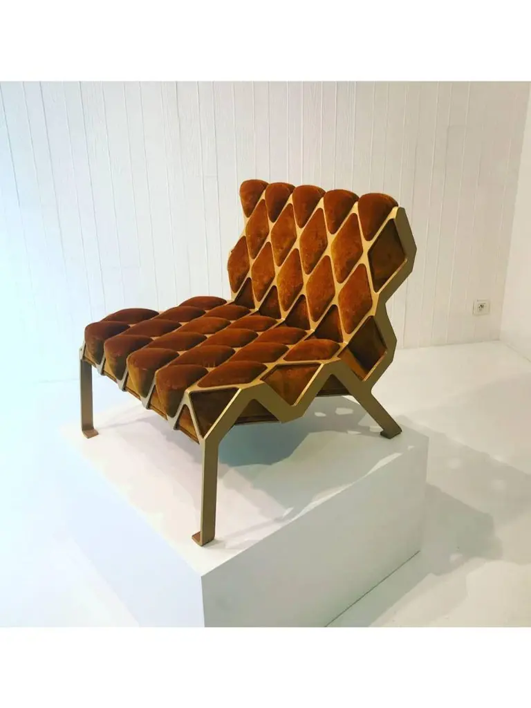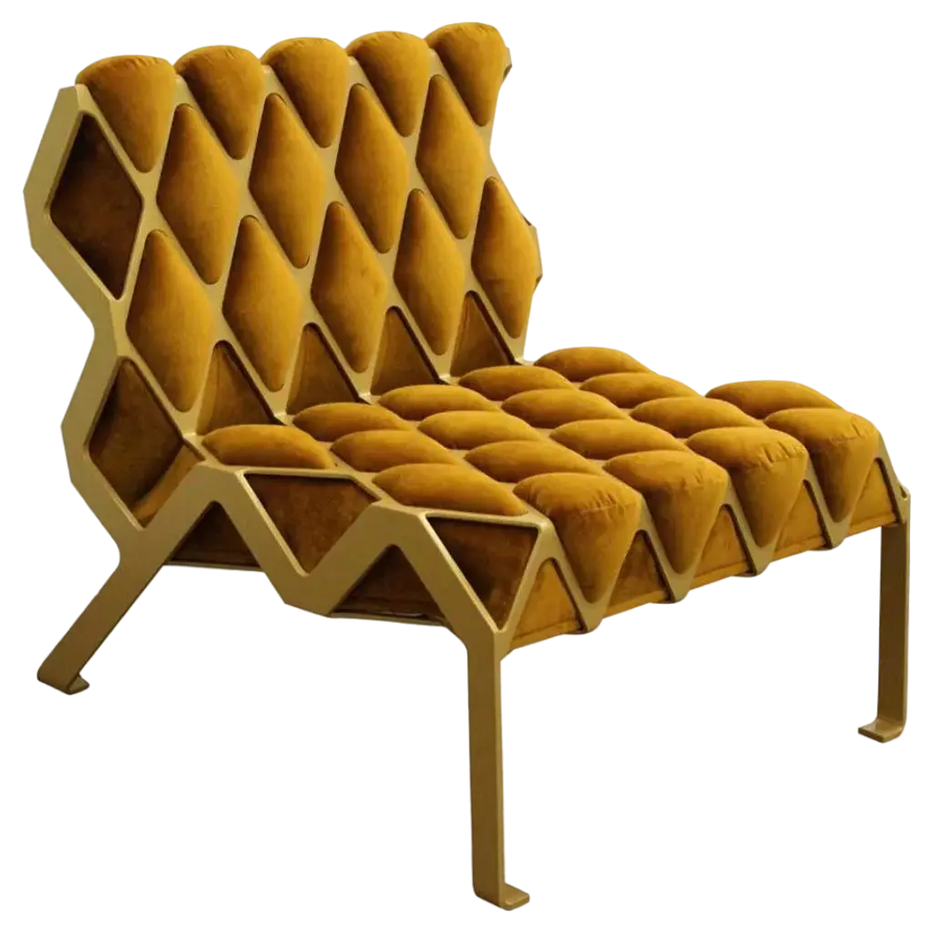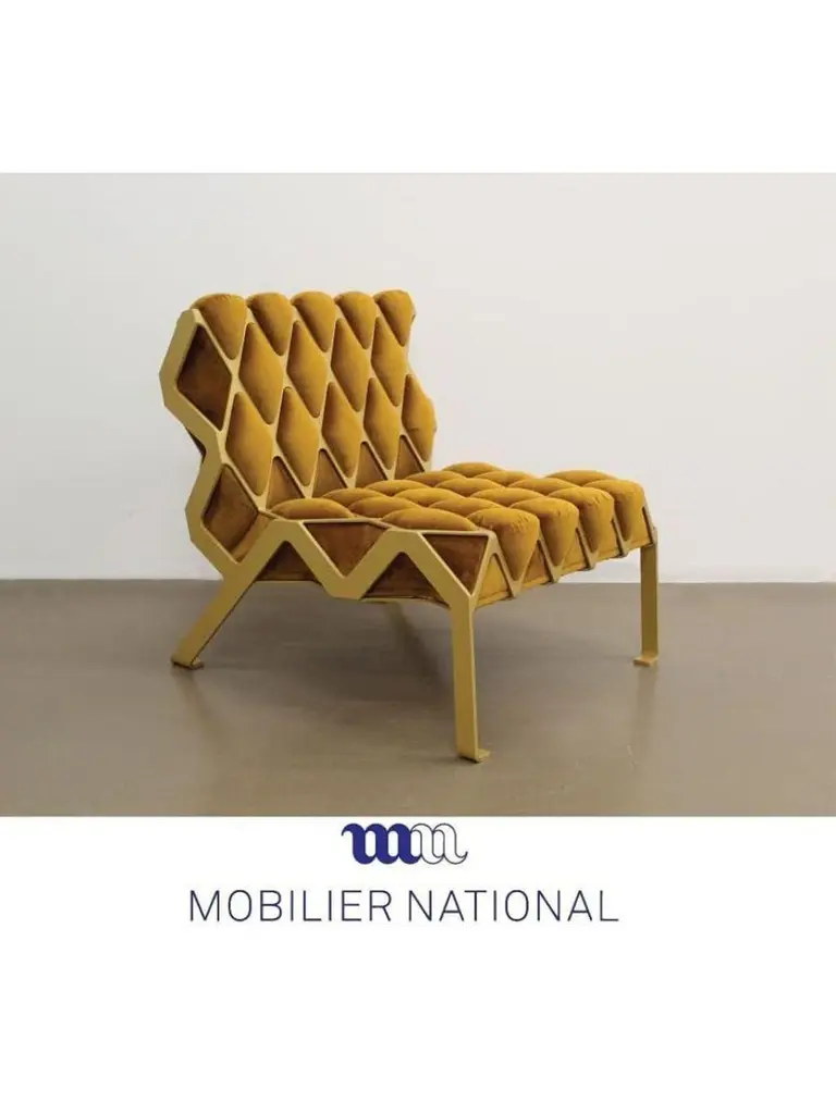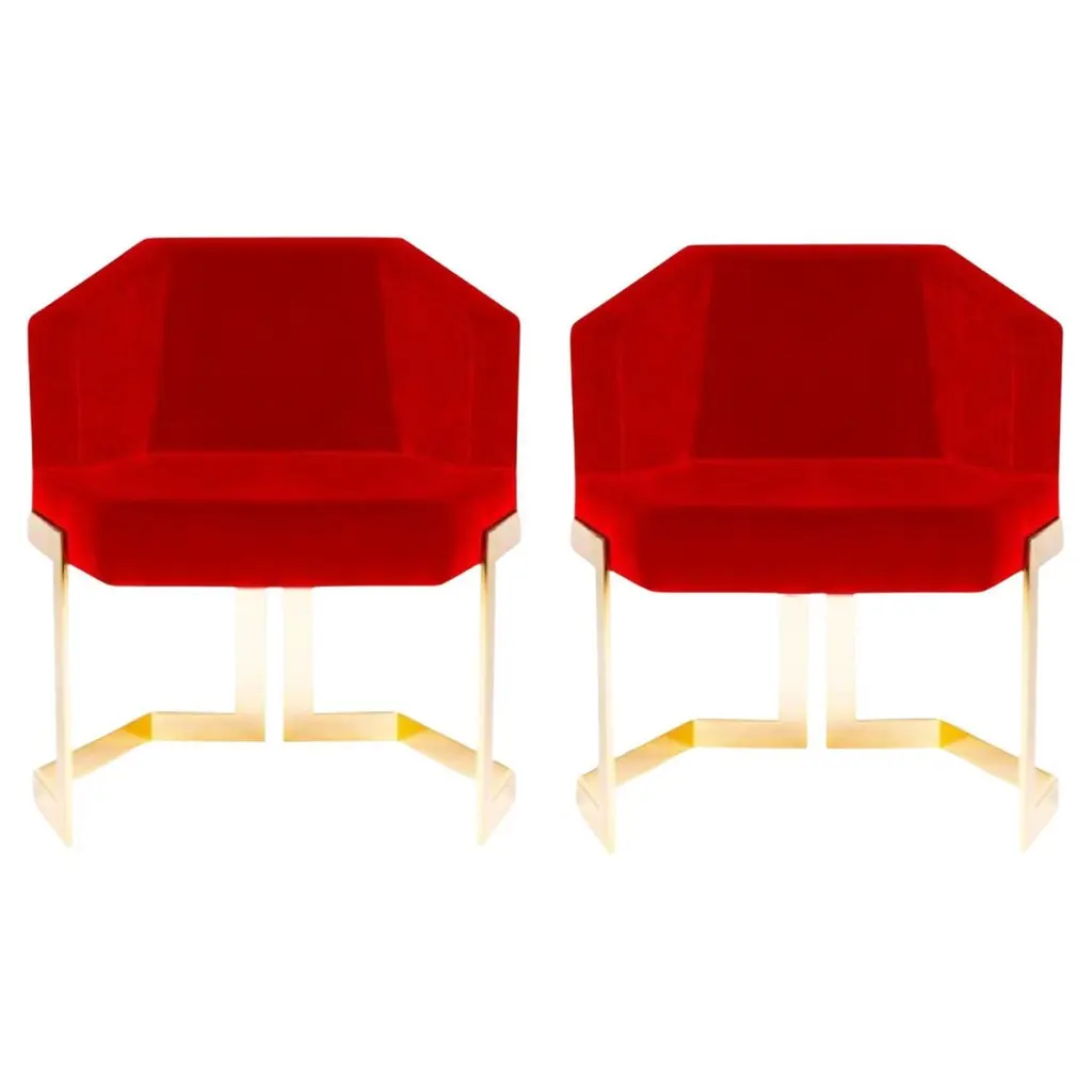 Set of 2 gold matrice chairs by Plumbum Dimensions: 25.60" x 25.60" x H 33.47"Materials: Gold powder-coated steel, velvet.Also available in other colors and sizes. Matrice's side chair is a steel corset compressing a velvet fleece, an organic, carnal form, compressed by a wire mesh. The interaction of two antagonistic materials reminds us of the poetry of blown glass, the bodice on the waist, the imprint left on the body by the wicker chairs. This chair in gold has been selected in Mai 2020 by the French Mobilier National to join its own collection to decorate embassies and ministries.We tried to give the seat a feeling of comfort, both visually and in its use. The iconic Chesterfield sofa quickly became a reference to be summoned. Matrice is a reinterpretation, a sensitive statement of its imprint: the upholstery here is turned over like a glove, revealing the wire mesh structure. The latter forms a corset compressing the softness of the seat and backrest to give it an organic geometry.The handmade Matrice joins the French National Furniture collection in May 2020 to decorate embassies and ministries.At a time when we are forced to slow down, crafts appear as a way forward, where we create less but better. This trend is cultivated by Plumbum with an emphasis on pieces with a high density of soul, poetic, high-quality craftsmanship, and noble materials. By inspiring and using the wealth of heritage and local craftsmanship, Plumbum designs original pieces in innovative materials, from furniture to objects, in collaboration with contemporary designers.Art of living and art of doing together to offer customizable numbered signed collections and bespoke pieces between territorial heritage and delicacy of styles.Our carpentry & granite terrazzo workshops based near Toulouse are complemented by a solid network of South of France craftsmen with multiple skills to meet your needs while maintaining a single contact (upholstery, EPVart foundry, locksmithing, ...).
