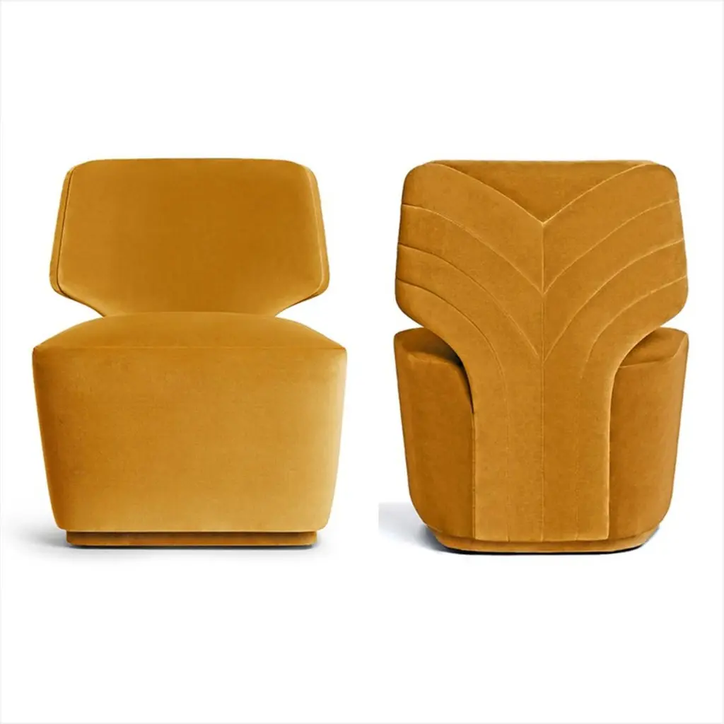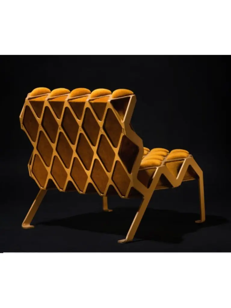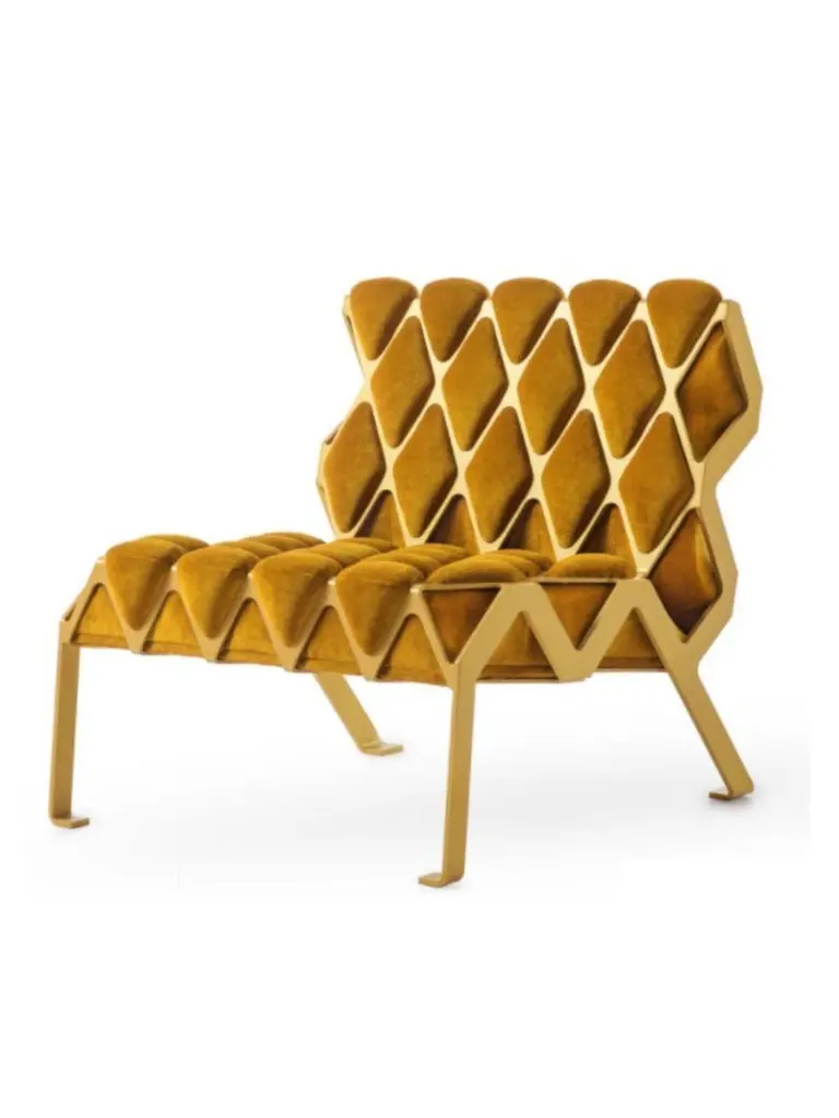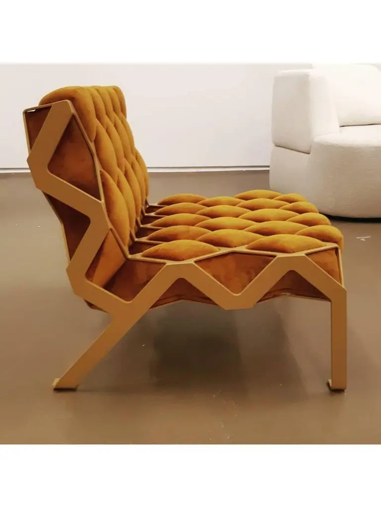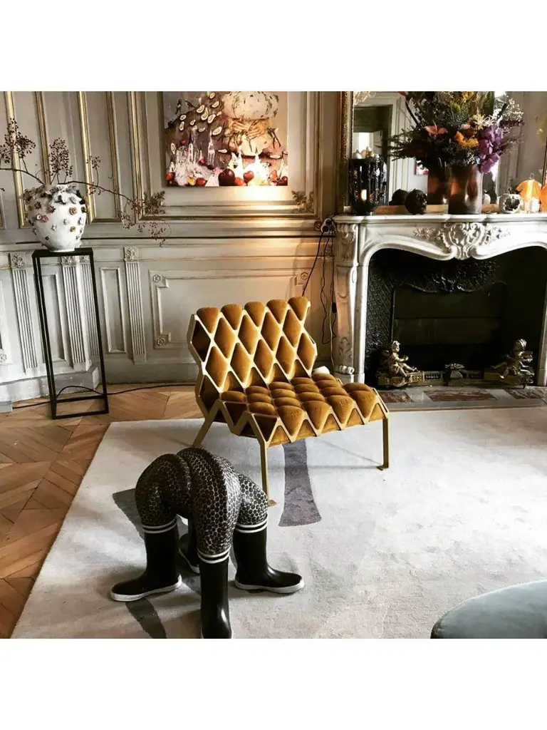 Set of 2 gold matrice chairs by Plumbum Dimensions: 25.60" x 25.60" x H 33.47"Materials: Gold powder-coated steel, velvet.Also available in other colors and sizes. Matrice's side chair is a steel corset compressing a velvet fleece, an organic, carnal form, compressed by a wire mesh. The interaction of two antagonistic materials reminds us of the poetry of blown glass, the bodice on the waist, the imprint left on the body by the wicker chairs. This chair in gold has been selected in Mai 2020 by the French Mobilier National to join its own collection to decorate embassies and ministries.We tried to give the seat a feeling of comfort, both visually and in its use. The iconic Chesterfield sofa quickly became a reference to be summoned. Matrice is a reinterpretation, a sensitive statement of its imprint: the upholstery here is turned over like a glove, revealing the wire mesh structure. The latter forms a corset compressing the softness of the seat and backrest to give it an organic geometry.The handmade Matrice joins the French National Furniture collection in May 2020 to decorate embassies and ministries.At a time when we are forced to slow down, crafts appear as a way forward, where we create less but better. This trend is cultivated by Plumbum with an emphasis on pieces with a high density of soul, poetic, high-quality craftsmanship, and noble materials. By inspiring and using the wealth of heritage and local craftsmanship, Plumbum designs original pieces in innovative materials, from furniture to objects, in collaboration with contemporary designers.Art of living and art of doing together to offer customizable numbered signed collections and bespoke pieces between territorial heritage and delicacy of styles.Our carpentry & granite terrazzo workshops based near Toulouse are complemented by a solid network of South of France craftsmen with multiple skills to meet your needs while maintaining a single contact (upholstery, EPVart foundry, locksmithing, ...).