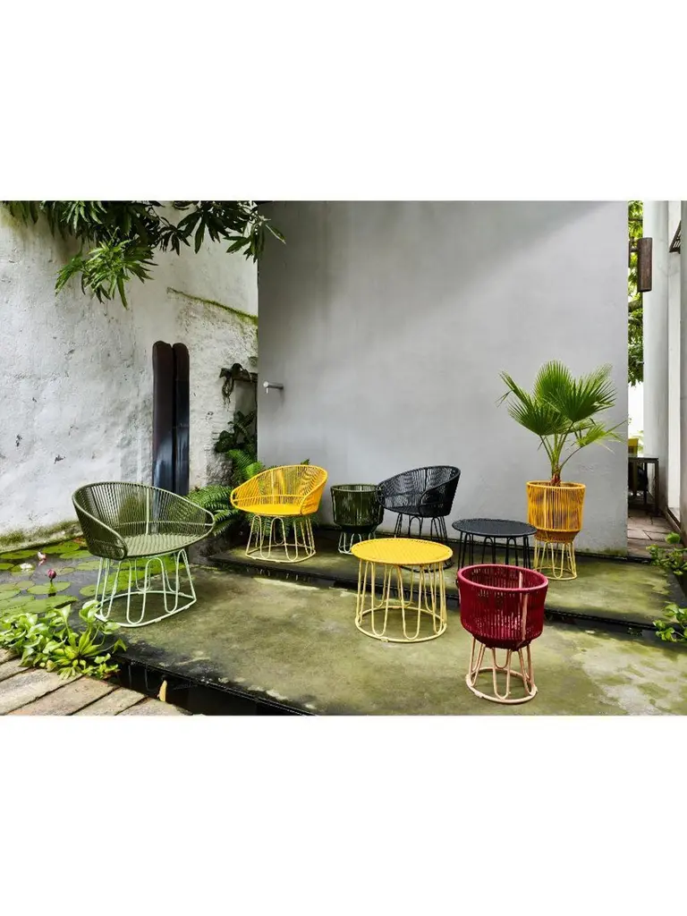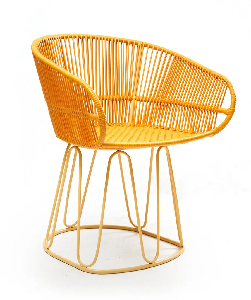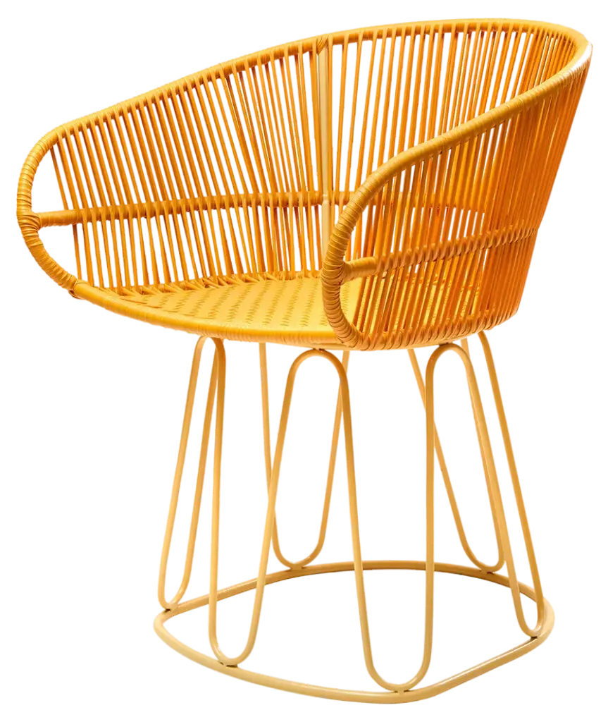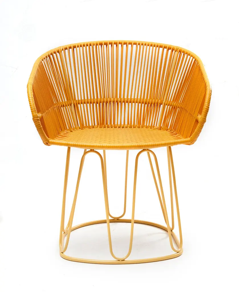 Set of 2 honey circo dining chair by Sebastian Herkner.Materials: Galvanized and powder-coated tubular steel. PVC strings.Technique: Made from recycled plastic. Weaved by local craftspeople in Colombia. Dimensions: W 61.5 x D 56.5 x H 77.5 cm Available in colors: olive - menta, honey - sand, purple - carne, black matt - black. Featuring gentle curves and intricate webbing, the Circo Dining Chair adds a touch of colorful elegance to indoor and outdoor spaces. A design by Sebastian Herkner, the comfortable and lightweight chair captures Colombia's vibrancy and spirit with its intriguing color contrast of webbing and steel frame. Additional seat pads covered with premium fabrics by Nya Nordiska, suitable for indoor use or outdoor use, are available upon request.Each chair is made in Santa Marta, a city on the Caribbean coast of Colombia, by local craftspeople. They weave the PVC strings, which are made from recycled plastic, around a powder-coated tubular steel frame. The weaving technique the artesanos and artesanas use are called Momposino, a traditional method known for intricate patterns. Just the preparation of all the materials takes 20 days, while the production of each chair takes two days.German designer Sebastian Herkner is a long-term collaborator of Ames and has visited Colombia multiple times to experience the country’s cities, nature and people first hand. He also visited many of the ateliers that Ames has partnered with to learn about the unique traditional crafts of Colombia's regions. A sought-after contemporary designer and recipient of many industry awards, he has worked with many international design brands, creating intriguing pieces that showcase his intuition for interesting material, color, and texture combinations.