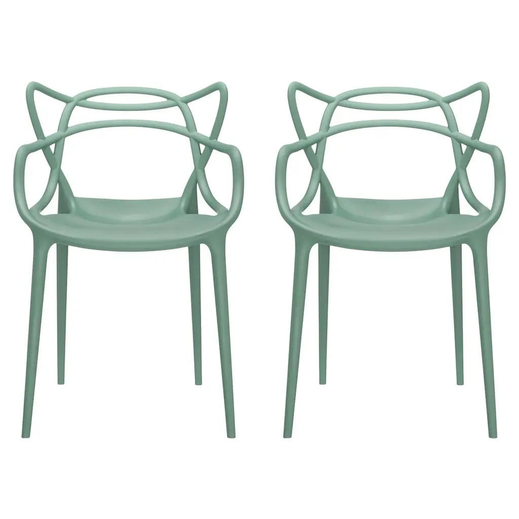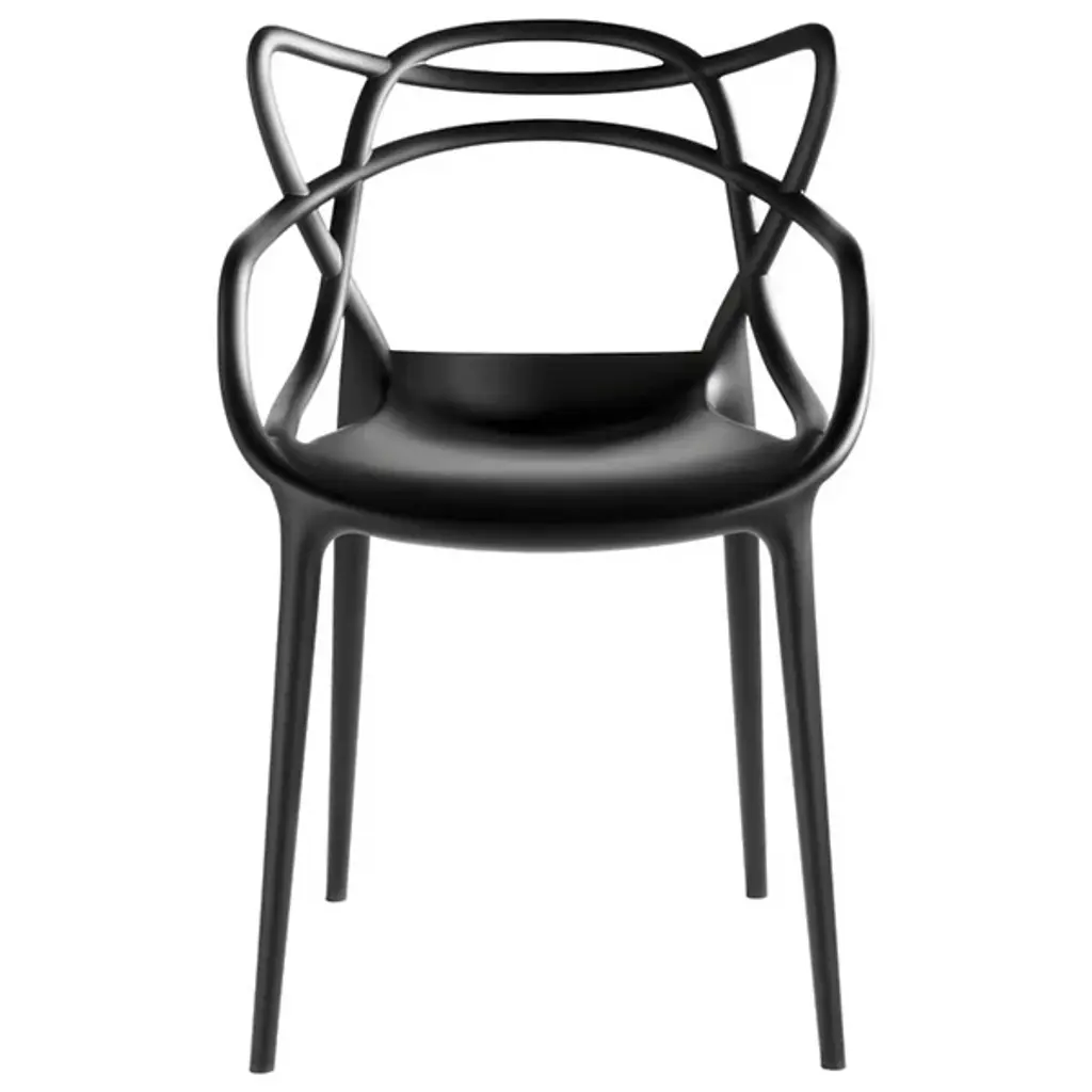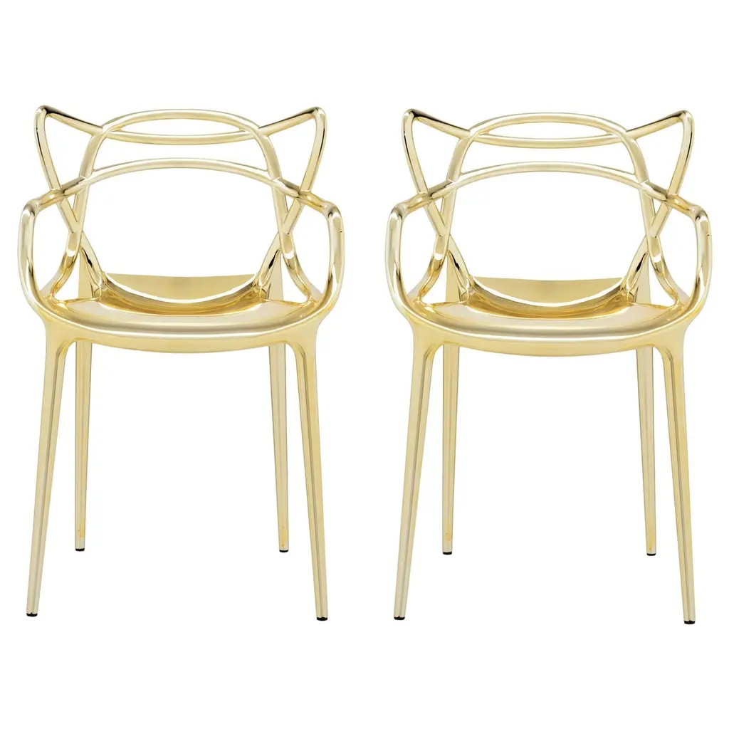 The Masters chair is a powerful tribute to three symbolic chairs, re-read and re-interpreted by the creative genius of Starck. The unmistakable silhouettes of the Series 7 by Arne Jacobsen, the Tulip Armchair by Eero Saarinen and the Eiffel chair by Charles Eames are interwoven into a sinuous hybrid giving life to a fusion of original and engaging styles. The Masters is light, practical and stackable and can be used outdoors as well. To give the Masters an even more precious, exclusive and sophisticated look it is given new and surprising metallic finishes. The Masters chair was honoured with the prestigious 2010 Good Design Award presented by the Chicago Athenaeum - Museum of Architecture and Design and the 2013 Red Dot Design Award.