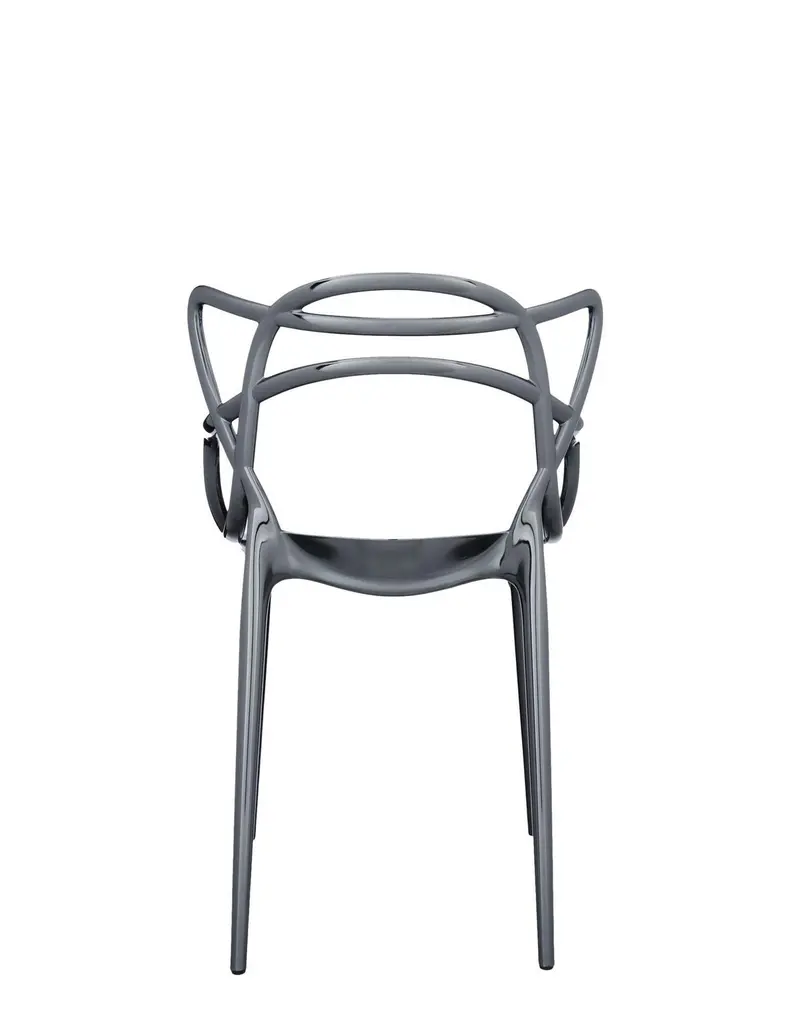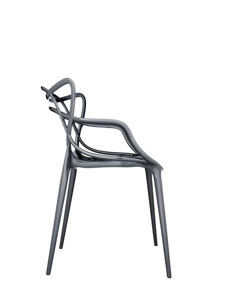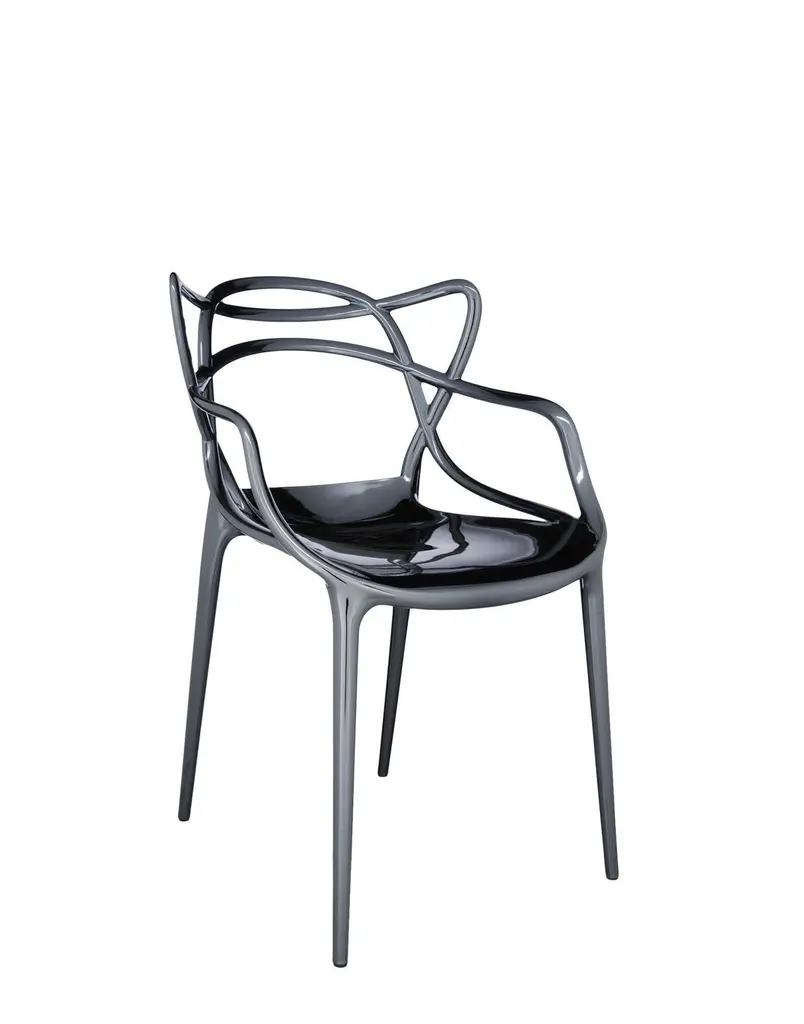 The Masters chair is a powerful tribute to three symbolic chairs, re-read and re-interpreted by the creative genius of Starck. The unmistakable silhouettes of the Series 7 by Arne Jacobsen, the Tulip armchair by Eero Saarinen and the Eiffel chair by Charles Eames are interwoven into a sinuous hybrid giving life to a fusion of original and engaging styles. The Masters is light, practical and stackable and can be used outdoors as well. To give the Masters an even more precious, exclusive and sophisticated look it is given new and surprising metallic finishes. The Masters chair was honoured with the prestigious 2010 Good Design Award presented by the Chicago Athenaeum - Museum of Architecture and Design and the 2013 Red Dot Design Award.
