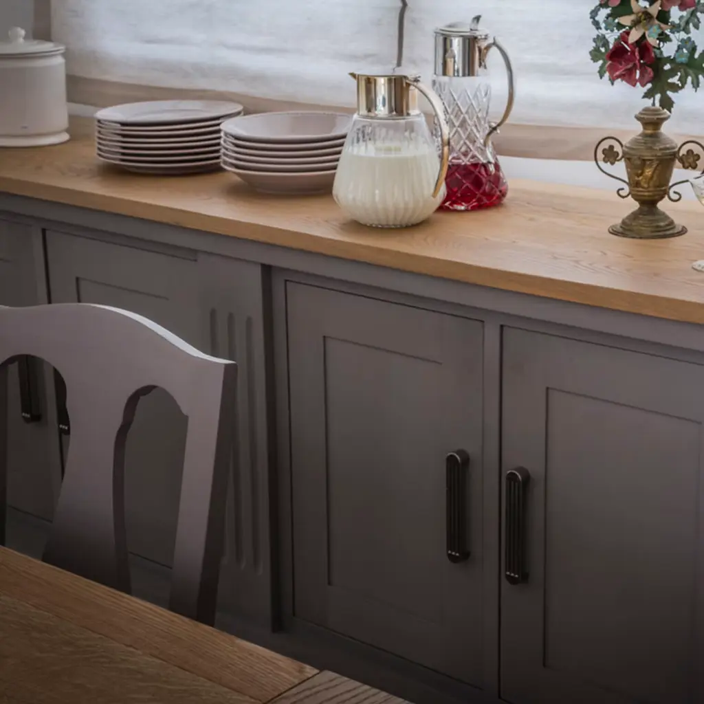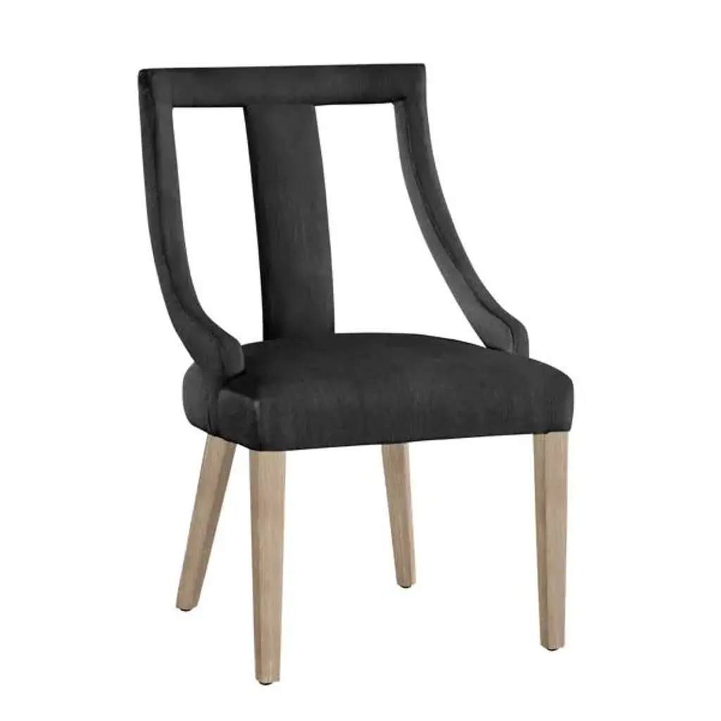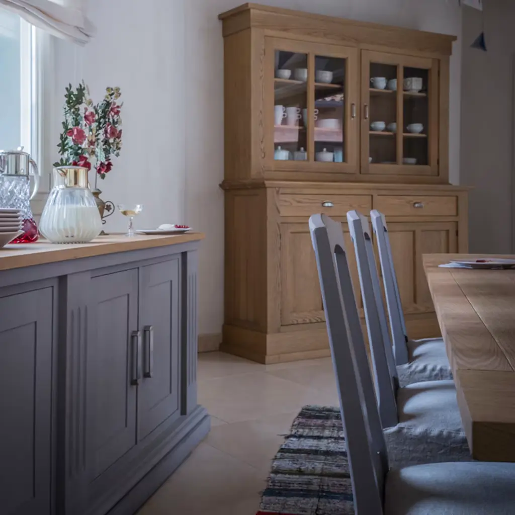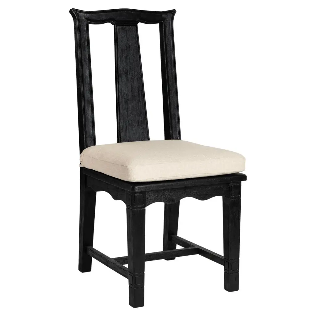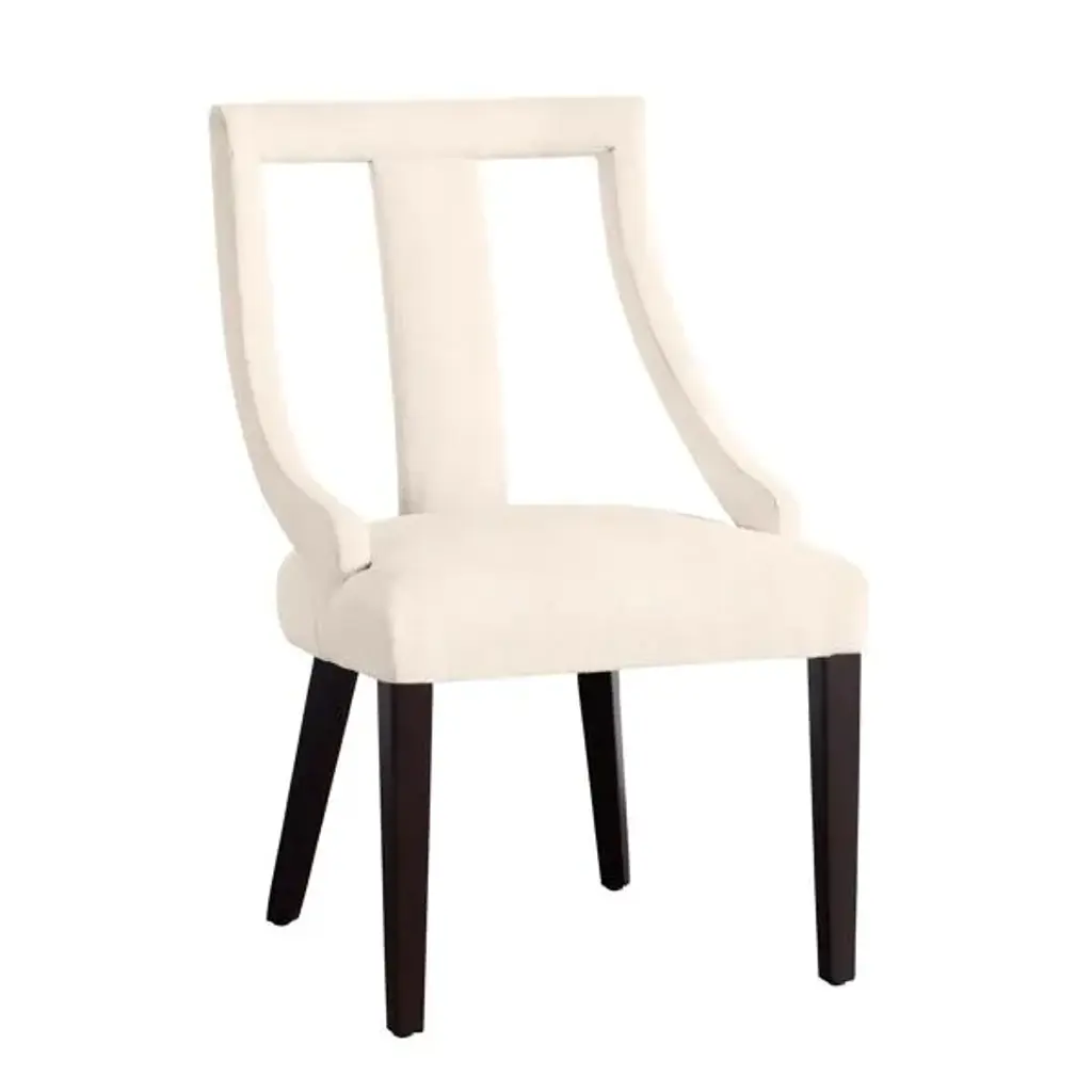 Reinterpreting in a modern and charming way the elegant style of the end of the 19th century, this set of 4 chairs will make an elegant statement in a traditional or classic decor. The structure is made of beechwood with a hand-applied finish in a warm taupe hue. This color complements the untreated fabric of the upholstery covering the seat cushion. The saber-shaped back legs and the harp-like silhouette of the backrest's central decoration add character to this exquisite piece.