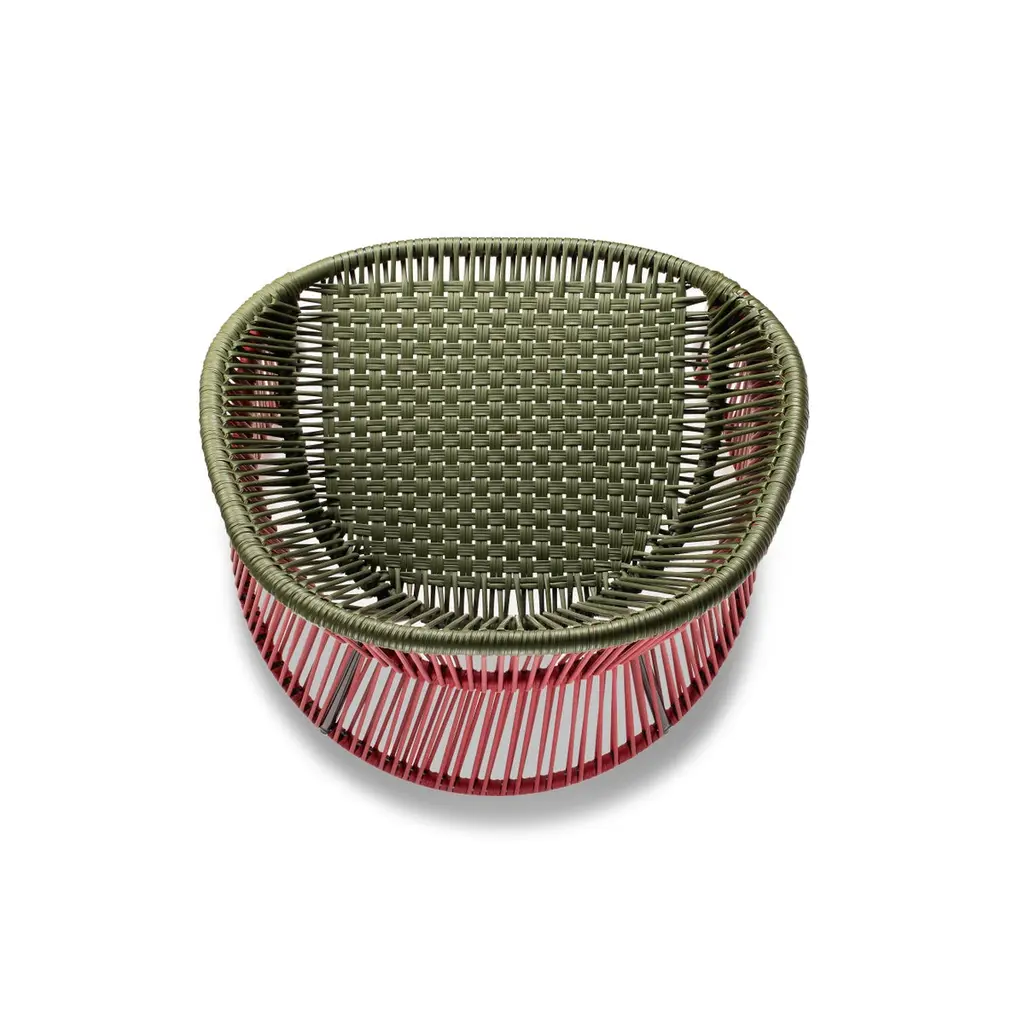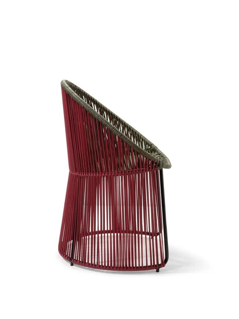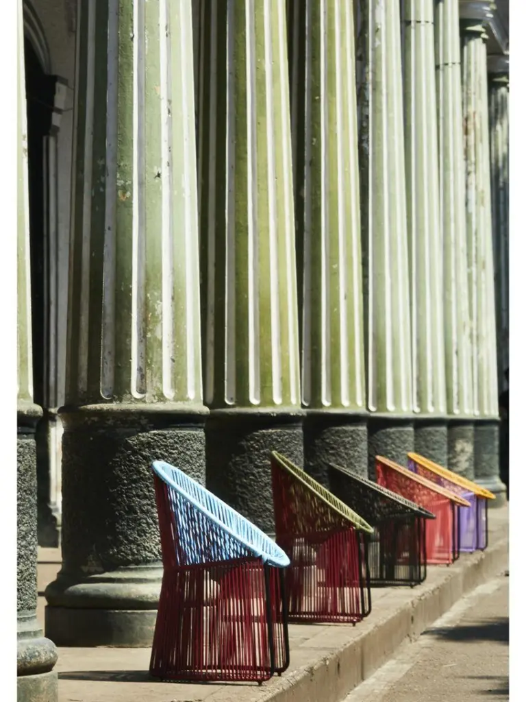 Set of 2 olive/purple Cartagenas dining chair by Sebastian Herkner.Materials: PVC strings. Galvanized and powder-coated tubular steel frameTechnique: made from recycled plastic. Weaved by local craftspeople in Colombia. Dimensions: W 60.2 x D 53.8 x H 84 cm Available in colors: black / black / black, coral/ caramel brown/ black, purple/ pastel blue/ black, purple/ olive / black, lila/ honey/ black.The colors and shape of the Cartagenas Dining Chair are inspired by Sebastian Herkner’s visit to Colombia’s buzzing coastal city Cartagena de Indias. “Fishing pelicans, women selling fruit, cozy restaurants: Cartagena lures you in with its many facets and this collection also plays with perspectives”, describes Sebastian the collection. The elegant, curved chair can be used indoors and outdoors and comes either with a seat and back in contrasting colors or a monochrome version. The colored strings, made from recycled PVC, are woven by hand around the steel frame, using two different colors for the seat and back. The Colombian craftspeople, based in Bogota, use an especially intricate weaving technique to create a neat contrast. It takes them three days to complete one chair.German designer Sebastian Herkner is a long-term collaborator of Ames and has visited Colombia multiple times to experience the country’s cities, nature and people first hand. He also visited many of the ateliers that Ames has partnered with to learn about the unique traditional crafts of Colombia's regions. A sought-after contemporary designer and recipient of many industry awards, he has worked with many international design brands, creating intriguing pieces that showcase his intuition for interesting material, color, and texture combinations.
