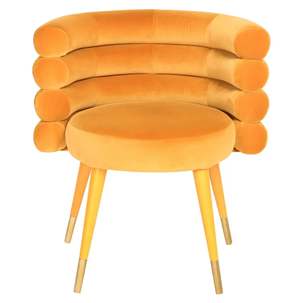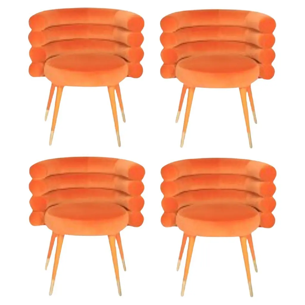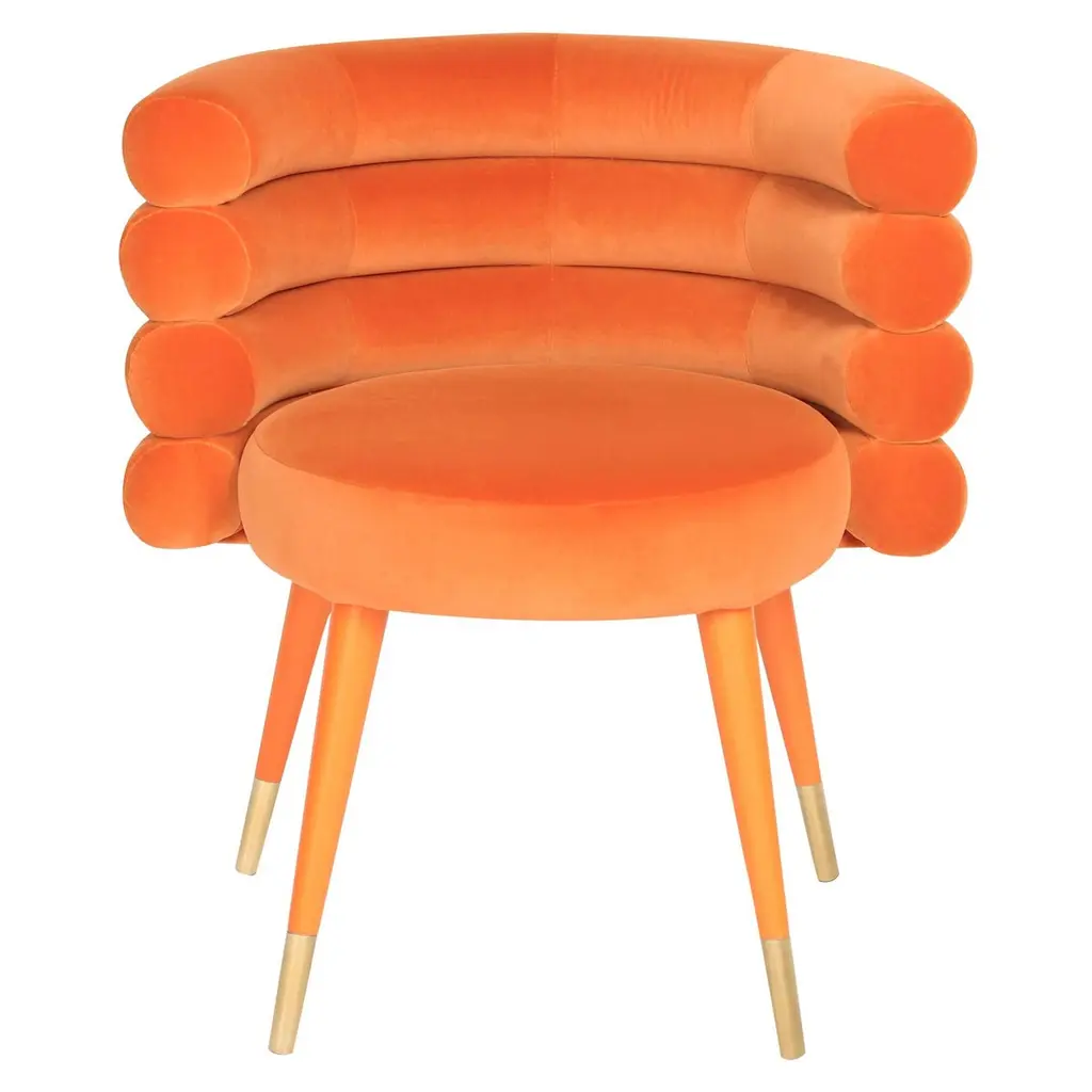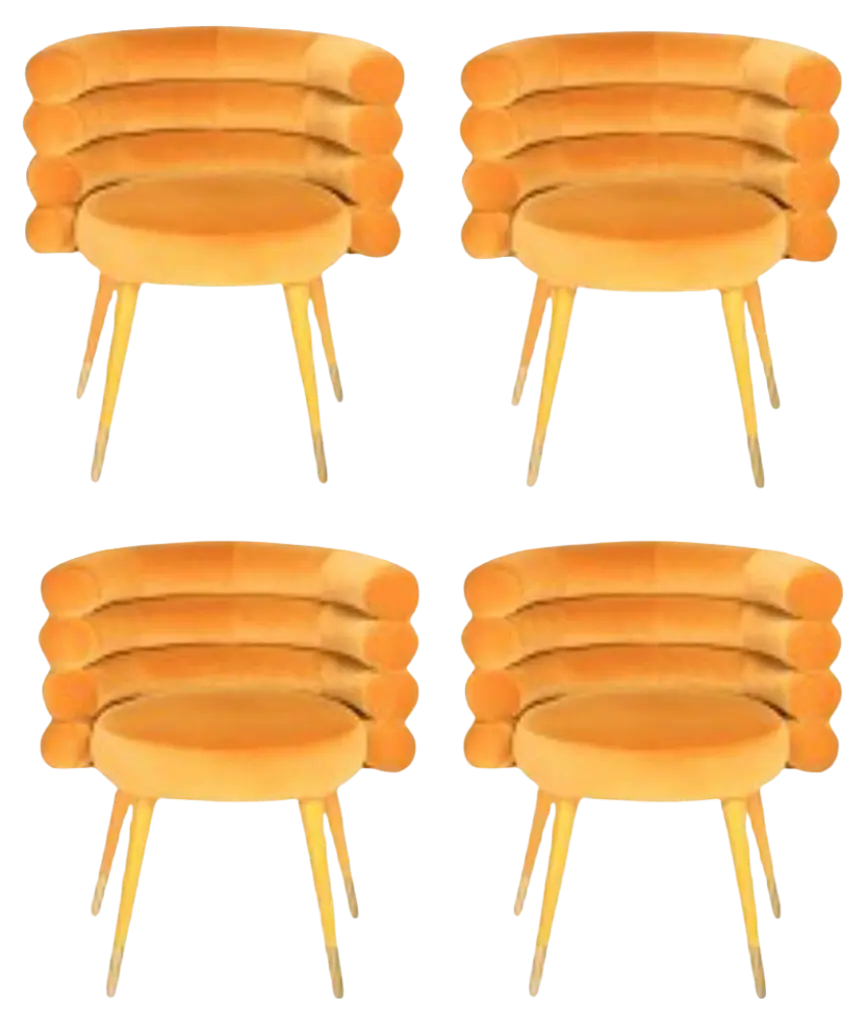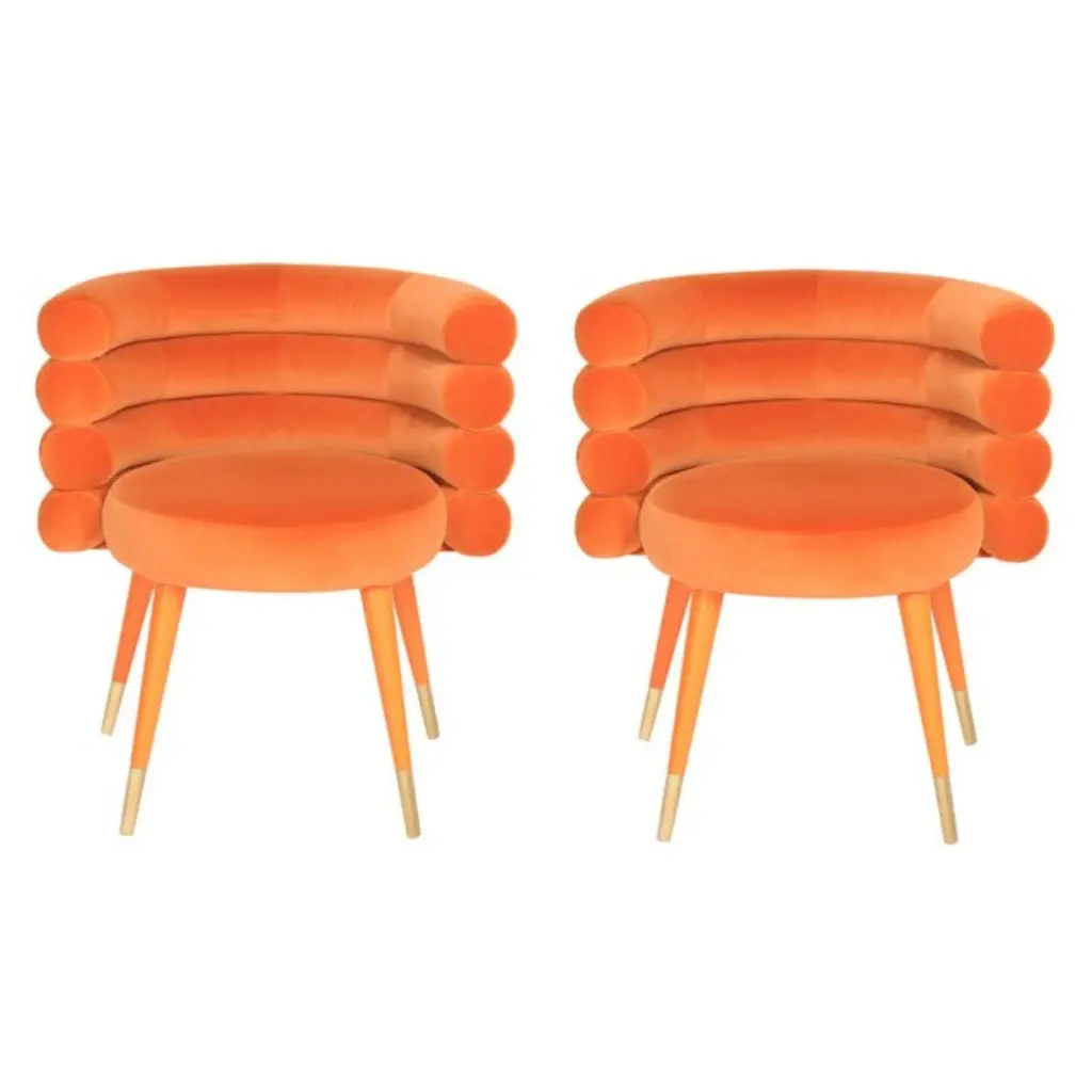 Set of 2 orange marshmallow dining chairs, Royal StrangerDimensions: 78 x 70 x 60 cmMaterials: velvet upholstery and brassAvailable in: mint green, light pink, royal green and royal redRoyal Stranger is an exclusive furniture brand determined to bring you the best unique pieces of art and design.Fusing design, art and the best craftsmanship, they strive to deliver the best state of the handmade art furniture. The design team works every day to create meaningful products that represent values such as passion, function, aesthetics and know-how. Values that are meant to represent Royal Stranger’s DNA. This dedication is present at all stages of production and the combination of craftsmanship and innovative design contributes toour final purpose: To produce certified high-quality products, made with passion and expertise and using royal materials such as gold leaf, rich woods and high quality lacquers.It was in 2013, as an architects, that Sofia Santos & Rui Santos started to push the boundaries of innovation in several retail design concepts for some of the best stores in Portugal. This will has always been present in their work, and that’s how the brand was born.