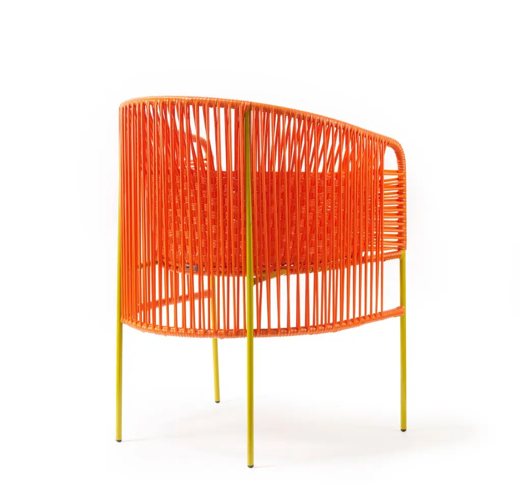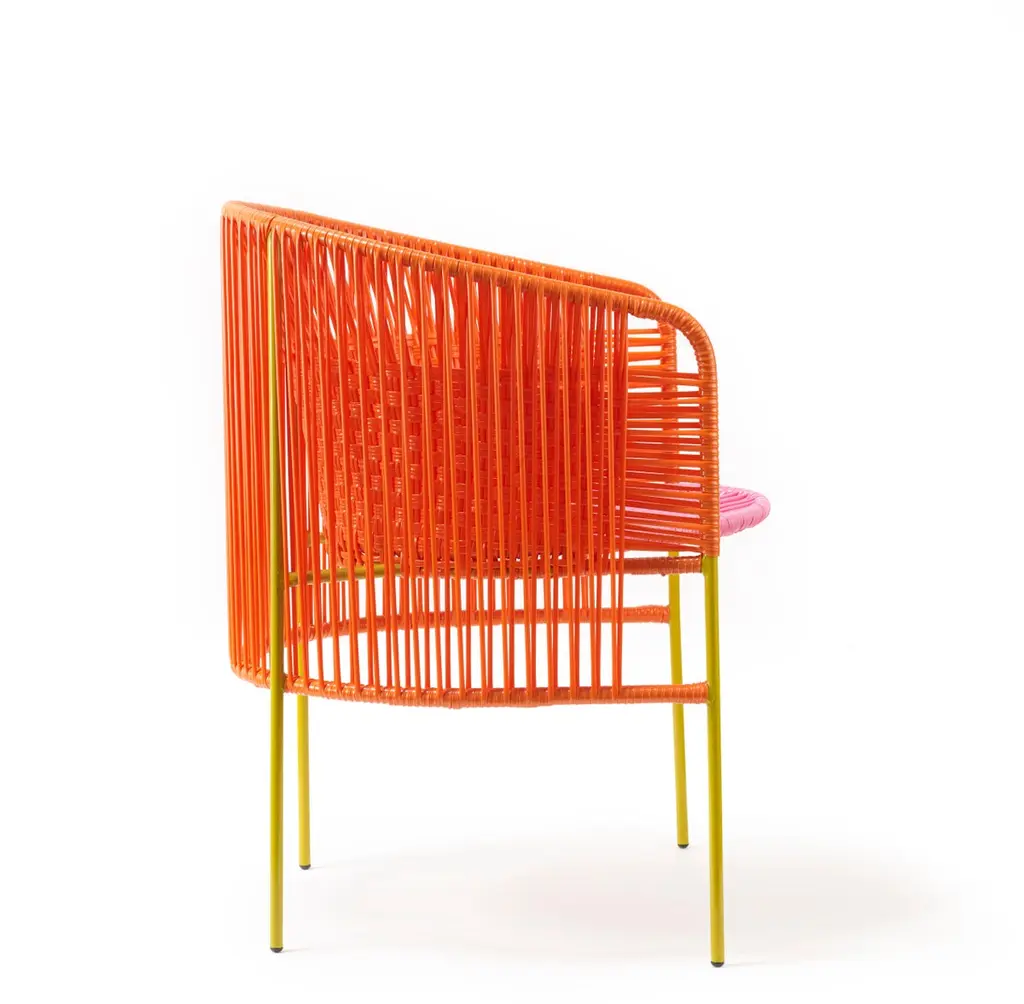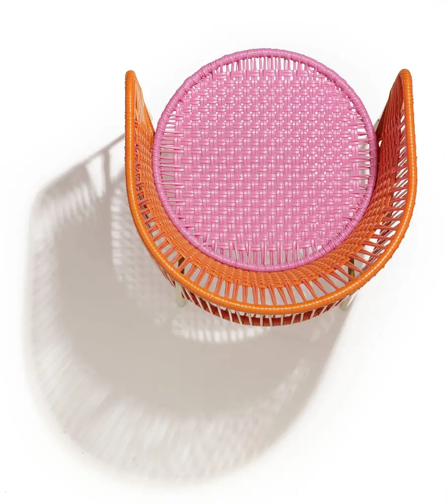 Set of 2 Orange rose caribe dining chair by Sebastian HerknerMaterials: Galvanized and powder-coated tubular steel. PVC strings are made from recycled plastic.Technique: Made from recycled plastic and weaved by local craftspeople in Colombia. Dimensions: W 55.3 x D 56 x H 75 cm Also available colors: blue/ mint/ black, mint/ green/ black, orange/ rose/ curry, green/ rose/ curry.The charming Caribe dining chair is a colorful design for seating arrangements inside and outdoors. It’s part of the Caribe collection, designed by Sebastian Herkner for Ames. The German designer visited Colombia together with Ames founder Ana Maria Calderon-Kayser and translated the vibrancy and spirit of the country’s people and traditions into joyful, modern furniture pieces defined by clean lines, strong colors, and the hand-woven webbing.Each chair is made in Santa Marta, a city on the Caribbean coast of Colombia, by local craftspeople. They weave the PVC strings, which are made from recycled plastic, around the steel frame. The weaving technique the artesanos and artesanas use are called Momposino, a traditional method known for intricate patterns. Just the preparation of all the materials takes ten days, while the production of each chair takes three days.German designer Sebastian Herkner is a long-term collaborator of Ames and has visited Colombia multiple times to experience the country’s cities, nature and people first hand. He also visited many of the ateliers that Ames has partnered with to learn about the unique traditional crafts of Colombia's regions. A sought-after contemporary designer and recipient of many industry awards, he has worked with many international design brands, creating intriguing pieces that showcase his intuition for interesting material, color, and texture combinations