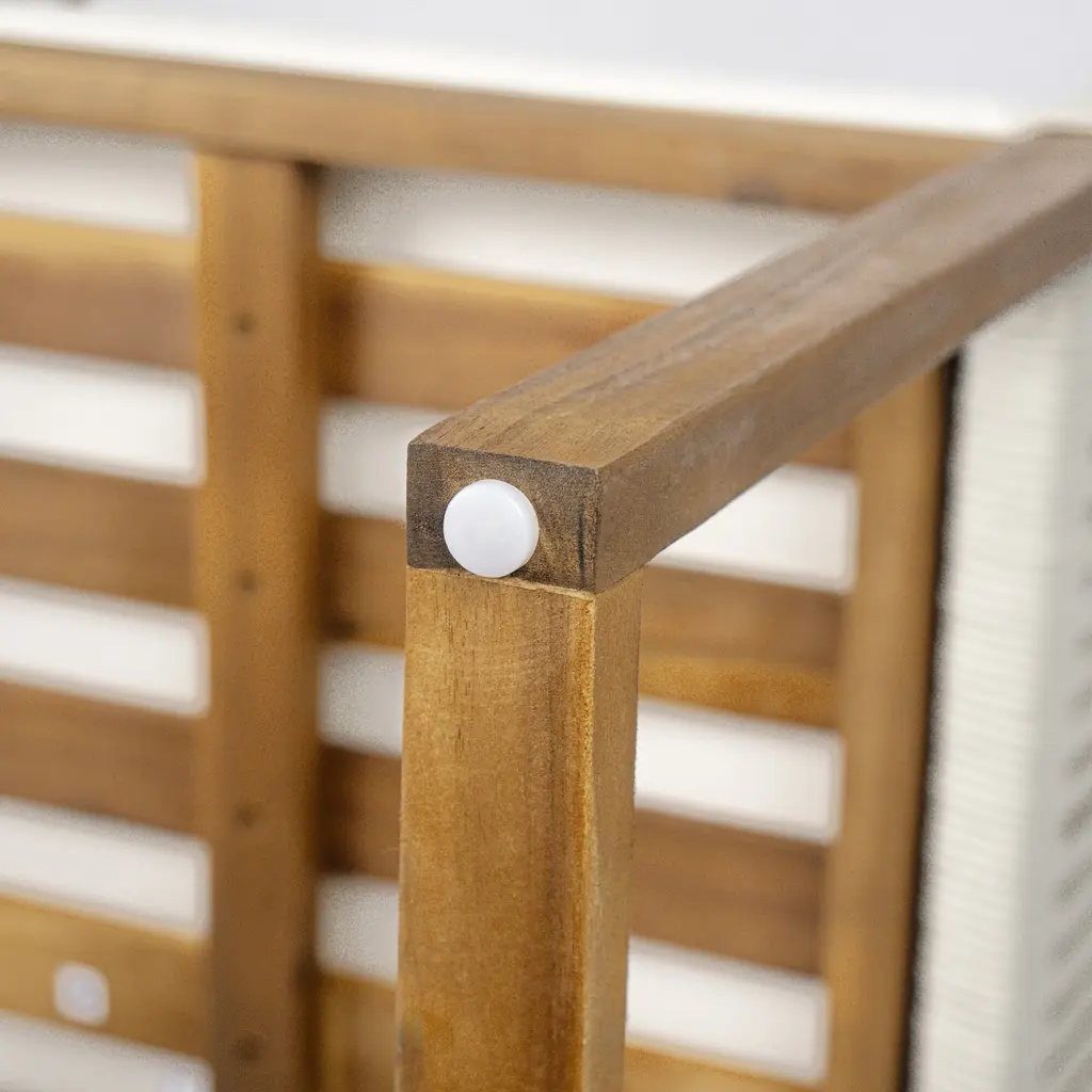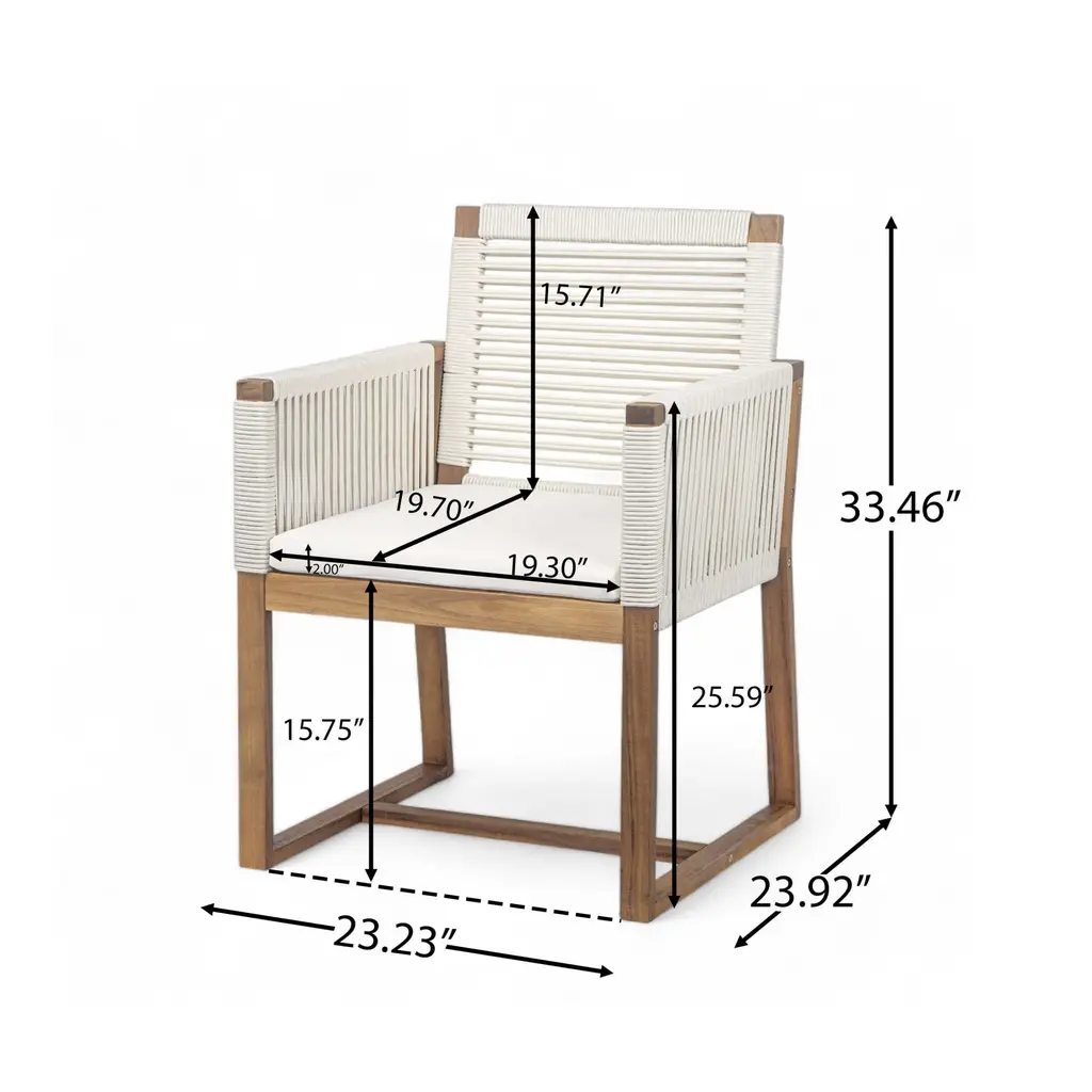 Durable Acacia Wood and Handwoven Rope: The Acacia Wood Frame of our Outdoor Woven Rope Chair, renowned for durability and weather resistance. Its hand-made woven rope design adds natural charm. With a weight capacity of 400 pounds, this chair comfortably accommodates most users, ensuring comfort and style in any outdoor space.Washable Polyester Covers: Keep your Outdoor Woven Rope Chair vibrant with washable polyester cushions. Each features a convenient zipper for easy cleaning—simply unzip, machine wash, and air dry. Enjoy luxurious lounging with 2-inch thick cushions available in three stylish colors to match any outdoor decor. Hand washing recommended for longer life.Foot Pad and Secure Fixing: Our Outdoor Woven Rope Chair comes with a foot pad that prevents scratches and adds stability to your floors, ensuring a safe and worry-free lounging experience. The chair is securely fixed with magic tape and straps, providing additional safety and peace of mind. And with a UV-resistant cushion cover, you can relax under the sun without worrying about fading or damage.Quick and Simple Setup: Assemble your Outdoor Woven Rope Chair in just 30 minutes with two people. Clear instructions ensure a seamless setup, allowing you to quickly enjoy your new stylish, comfortable, and durable chair. Transform your space into a tranquil outdoor retreat effortlessly. Order now for instant enjoyment and relaxation.Dimension and Notice: Overall Size: 23.23 x 23.92 x 33.46 inch (WxDxH) ; Seat Size: 19.3 x 19.7 inch (WxD); Seat Height: 15.75 inch; Back Height: 15.71 inch; Weight Capacity: 400 Pounds. Items may slightly differ from photo in terms of color due to the lighting or your monitor's display. For more size, please refer to size image.Overall Weight: 19.84 lbs/seatMaterial: Acacia Wood and RopePieces Included: 2 Chairs, Manual and Hardware