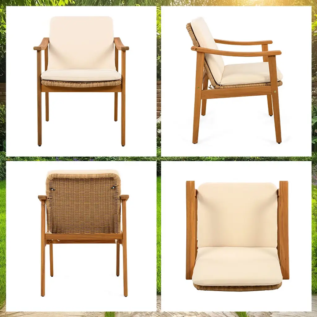 Set Of 2 Outdoor Wicker Dining Armchairs, Acacia Wood Frame In Teak Finish With Beige Waterproof Cushions, Garden Dining Set – Koiai