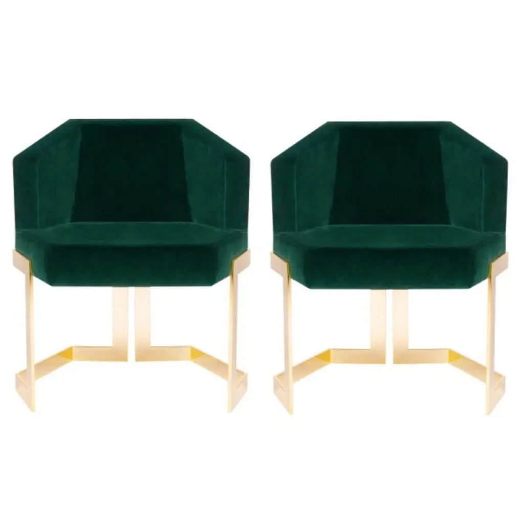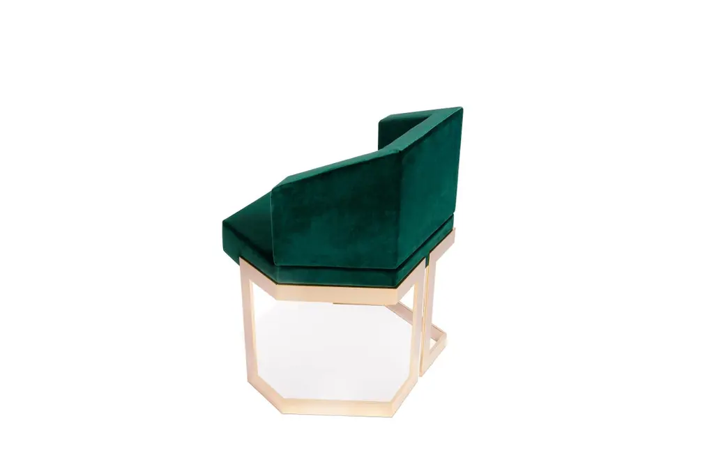 Set of 2 the hive dining chairs, Royal StrangerDimensions: 65.5 x 55 x 79 cmMaterials: Velvet. Legs polished brass.A chair with an extremely luxurious vision. The Hive chair, as the name implies, is strong and robust in nature, its hexagonal shape gives it a unique and clear design that is simple but careful and very attentive to detail.Royal Stranger is an exclusive furniture brand determined to bring you the best unique pieces of art and design.Fusing design, art and the best craftsmanship, they strive to deliver the best state of the handmade art furniture. The design team works every day to create meaningful products that represent values such as passion, function, aesthetics and know-how. Values that are meant to represent Royal Stranger’s DNA. This dedication is present at all stages of production and the combination of craftsmanship and innovative design contributes toour final purpose: to produce certified high-quality products, made with passion and expertise and using royal materials such as gold leaf, rich woods and high quality lacquers.It was in 2013, as an architects, that Sofia Santos & Rui Santos started to push the boundaries of innovation in several retail design concepts for some of the best stores in Portugal. This will has always been present in their work, and that’s how the brand was born.