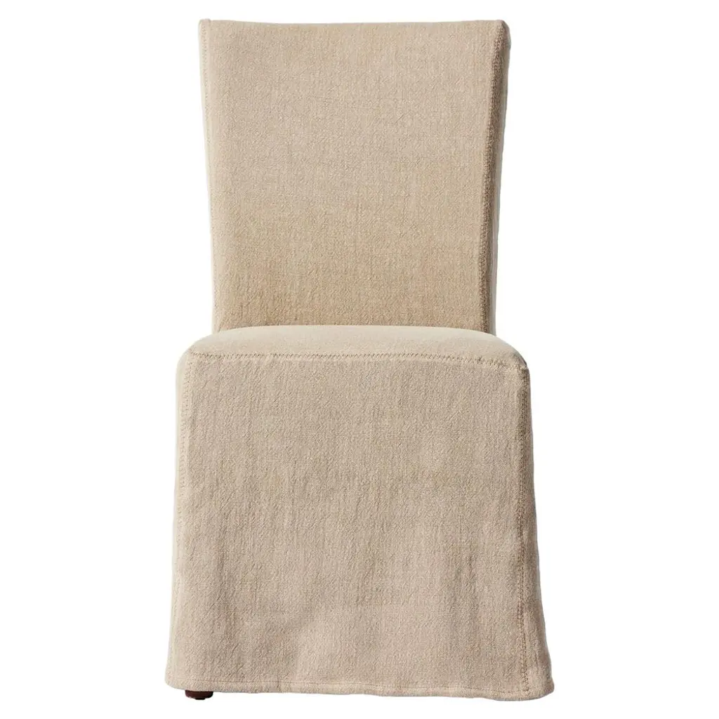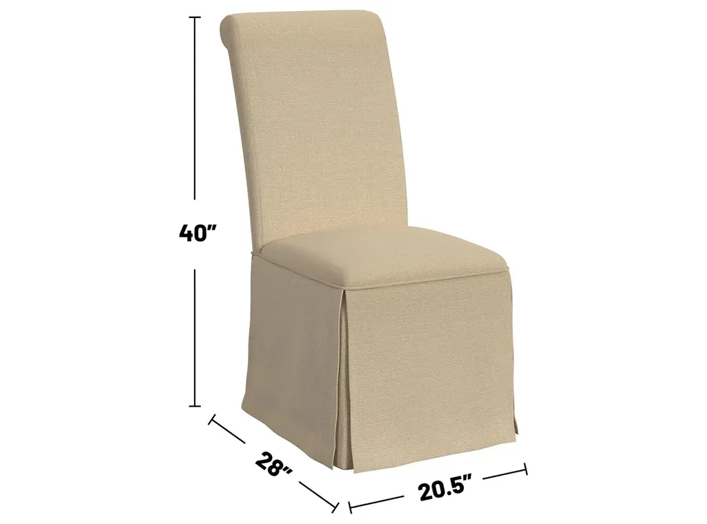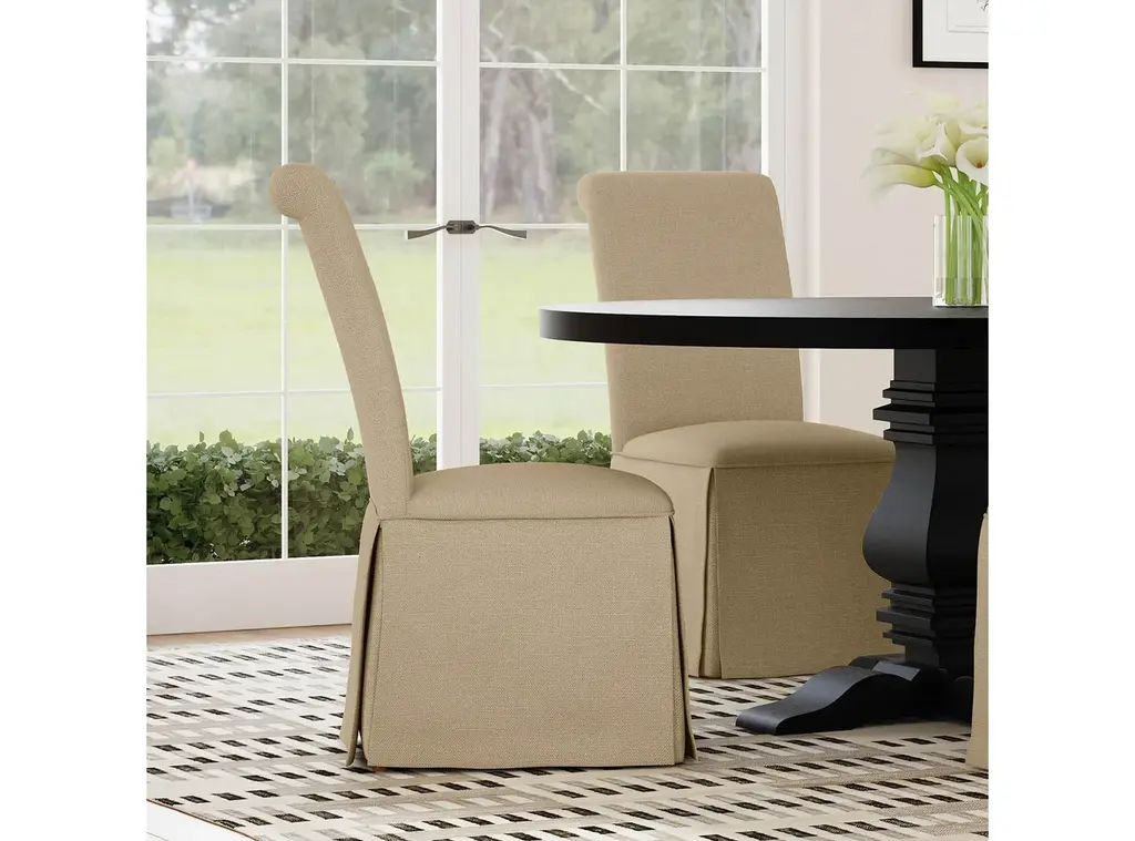 Put a stylish, somewhat formal spin on your dining room decor with a set of two classic parson chairs. The chair features plush foam padding, complete with neutral upholstery for a fresh, inviting presence at your dining table. The chairs showcase a fully skirted silhouette, adding a touch of flowing movement. Tall, rolled backs ensure supportive seating for friends and family, wonderful for daily and occasional use.