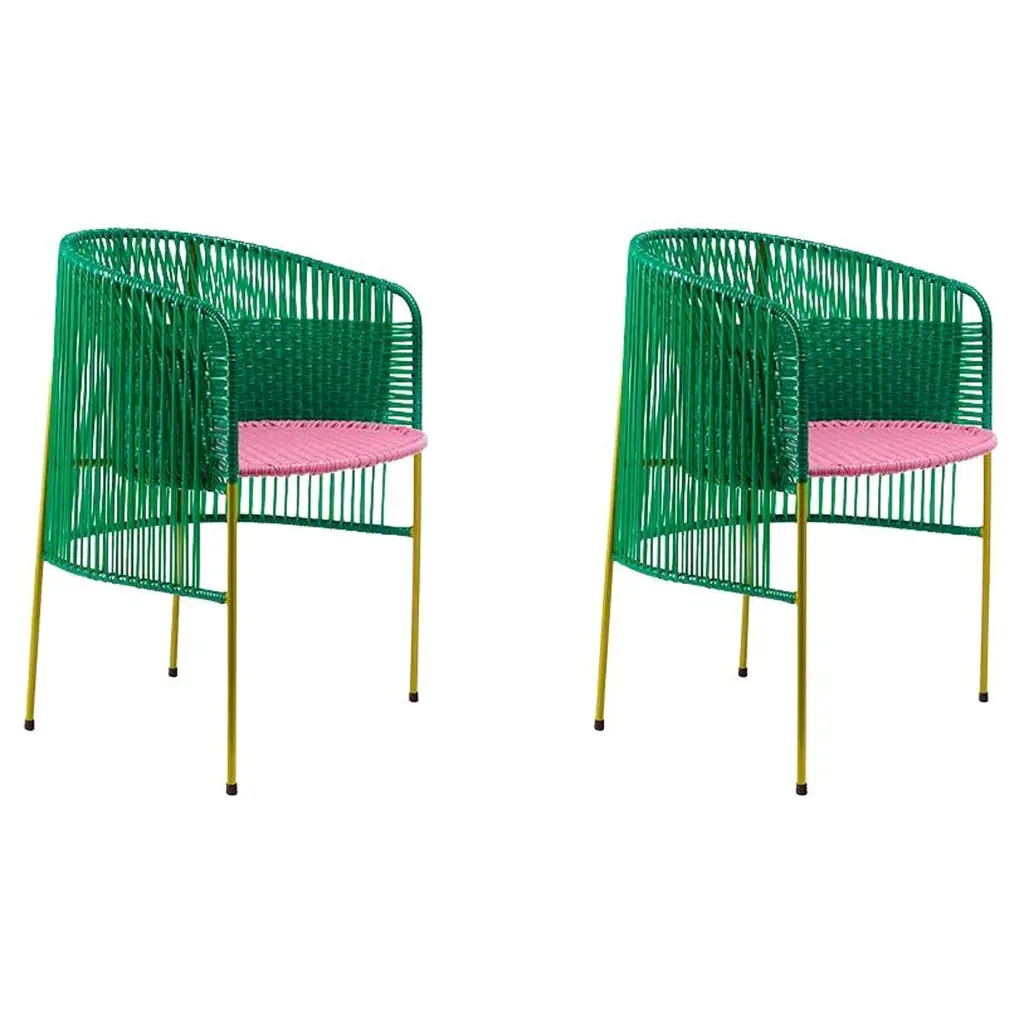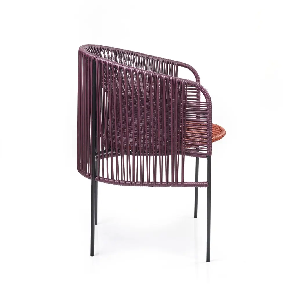 Set of 2 Violet orange caribe chic dining chair by Sebastian HerknerMaterials: Galvanized and powder-coated tubular steel. PVC strings are made from recycled plastic.Technique: Made from recycled plastic and weaved by local craftspeople in Colombia. Dimensions: W 55.3 x D 56 x H 75 cm Also available colors: blue/ mint/ black, mint/ green/ black, orange/ rose/ curry, green/ rose/ curry. The Caribe chic dining chair is an elegant design by Sebastian Herkner and can be used inside and outdoors. It’s part of our Caribe Chic collection, featuring an intricate hand-woven webbing in contrasting earthy, muted shades. The pieces and colors are inspired by the incredible nature of the Colombian Huila region where the serene Tatacoa desert meets the powerful Rio Magdalena.Each armchair is made in Santa Marta, a city on the Caribbean coast of Colombia, by local craftspeople. They weave the PVC strings, which are made from recycled plastic, around a powder-coated tubular steel frame. The weaving technique the artesanos and artesanas use are called Momposino, a traditional method known for intricate patterns. Just the preparation of all the materials takes ten days, while the production of each armchair takes three days.German designer Sebastian Herkner is a long-term collaborator of Ames and has visited Colombia multiple times to experience the country’s cities, nature and people first hand. He also visited many of the ateliers that Ames has partnered with to learn about the unique traditional crafts of Colombia's regions. A sought-after contemporary designer and recipient of many industry awards, he has worked with many international design brands, creating intriguing pieces that showcase his intuition for interesting material, color, and texture combinations.