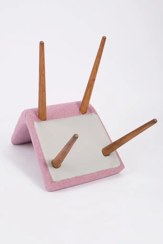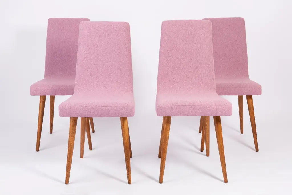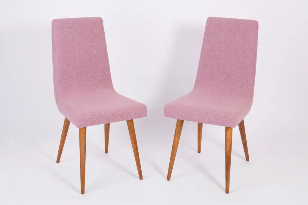 Chairs designed by Prof. Rajmund Halas. They have been made of beechwood. They have undergone a complete upholstery renovation, the woodwork has been cleaned and refreshed. We used matte varnish. Seats and backs were dressed in a pink mélange (color 2807), durable and pleasant to the touch wool mix fabric. They are stabile and very shapely. Chairs were produced in former furniture factory in Goleniów in the 1960s. We can prepare also set of two, six or eight chairs in other fabric. Please check the last picture with fabric colors.