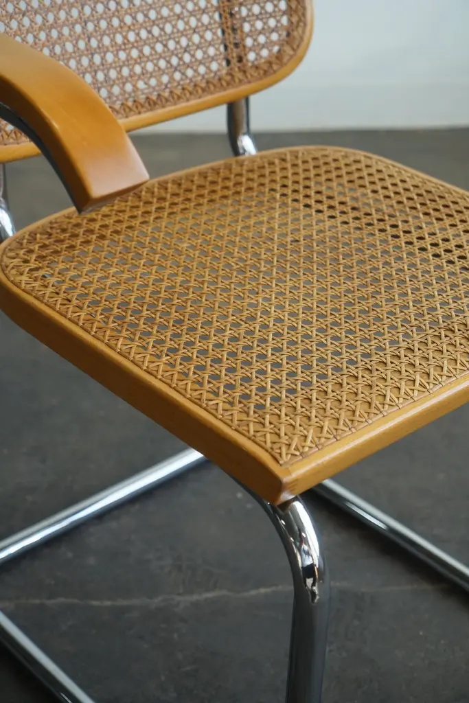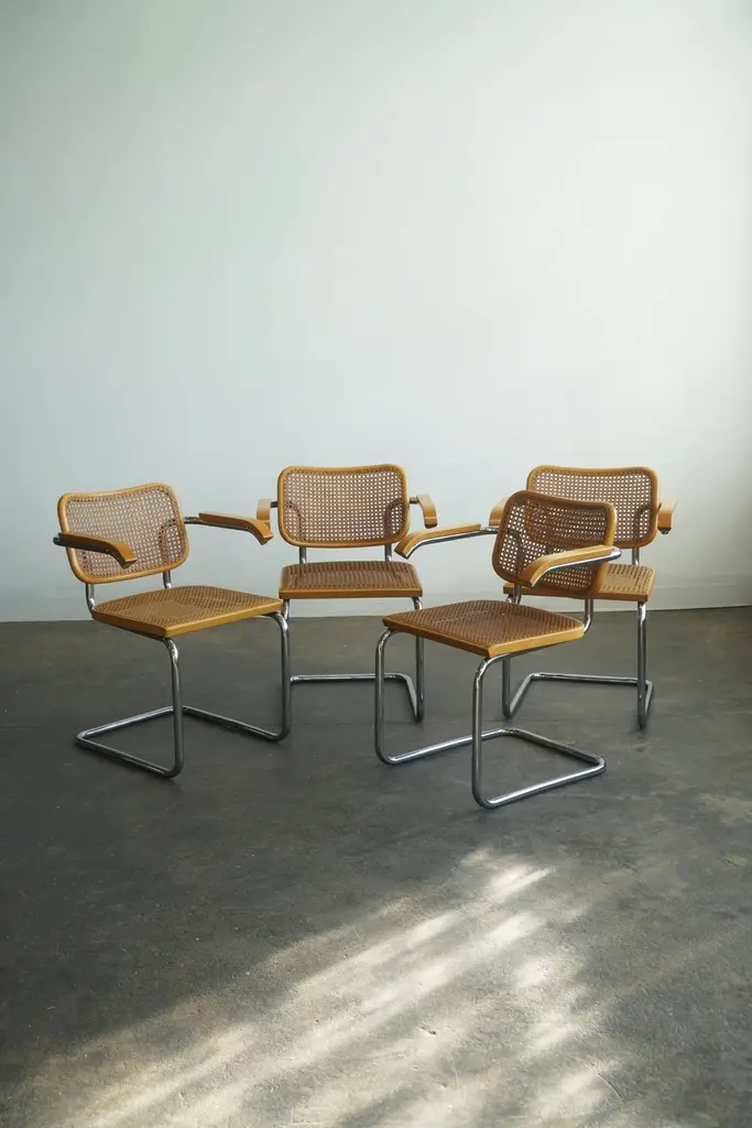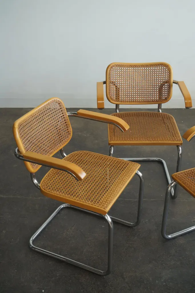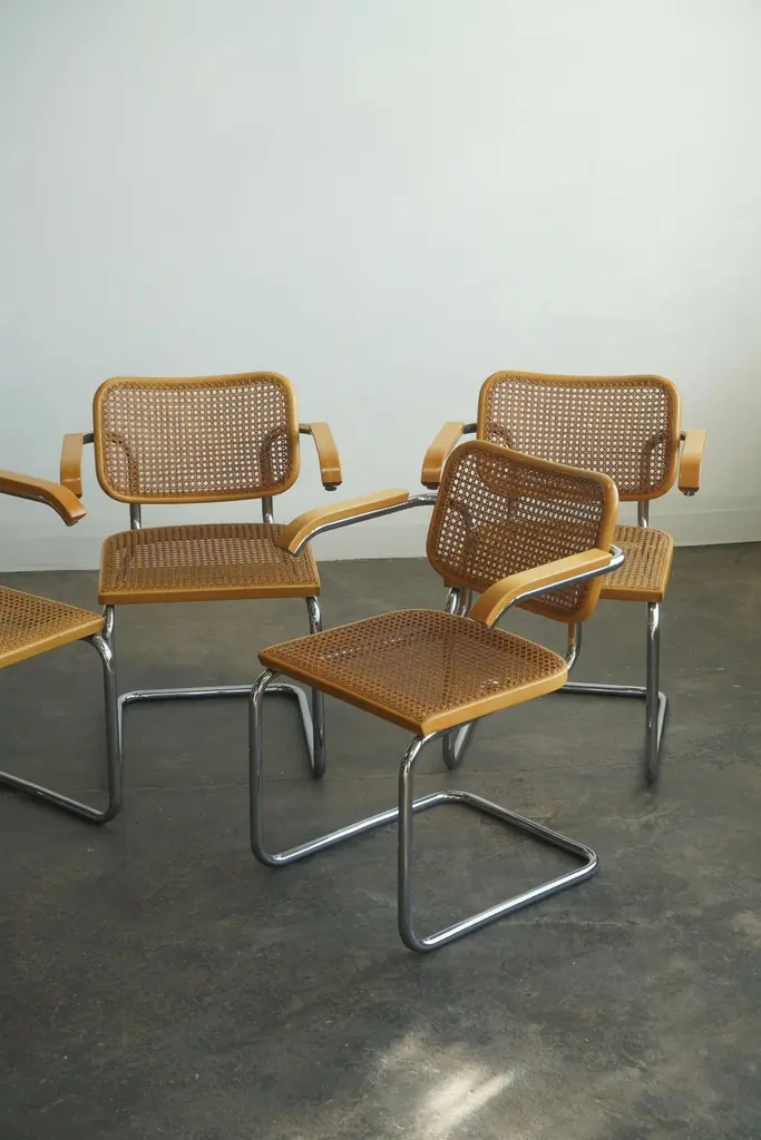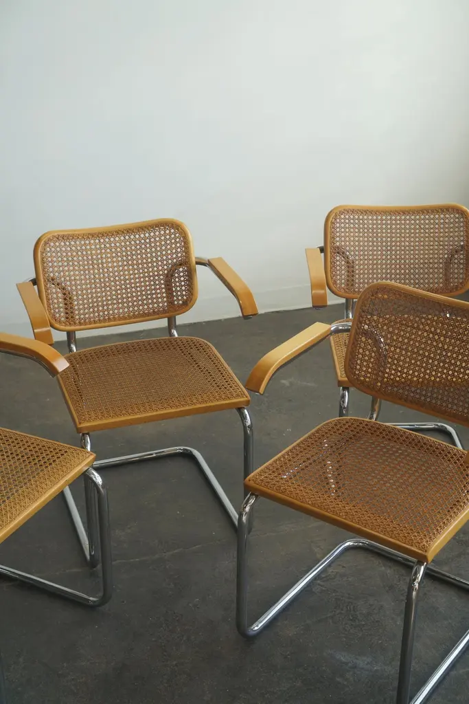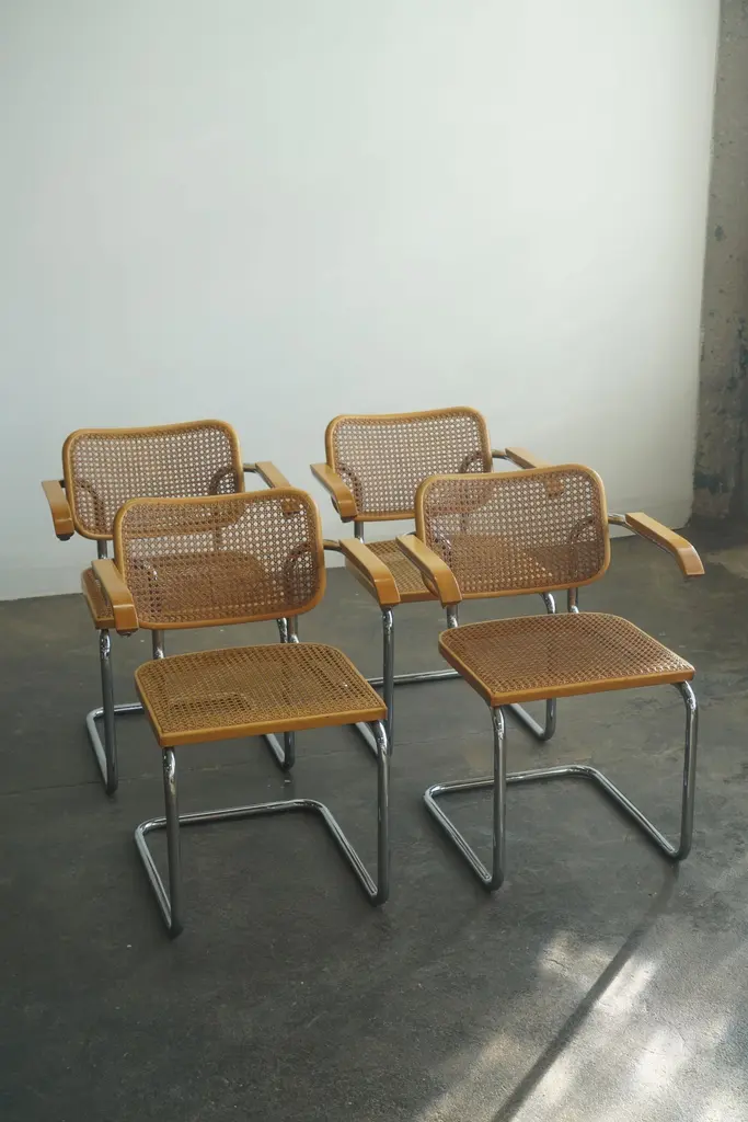 Set of 4Original Marcel Breuer "Cesca" arm chairs1960'sWith "Stendig" manufacturer labels.Breuer first designed this chair in 1928. Originally known as the B32, the chair’s revelatory use of material and simple form made it an international sensation—nothing like it existed at the time. In the early-1960s, the Modern Italian furniture manufacturer Gavina Group acquired the rights to the design. The company’s founder and owner, Dino Gavina, decided to rename the chair “the Cesca” after Breuer’s daughter, Francesca. The Cesca chairs were made and distributed under the Stendig name from 1962-1968. And in 1968, Knoll acquired the Gavina Group and brought the designs of Breuer.Condition:Overall very good condition for the original set. No holes to the cane seats and backs. Only some very minor surface scratches to wood. Chrome is in excellent condition.