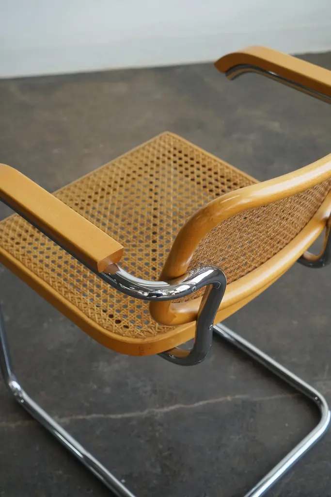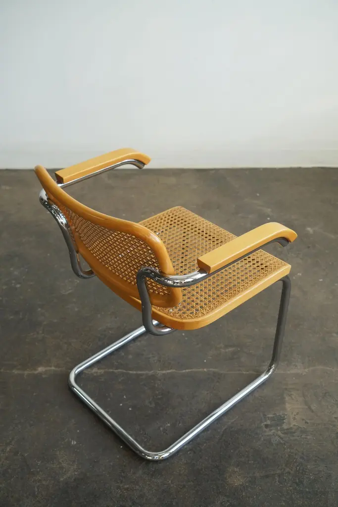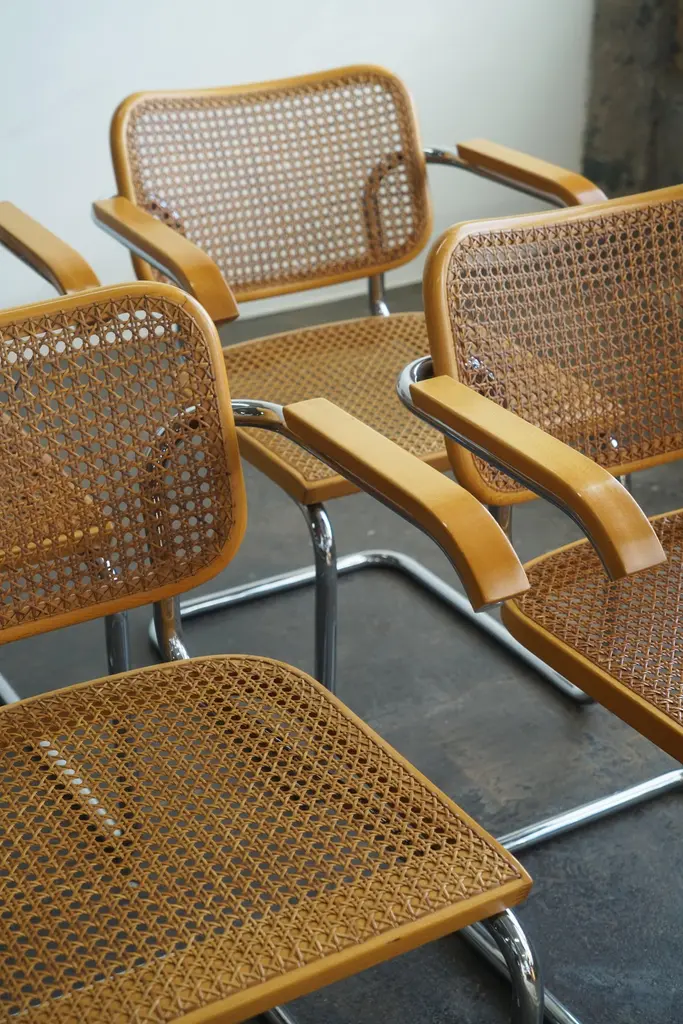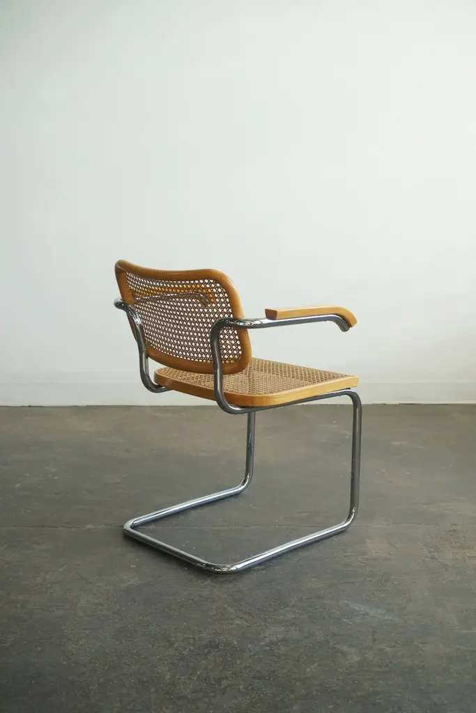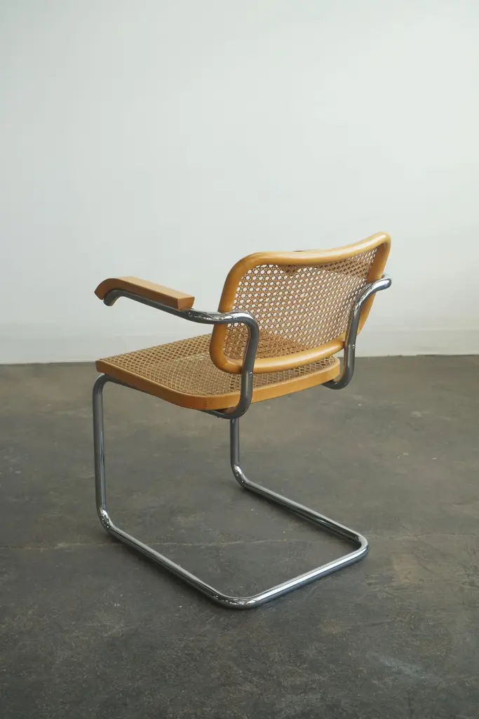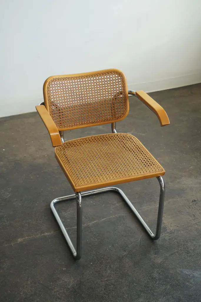 Set of 4Original Marcel Breuer "Cesca" arm chairs1960'sWith "Stendig" manufacturer labels.Breuer first designed this chair in 1928. Originally known as the B32, the chair’s revelatory use of material and simple form made it an international sensation—nothing like it existed at the time. In the early-1960s, the Modern Italian furniture manufacturer Gavina Group acquired the rights to the design. The company’s founder and owner, Dino Gavina, decided to rename the chair “the Cesca” after Breuer’s daughter, Francesca. The Cesca chairs were made and distributed under the Stendig name from 1962-1968. And in 1968, Knoll acquired the Gavina Group and brought the designs of Breuer.Condition:Overall very good condition for the original set. No holes to the cane seats and backs. Only some very minor surface scratches to wood. Chrome is in excellent condition.