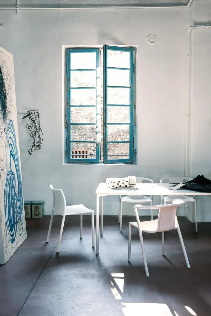 Air-Family takes its name from the “air-moulding” technology that makes it possible to create highly resistant yet super-lightweight products out of polypropylene added with fibreglass.Harmonious, dynamic, stackable, and suitable for indoor or outdoor use, table and chairs create a welcoming atmosphere anywhere: at home or in a collective space, in the kitchen, the dining room or the garden.The products are available in a range of colours to suit any taste and style.The chairs come with or without armrests and are also available as foldable version.