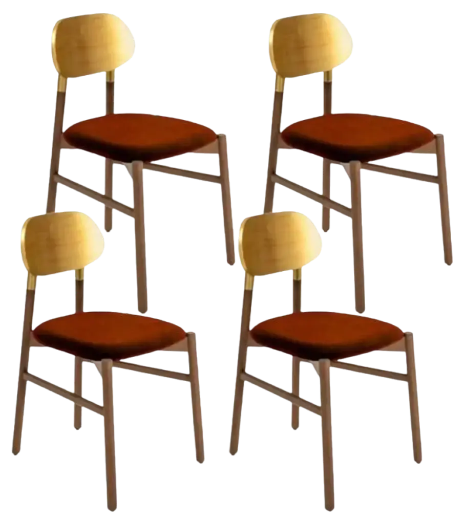Set of 4, bokken upholstered chair, Canaletto, Blue by Colé Italia with Bellavista/PicciniDimensions: H 81.7 D 49 W 53.5 cmMaterials: Canaletto walnut finishing, padded seat - Cat C: VelvetforthyAlso available: COM Fabric, Fabric Cat A, Fabric cat B, Leather Cat P, and natural beech, beech structure stained, gold or silver leaf.TC: C.O.M. fabric - send us your own materialCA: Cat A - Angel (polypropylene), Ganesha (synt. leather), Nord Wool (felt)CB: Cat B - Tiffany (polyester), Lana (aquaclean)CC: Cat C - Velvetforthy (Velvet), Topia (wool), Novum (Wool), Opera (felt)CP: Cat P - Milano (full grain leather)An essential chair in the form yet precious in colors. Tapered and elongated, the legs of the seat are inspired by the bokken, a wooden replica of the Japanese sword used in the training of the Japanese martial art of Aikido and Kendo. Bokken chair is characterized by the backrest in precious colors: blue aquamarine, ruby red off-white, anthracite, and authentic gold or silver leaf, to match the structure of natural or walnut dyed beech wood. These chairs are customizable like all the brand’s products to meet the specific demands of the contract sector.Colé is a young Italian design brand, with a high-end production 100% made in Italy. Born from the experience of Matteo De Ponti, architect, who grew up in one of the most outstanding Milanese design families, and the artistic sensibility of Laura Macagno, degree in Economics and passionate of art and design. Our Mission is to create design icons, beautiful and comfortable pieces that can Stand the test of time, furnishing houses of international and sophisticated clients, and realized with craftsmanship, thus unique. “We love objects which own deep roots, excellent quality, and a strong evocative power. Archetypal forms dressed with new beauty without losing their classical composure”.Our expressive research is inspired by the utopian force of Italian eminences grises architects and designers of the ’50s, the Scandinavian design, the Bauhaus, ethnic handcraft and houses of famous writers of the XX century, all different as a style but united by the intense soul of those who worked and lived there.