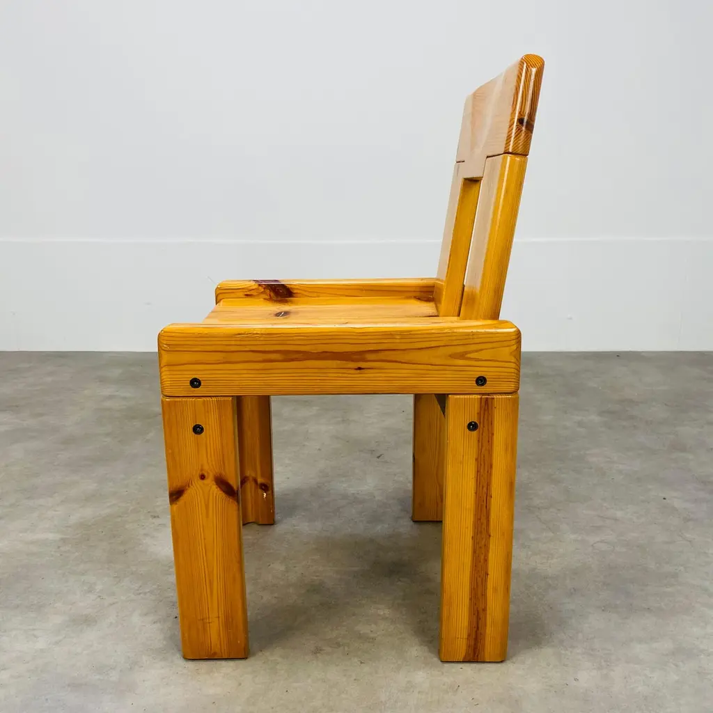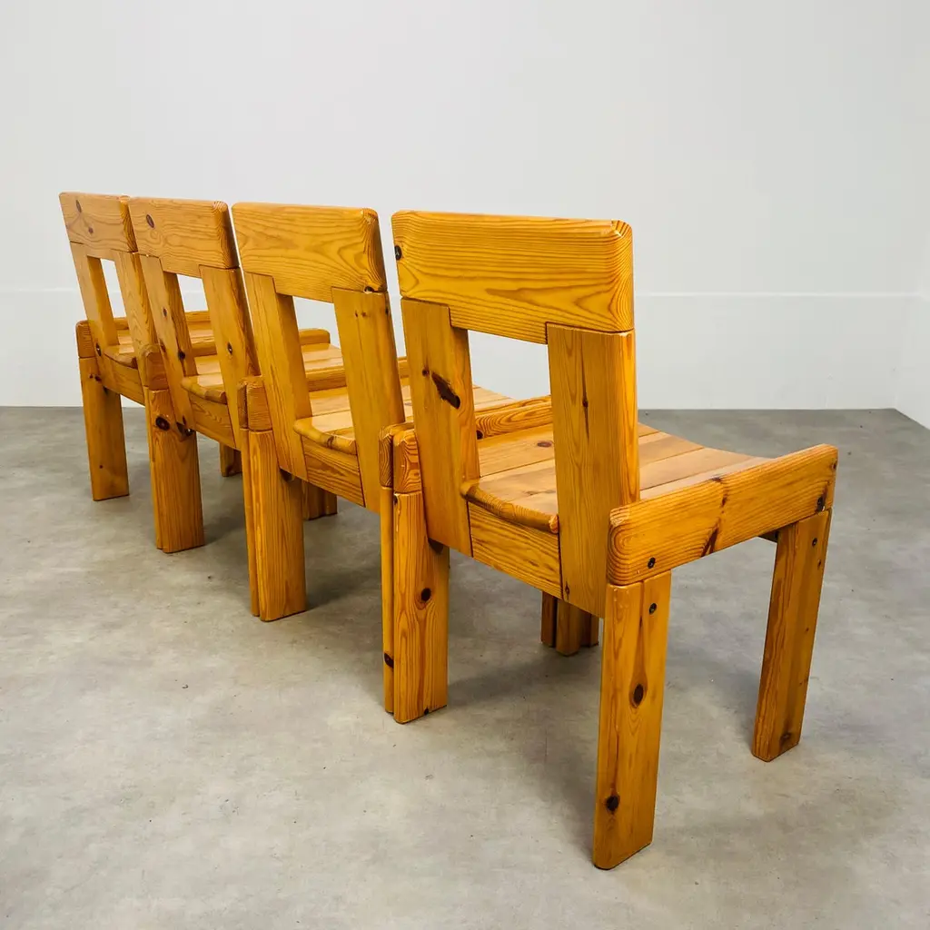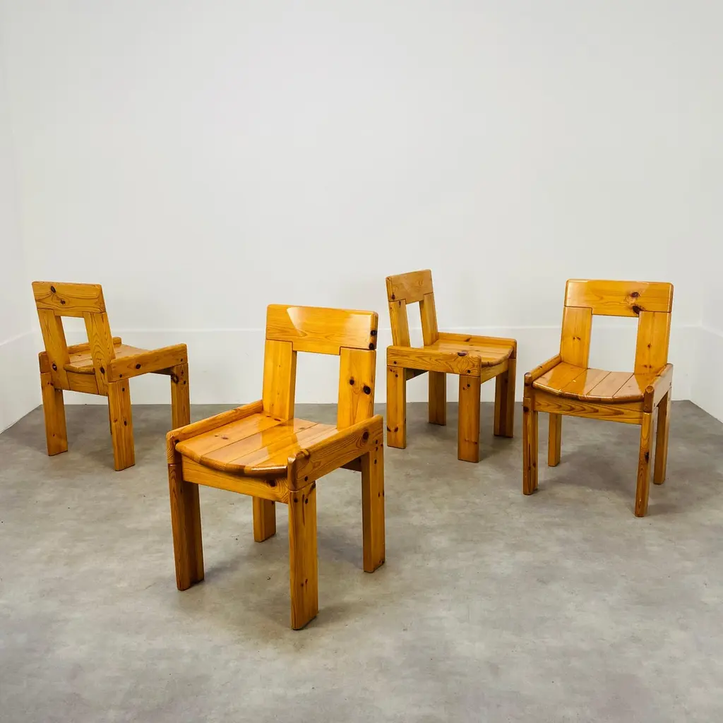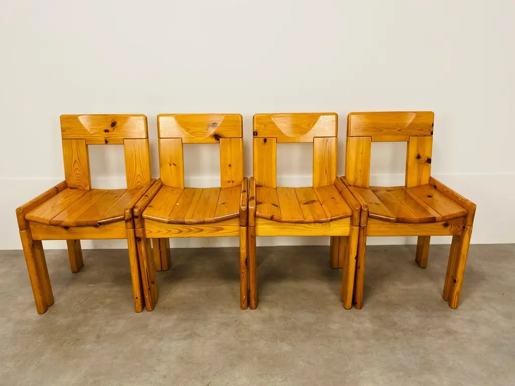 Set of four brutalist chairs designed by Silvio Coppola for Roche Bobois, France, in the 1970's. They're in massive pine wood. They're in nice condition, wear consistent with age and use, minor scratches but remains stables and very sturdy.