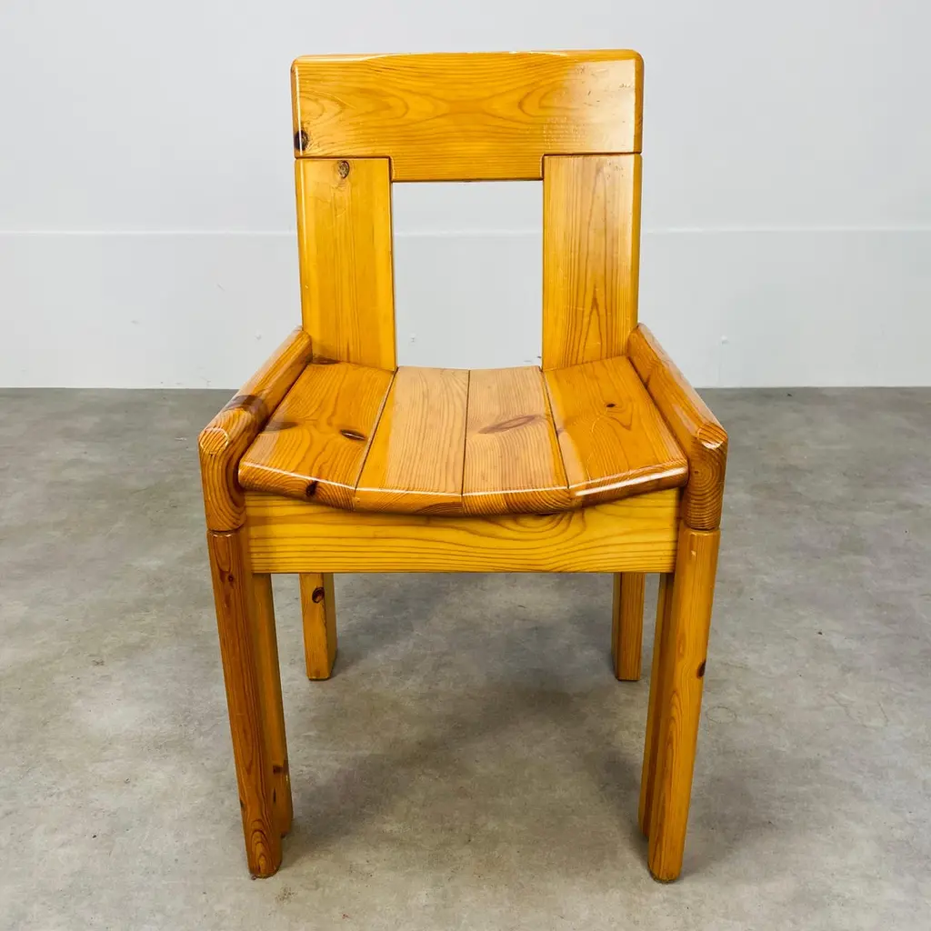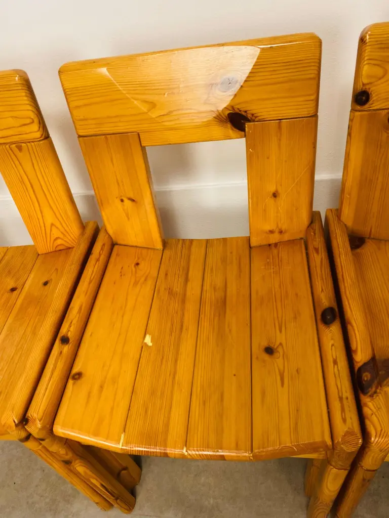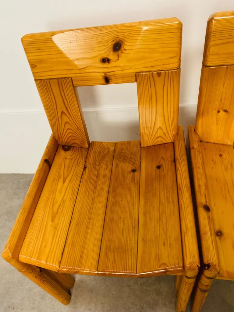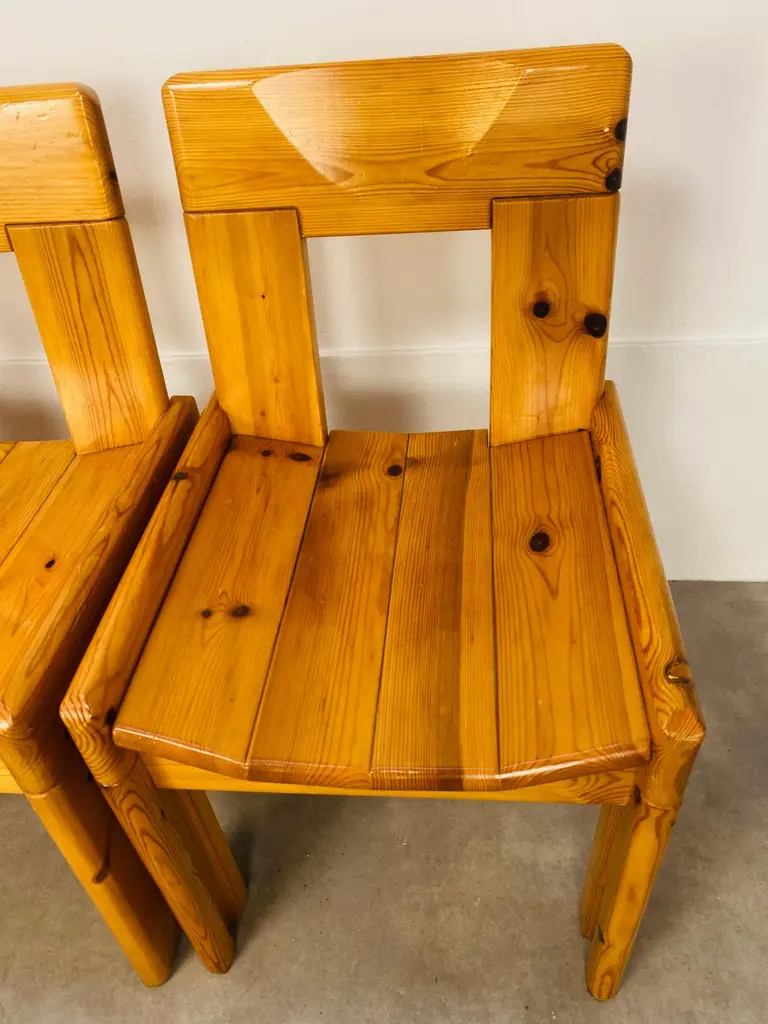 Set of four brutalist chairs designed by Silvio Coppola for Roche Bobois, France, in the 1970's. They're in massive pine wood. They're in nice condition, wear consistent with age and use, minor scratches but remains stables and very sturdy.