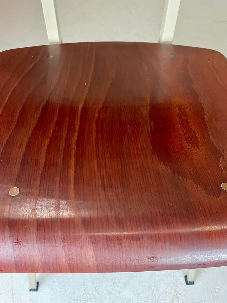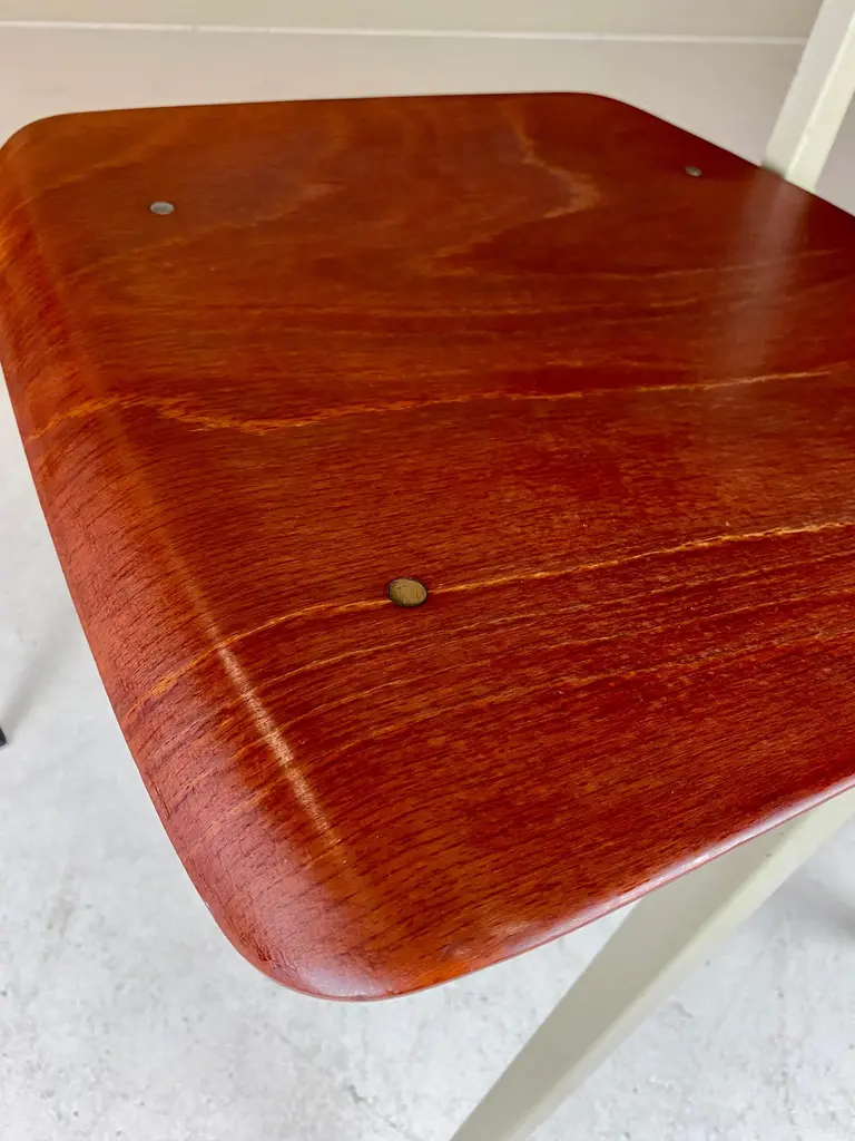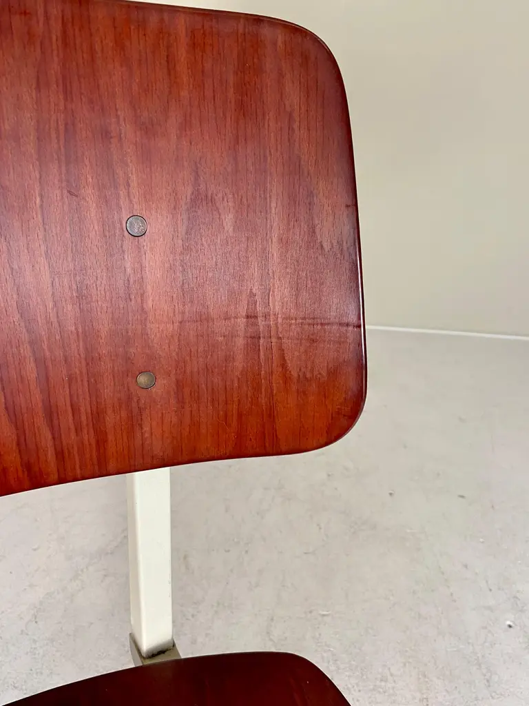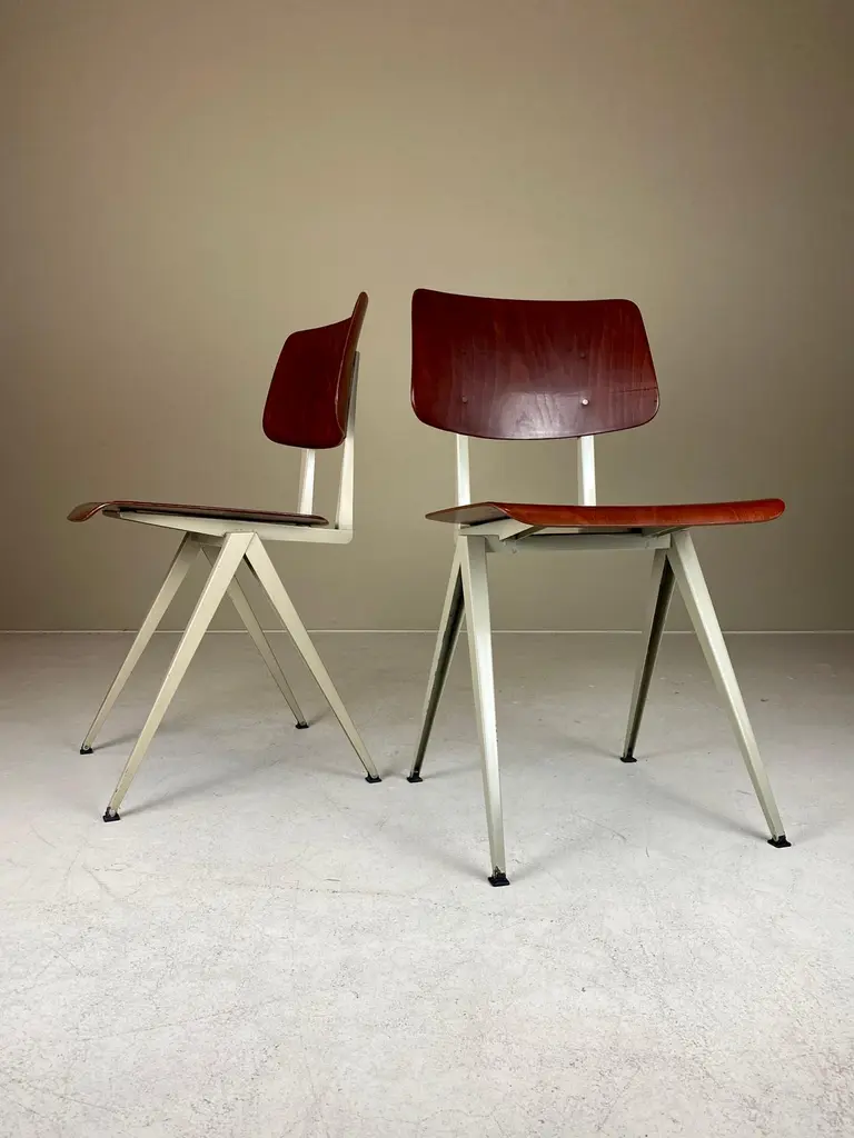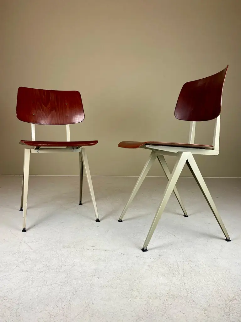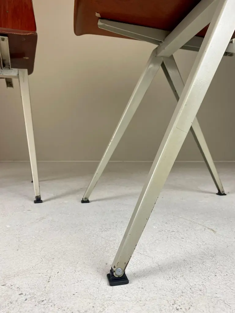 For sale is a lovely set of four Galvanitas S16 Compass Chairs, arguably the most iconic school chair ever produced. The first to design with sheet metal was obviously Jean Prouve, but in The Netherlands the experiments with these classic compass leg subframes really exploded in the 1950s. Friso Kramer and Wim Rietveld designed the similar looking Result Chair for Ahrend in the same period, but the S16 turned out to be the most successful —featuring in most schools and canteens of office- and government buildings. Made from a sheet steel frame with a fine laminated and formed seat and back by Pagholz, the iconic S16 Chair is proportioned perfectly and a true design classic. The featured set is manufactured in the 1960s and in a lovely vintage condition with wear consistent with age and use. They all retain their original moveable feet caps — which is quite unique. We chose to minimise restoration to keep every piece as original as possible. A truely great chair, for an absurdly affordable price.General note: Shipping quotes as supplied by 1stdibs are only indicative. We will discuss and figure out the best possible shipment method (and rate) for every individual object.