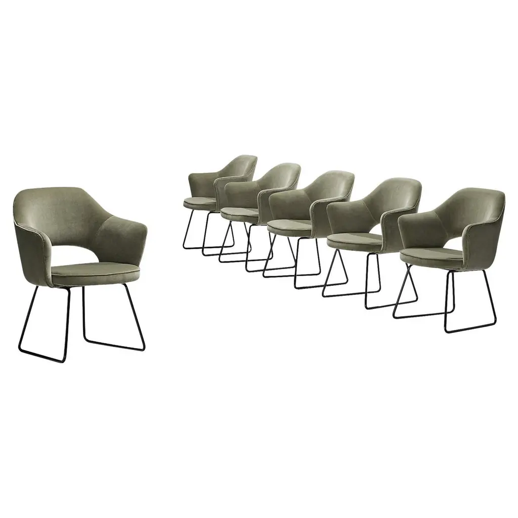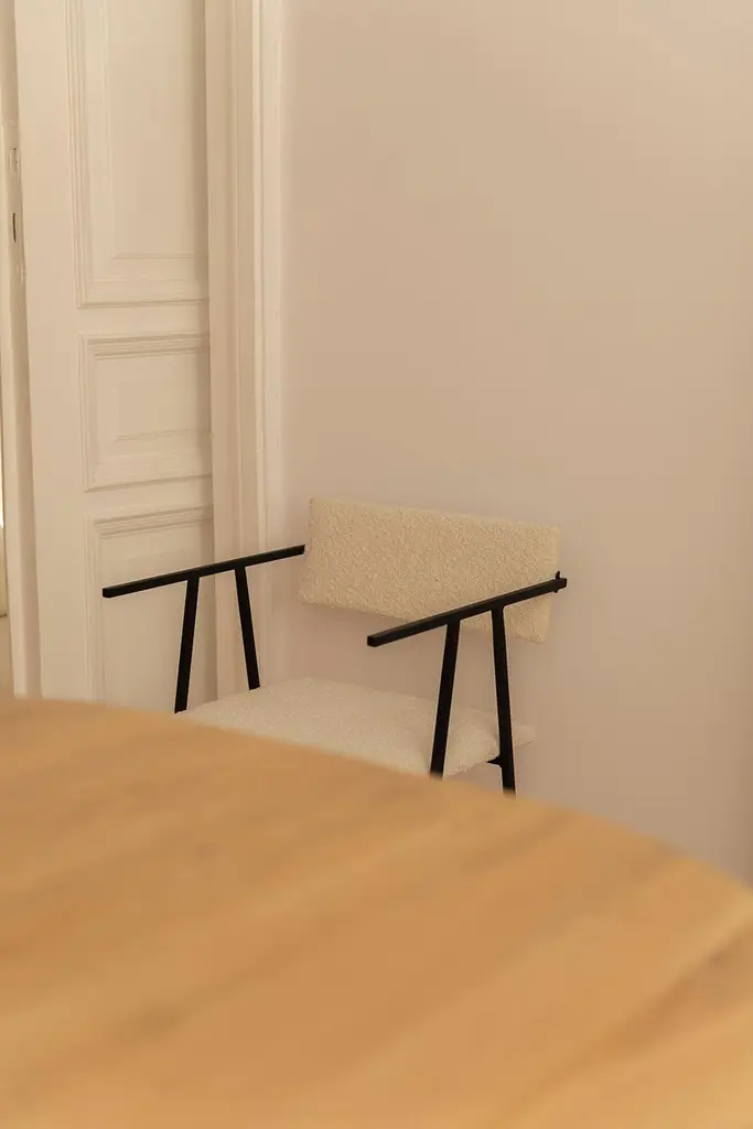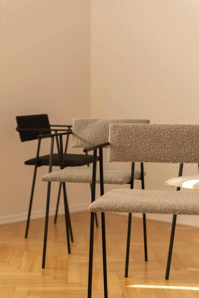 Set of 4 object 058 chairs by NG DesignDimensions: D 45 x W 42 x H 75 cmMaterials: Powder coated steel, Boucle upholstery.Also available: All of objects available in different materials and colors on demand.Object058 is a comfortable chair upholstered in Boucle fabric. The minimalist shape together with the soft seat and back create a very successful combination. The backrest hanging on the armrests gives the chair an original shape."Our brand was created out of a passion for unconventional design. The furniture we produce is characterized by the highest quality and attention to detail. Each piece of furniture is handmade in Poland and its design defies a traditional approach. standard of interior design. to an object of uniqueness, which makes it a form in itself".