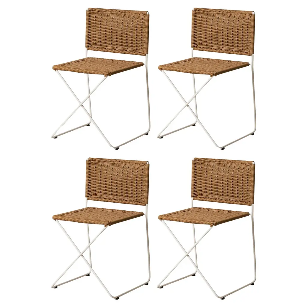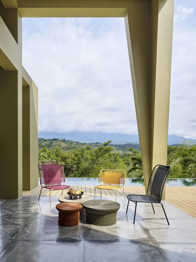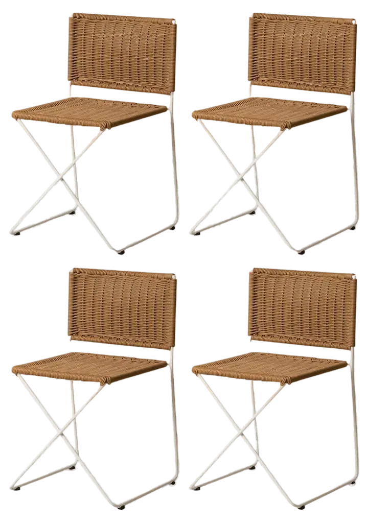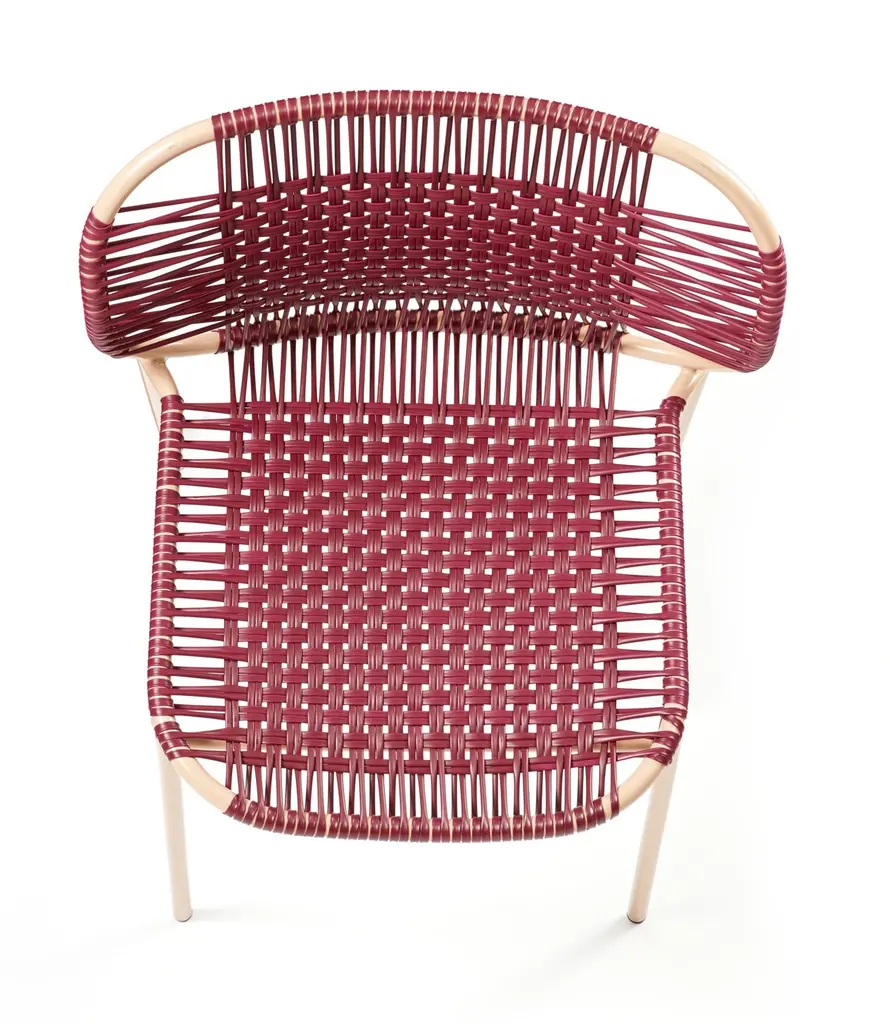 Set of 4 purple Cielo stacking chair by Sebastian HerknerMaterials: PVC strings, powder-coated steel frame. Technique: made from recycled plastic and weaved by local craftspeople in Cartagena, Colombia. Dimensions: W 56 x D 51.4 x H 78 cm Also available colors: brown, mint/ black, black-black, olive/ menta, purple/ carne , honey/ menta.The Cielo stacking chair is a light, versatile and comfortable design by Sebastian Herkner. It’s ready for indoor and outdoor use and a great choice to create inspired seating arrangements on a terrace or in the living room. Available in various color combinations, the stackable chair can also add personality to dining areas of restaurants or hotels. Like the daybed and lounge chairs of the collection, the colors and look are inspired by Sebastian’s visits to Colombia. There, he not only immersed himself in the culture and beauty of the country but also met the local Ames artisans and learned about their traditional weaving techniques.Each chair is made in Santa Marta, a city on the Caribbean coast of Colombia, by local craftspeople. They weave the PVC strings, which are made from recycled plastic, around a powder-coated tubular steel frame. The weaving technique the artesanos and artesanas use are called Momposino, a traditional method known for intricate patterns. Just the preparation of all the materials takes ten days, while the production of each chair takes two daysGerman designer Sebastian Herkner is a long-term collaborator of Ames and has visited Colombia multiple times to experience the country’s cities, nature and people first hand. He also visited many of the ateliers that Ames has partnered with to learn about the unique traditional crafts of Colombia's regions. A sought-after contemporary designer and recipient of many industry awards, he has worked with many international design brands, creating intriguing pieces that showcase his intuition for interesting material, color, and texture combinations.