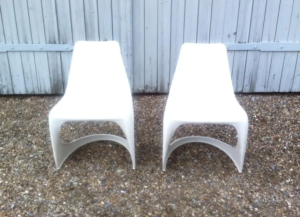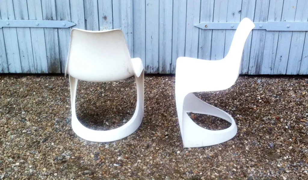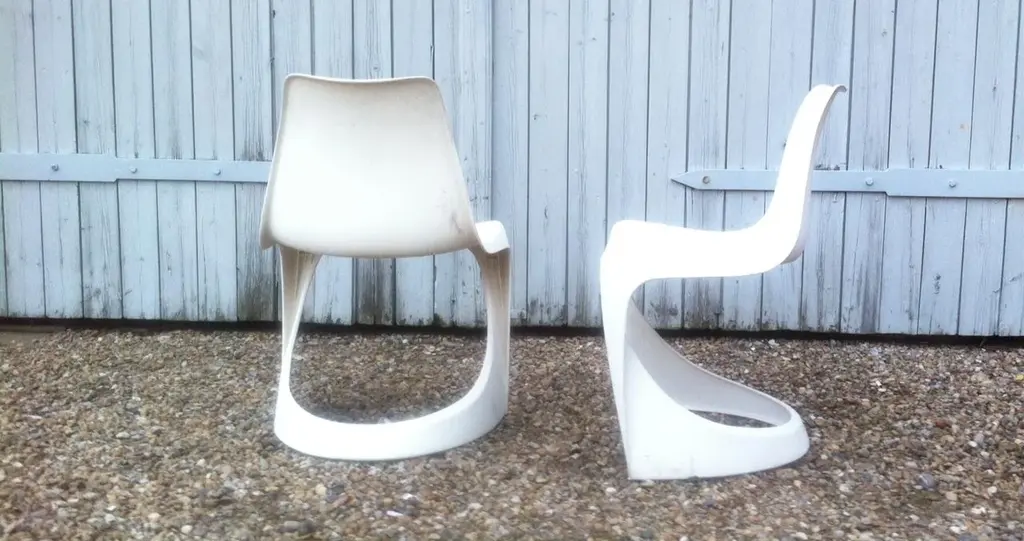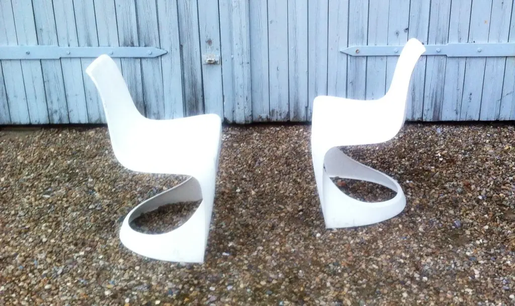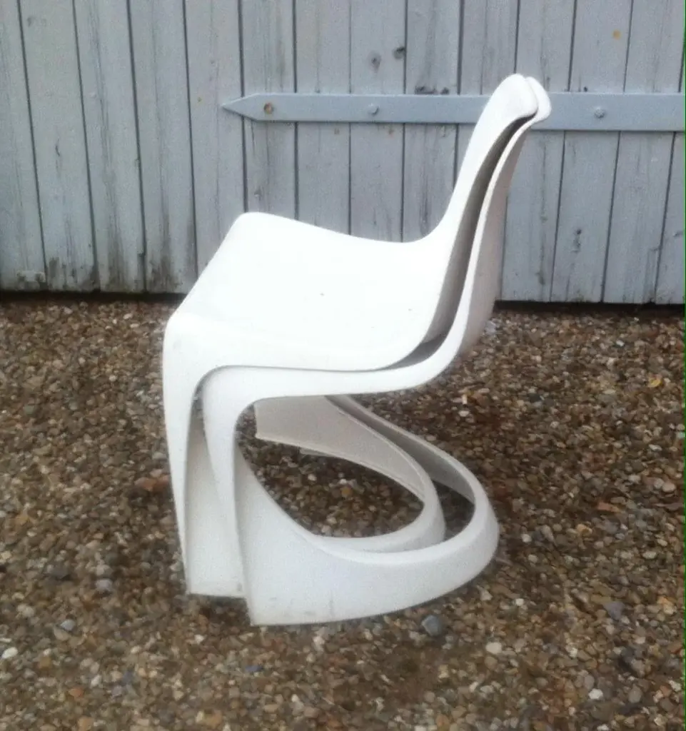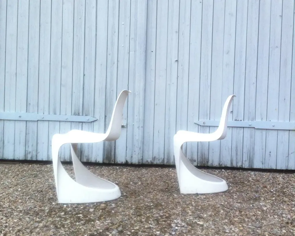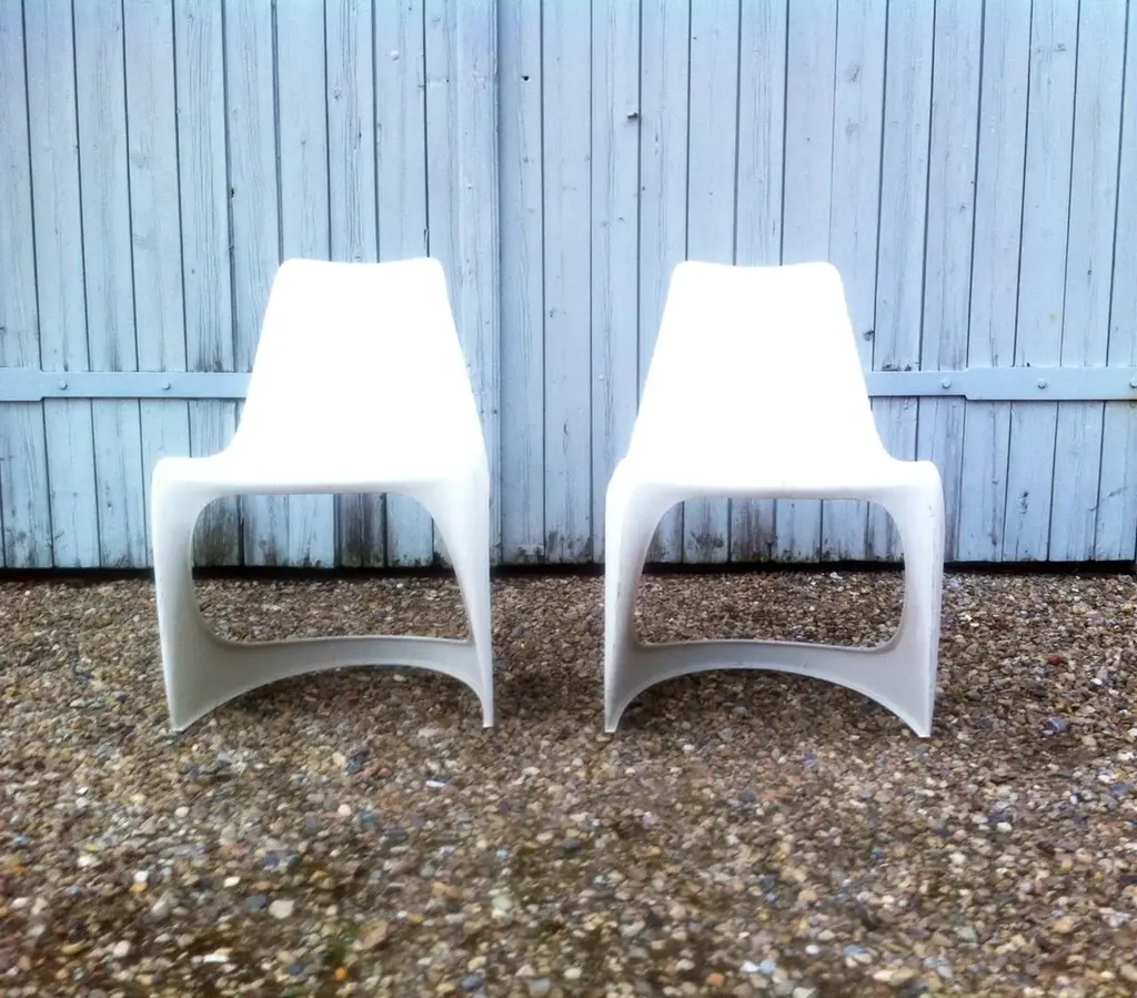 This set of two A-line 290 side chairs was designed by Steen Ostergaard for Cado in the 1970s. The stackable A-line chair 290 was the first chair ever made by moulded injection in one piece. The chairs were produced in fiberglass with reinforced polyamide for both indoor and outdoor use.