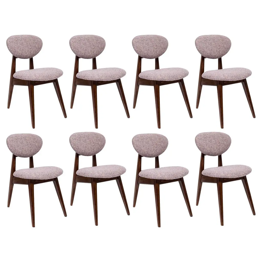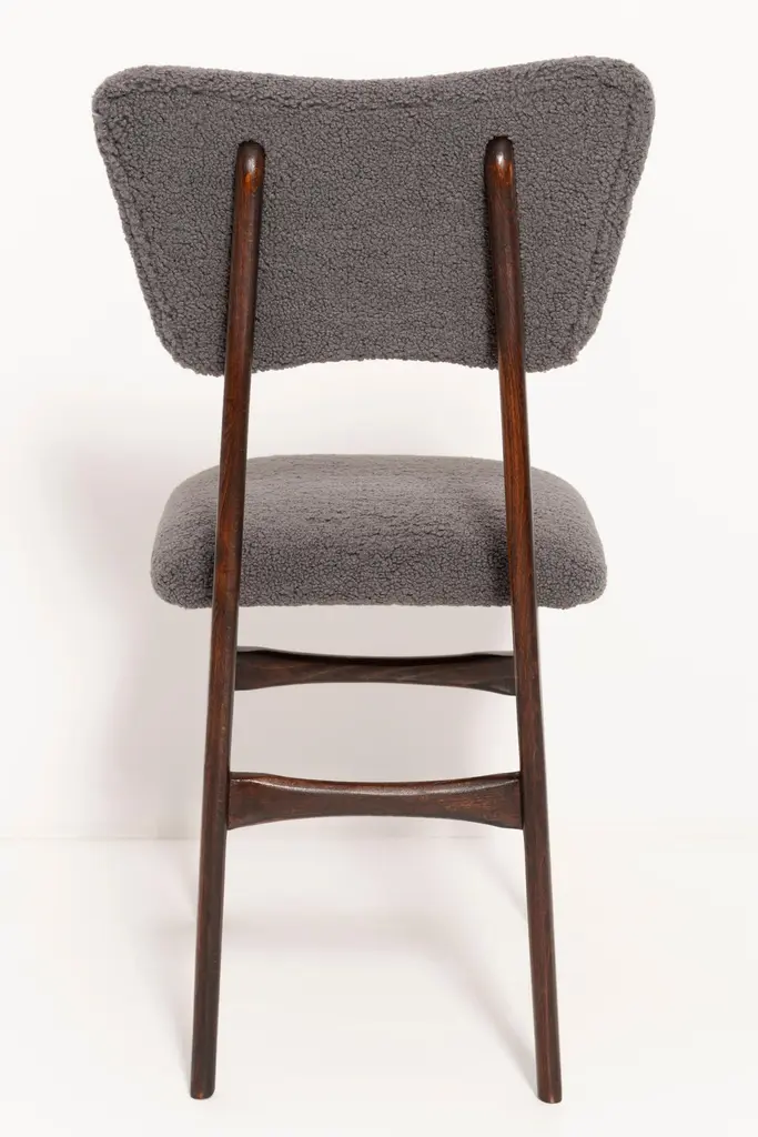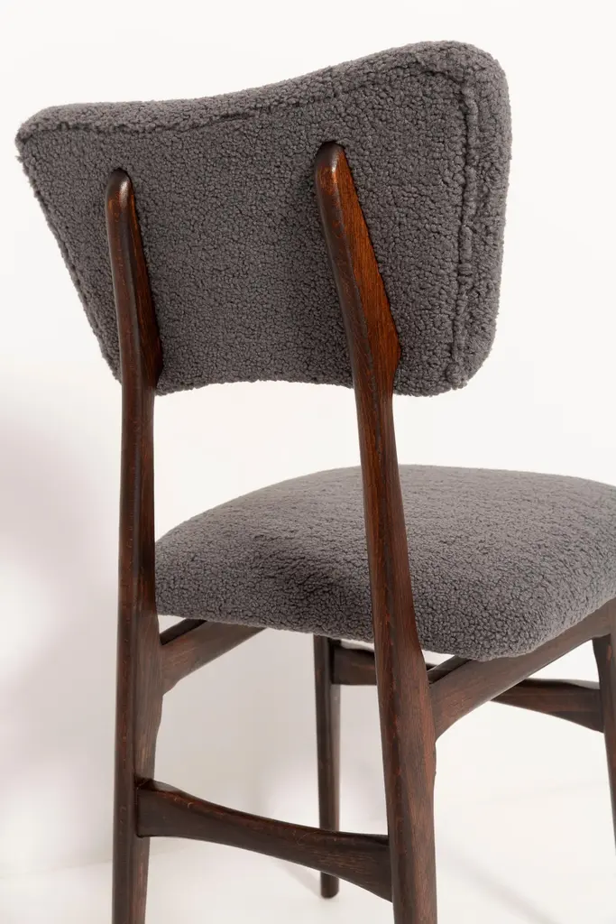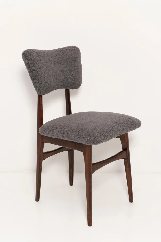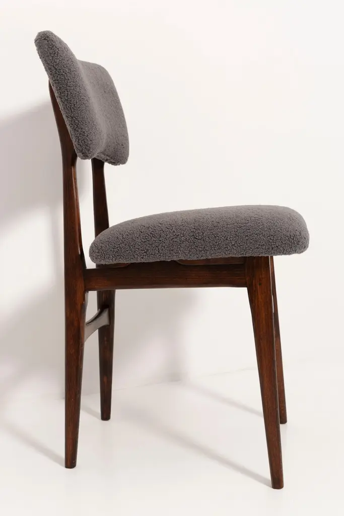 Chairs designed by Prof. Rajmund Halas. Made of beechwood. Chairs are after a complete upholstery renovation; the woodwork has been refreshed. Seat and back is dressed in dark gray (color 07), durable and pleasant to the touch bouclé fabric. Chairs are stabile and very shapely. They were produced in former furniture factory in Goleniów in the 1960s. We can prepare this set in every color of wood and fabric also in bigger sets. Please check the last picture with bouclé color samples.