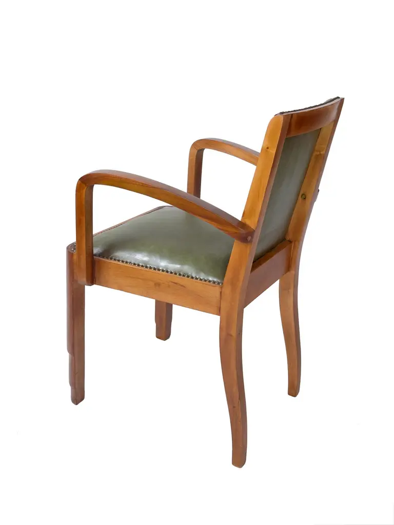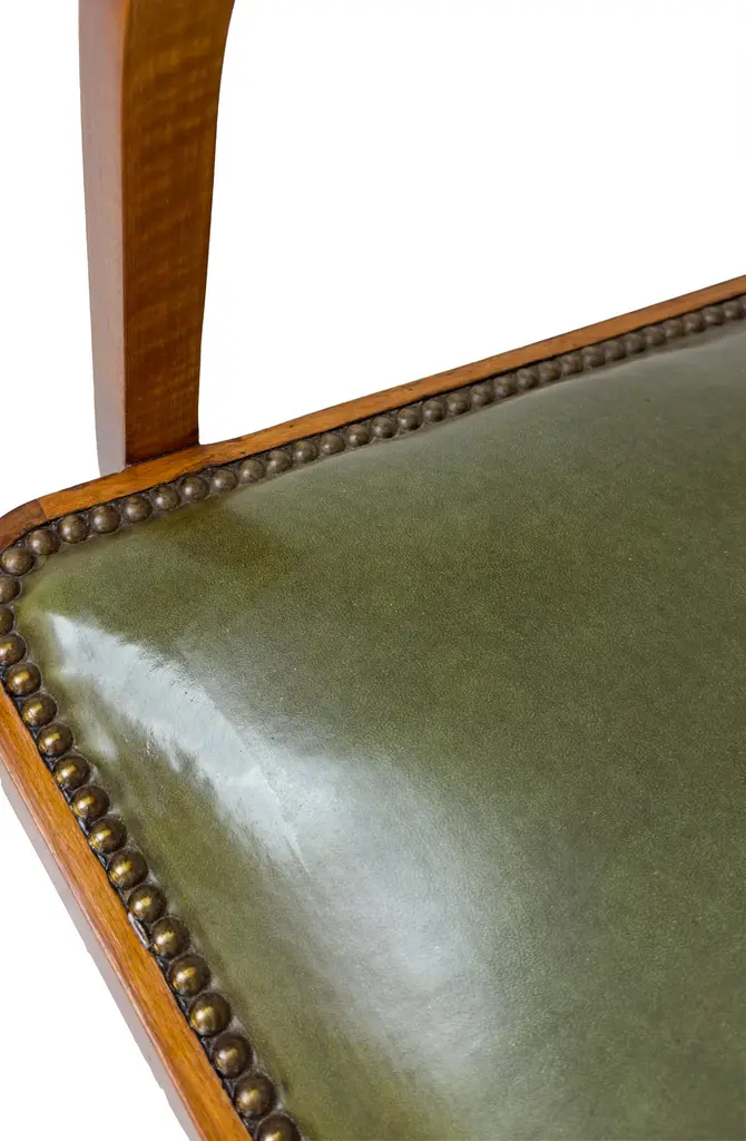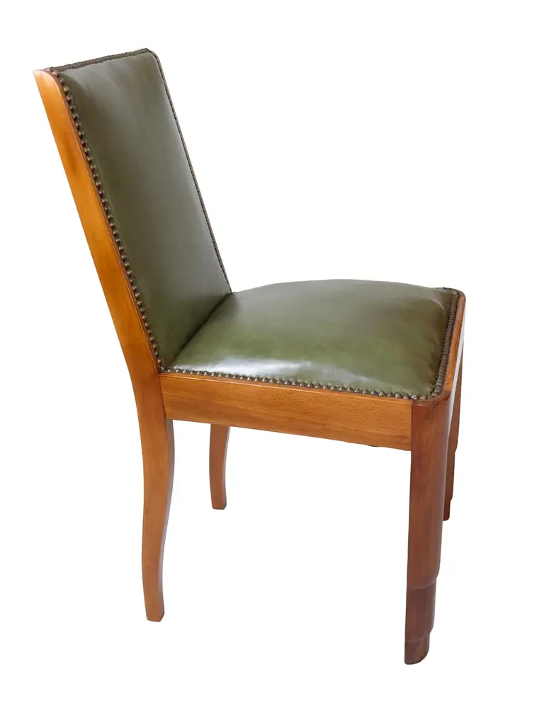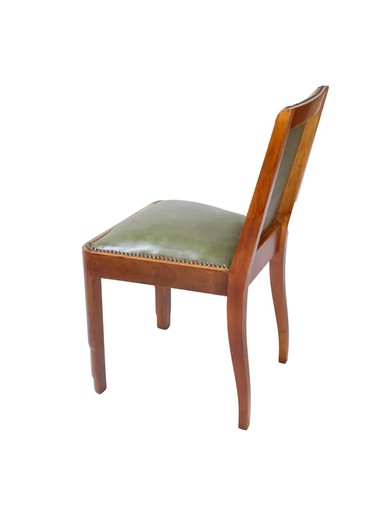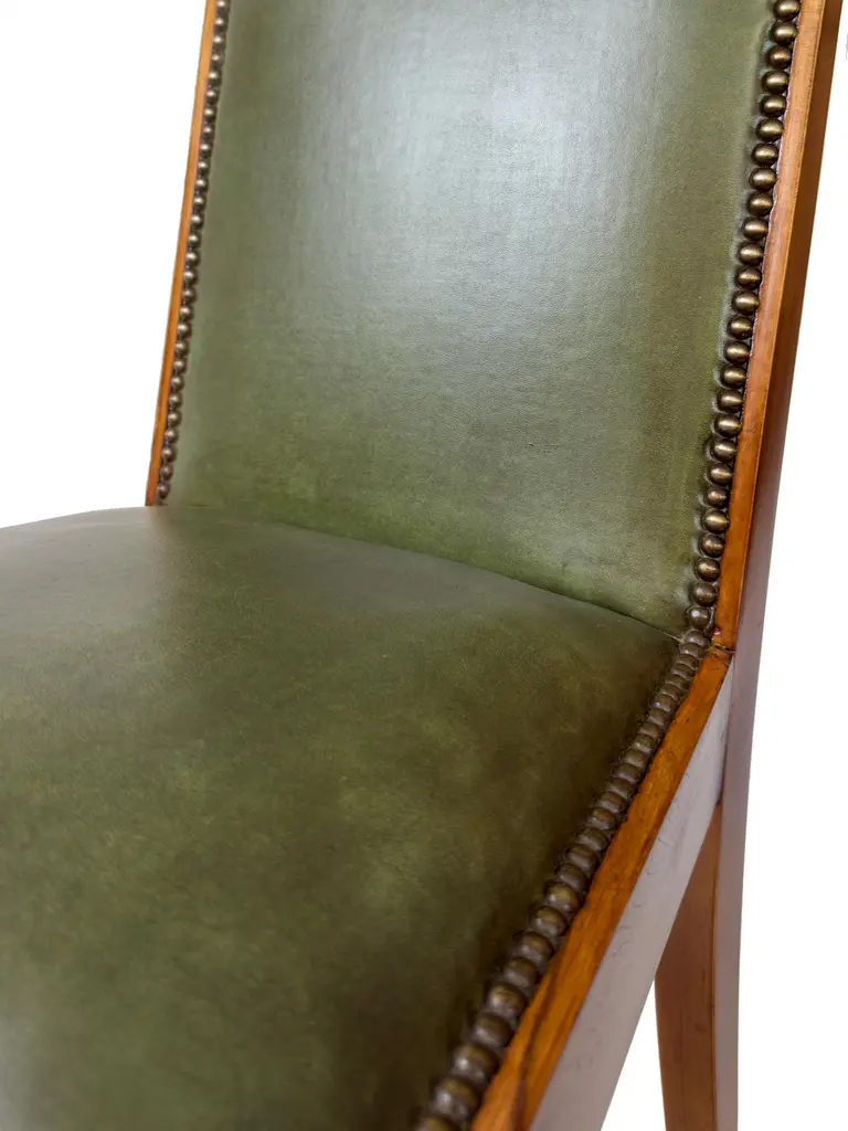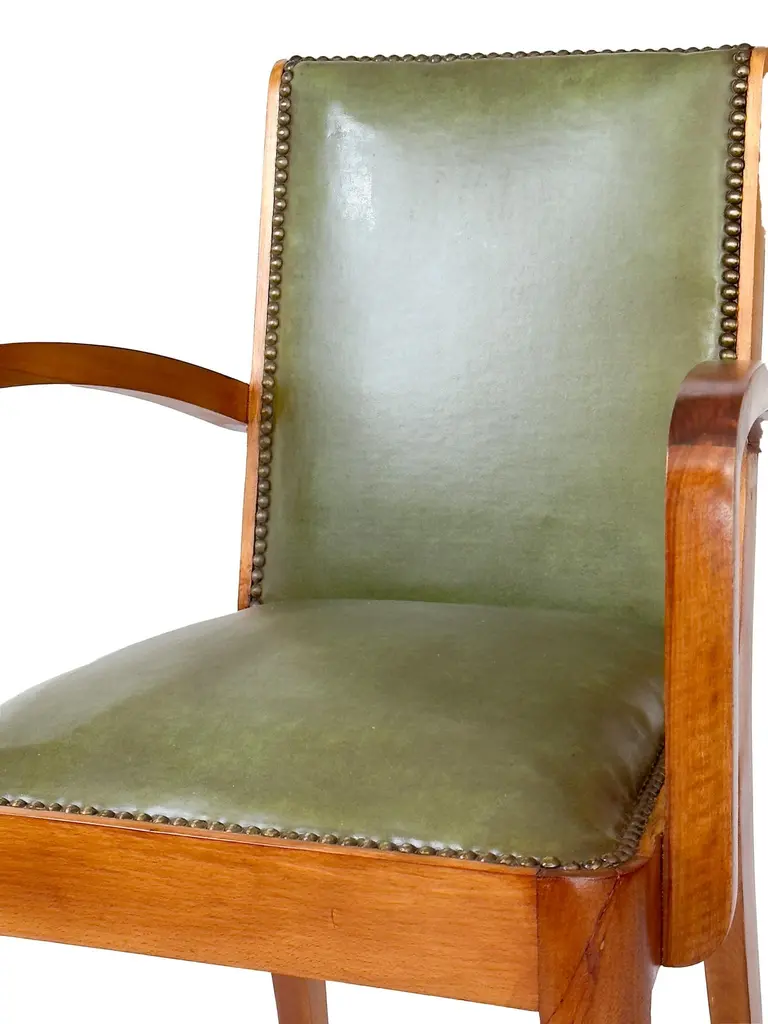 This set of eight of Art Deco chairs: two armchair and six chairs from the 1920s features green upholstery and solid wood frames. With their clean lines and brass nailhead trim, these chairs embody the refined geometric spirit of the era. The rich walnut wood adds warmth and contrast to the glossy green leather, offering a bold yet balanced aesthetic.Take into account that the colors on the items may vary depending on the type of lighting and the type of screen from which you see the images.