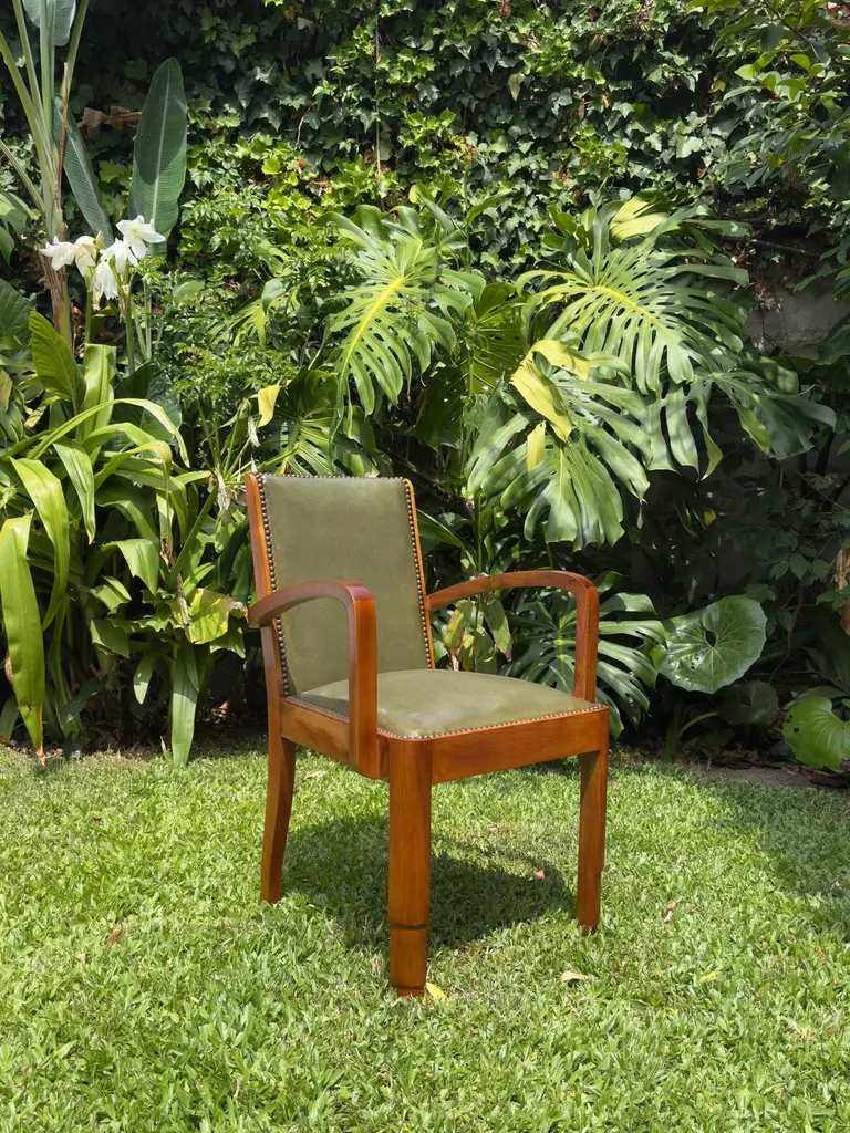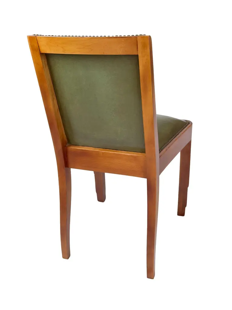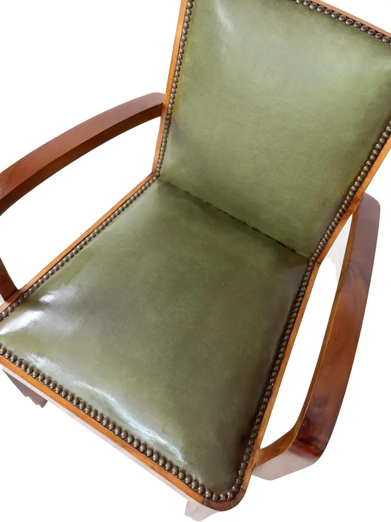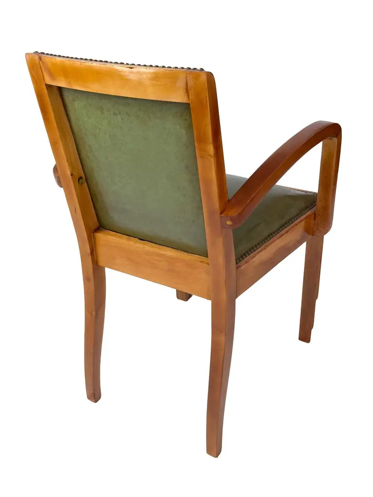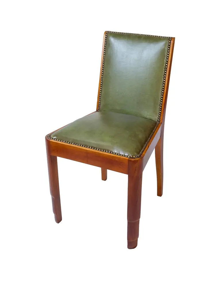 This set of eight of Art Deco chairs: two armchair and six chairs from the 1920s features green upholstery and solid wood frames. With their clean lines and brass nailhead trim, these chairs embody the refined geometric spirit of the era. The rich walnut wood adds warmth and contrast to the glossy green leather, offering a bold yet balanced aesthetic.Take into account that the colors on the items may vary depending on the type of lighting and the type of screen from which you see the images.