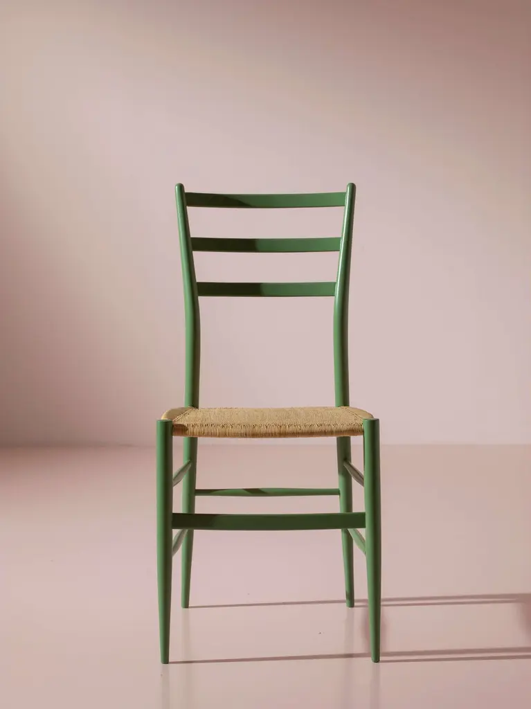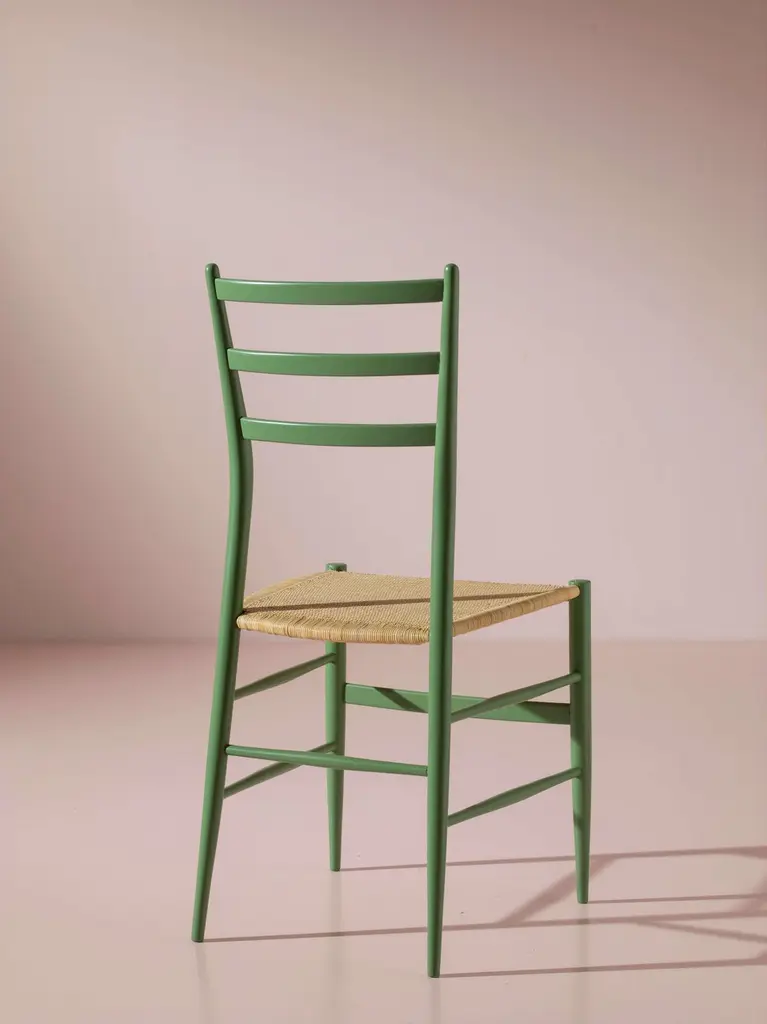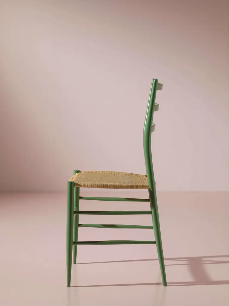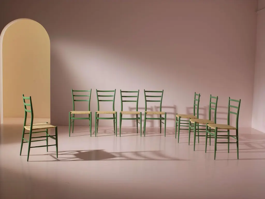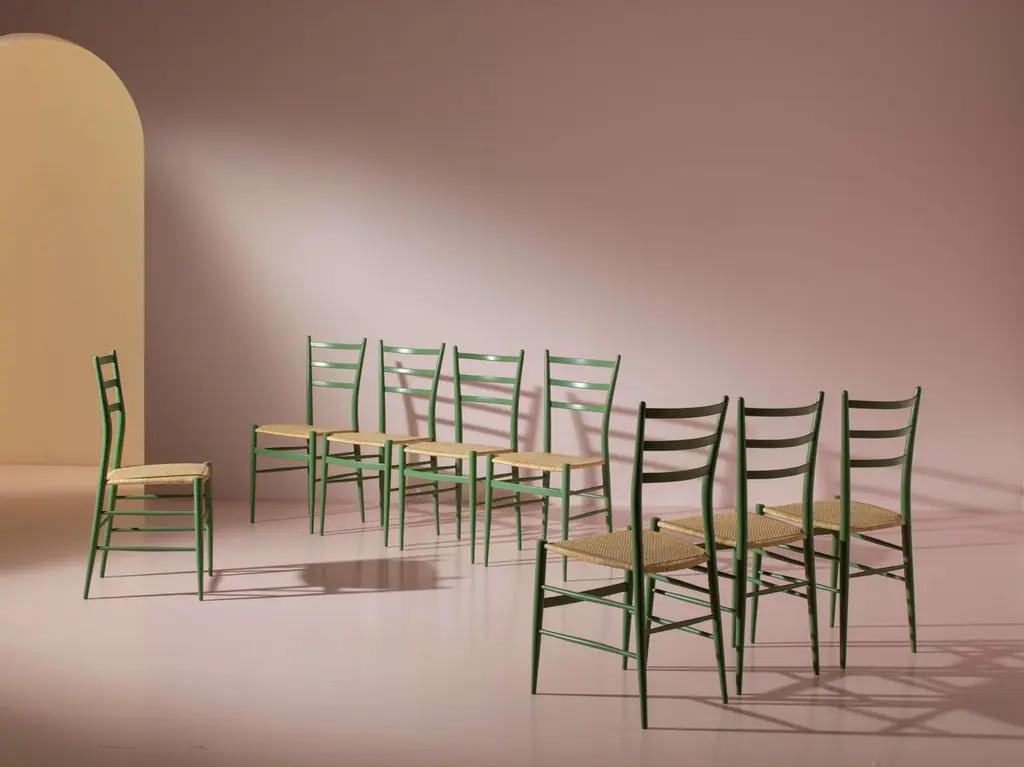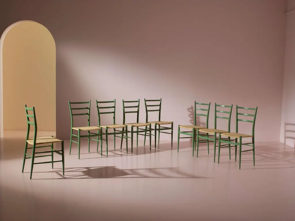 Set of eight Chiavari chairs in lacquered beechwood with Indian cane seat, “Tre Stecche” model, in the exclusive “Santa Margherita” green colorThe “Tre Stecche” model, presented here, derives its name from the distinctive design of its backrest, featuring three horizontal wooden slats. First produced in the late 1940s, this model has proven to be exceptionally versatile, seamlessly integrating into a wide variety of living spaces and interior design styles. Its design has been celebrated by renowned and avant-garde architects and has frequently appeared in Domus magazine, often complementing interiors designed by Marco Zanuso.The presented set has undergone complete restoration, both in its wooden structure and its finish. The chosen finish is the “Santa Margherita” green, a rich matte olive hue evoking the land and sea of Liguria’s unique landscape. The seat, handwoven in Indian cane, provides a subtle yet elegant contrast to the warm green tone of the wood.This set of chairs is well-suited to domestic environments, such as a large dining table, as well as public spaces, including bars and restaurants, where finely crafted artisan pieces with sophisticated designs are meant to stand out.The production of these chairs is tied to the historic SAC (Sedie Artistiche Chiavari) label, a manufacturer that, although no longer in operation, holds a significant place in the history of the iconic Chiavari lightweight chair, thanks to the quality and elegance of its models. Today, these chairs are highly sought after by interior designers and collectors.Dimensions: 42W c 43D x 90H cm - seat height: 46 cm.