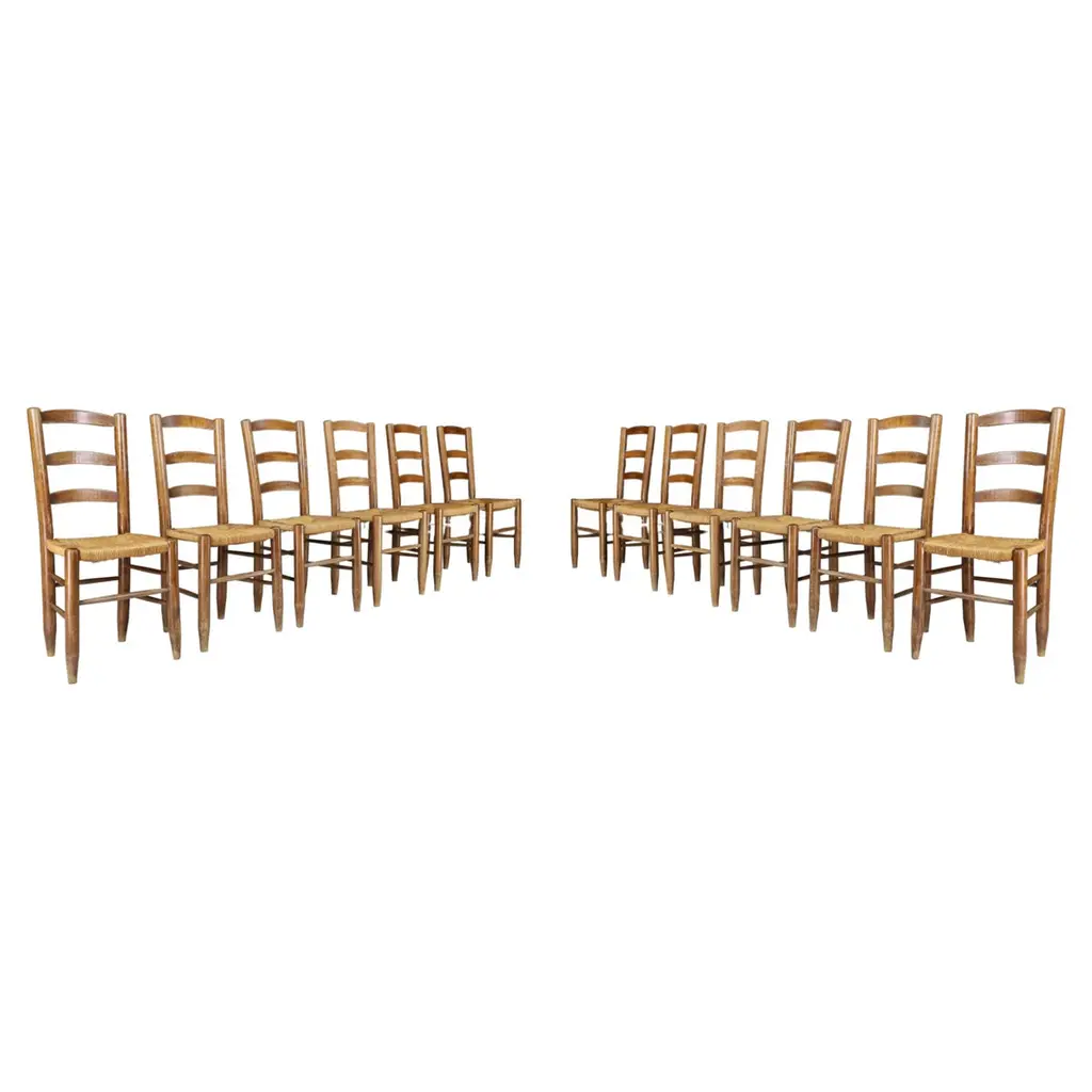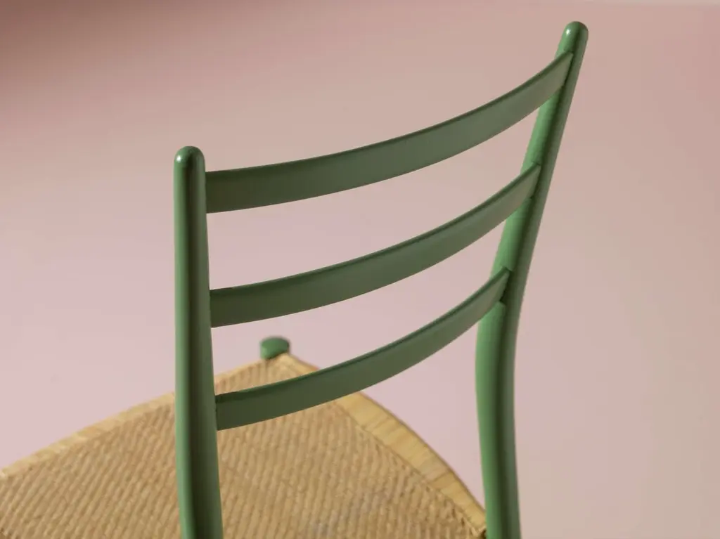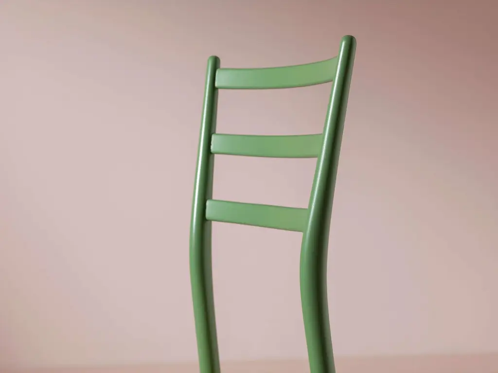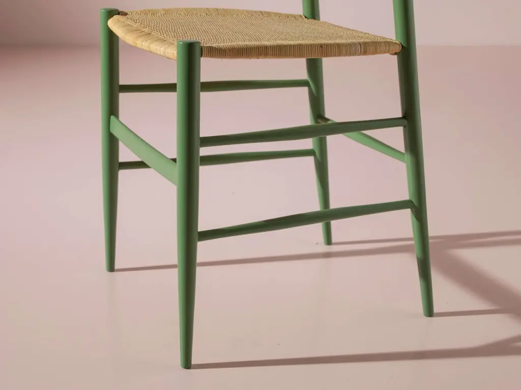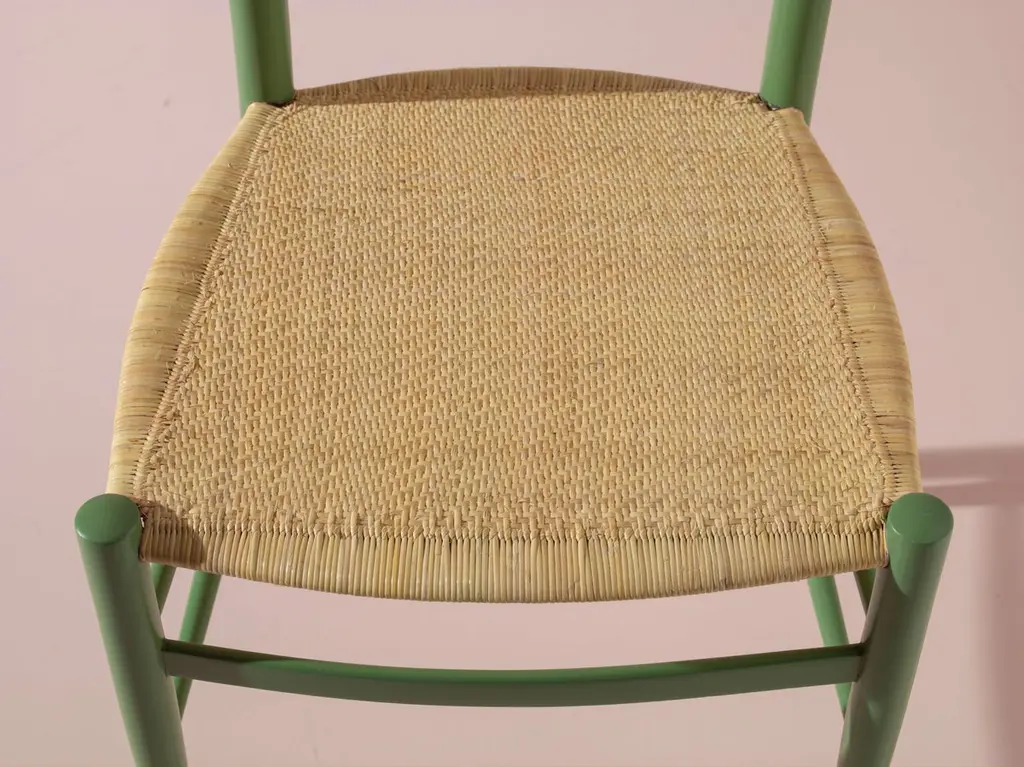 Set of eight Chiavari chairs in lacquered beechwood with Indian cane seat, “Tre Stecche” model, in the exclusive “Santa Margherita” green colorThe “Tre Stecche” model, presented here, derives its name from the distinctive design of its backrest, featuring three horizontal wooden slats. First produced in the late 1940s, this model has proven to be exceptionally versatile, seamlessly integrating into a wide variety of living spaces and interior design styles. Its design has been celebrated by renowned and avant-garde architects and has frequently appeared in Domus magazine, often complementing interiors designed by Marco Zanuso.The presented set has undergone complete restoration, both in its wooden structure and its finish. The chosen finish is the “Santa Margherita” green, a rich matte olive hue evoking the land and sea of Liguria’s unique landscape. The seat, handwoven in Indian cane, provides a subtle yet elegant contrast to the warm green tone of the wood.This set of chairs is well-suited to domestic environments, such as a large dining table, as well as public spaces, including bars and restaurants, where finely crafted artisan pieces with sophisticated designs are meant to stand out.The production of these chairs is tied to the historic SAC (Sedie Artistiche Chiavari) label, a manufacturer that, although no longer in operation, holds a significant place in the history of the iconic Chiavari lightweight chair, thanks to the quality and elegance of its models. Today, these chairs are highly sought after by interior designers and collectors.Dimensions: 42W c 43D x 90H cm - seat height: 46 cm.