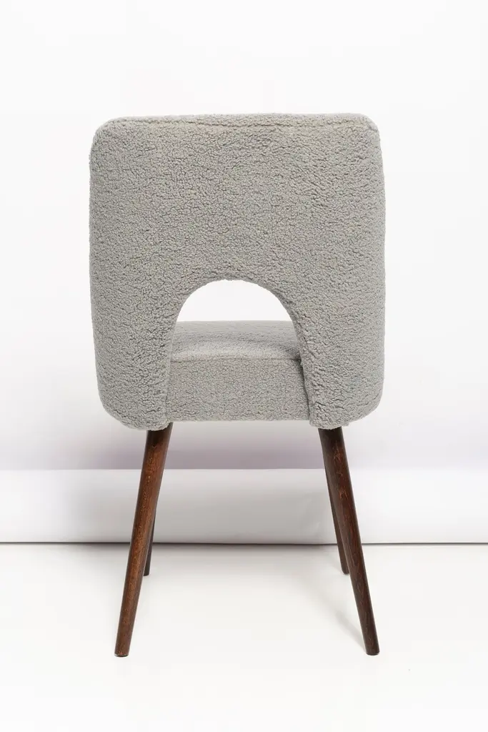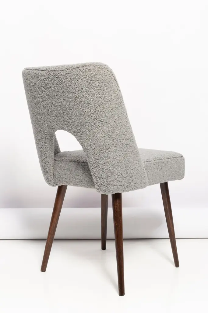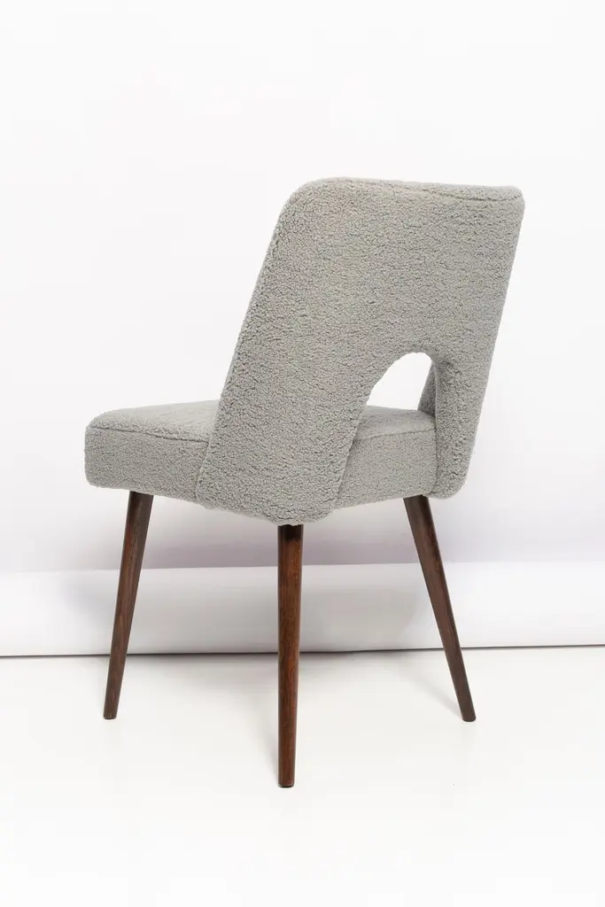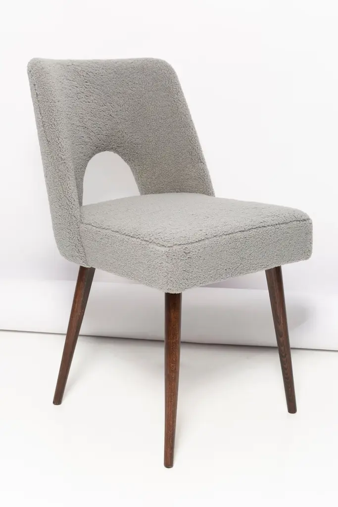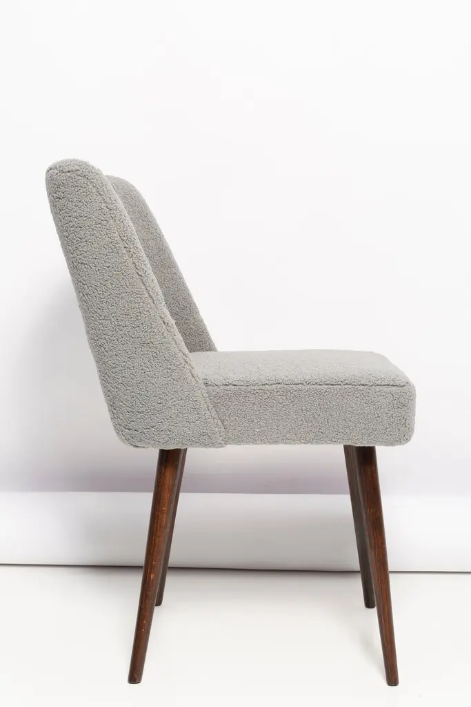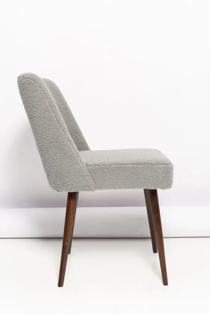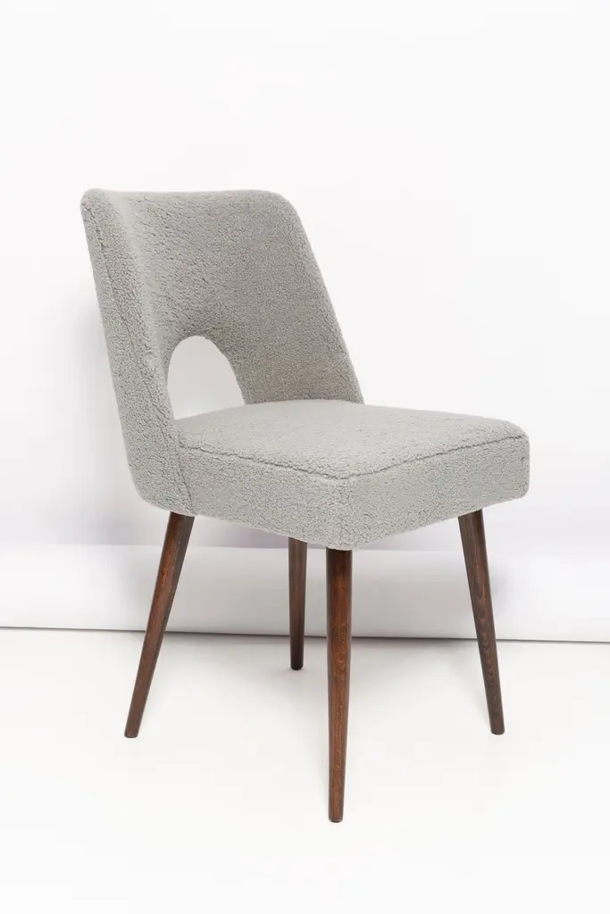 Set of eight beautiful chairs type 1020 colloquially called "shell" produced by the Slupsk centre of furniture industry in the 1960s in Poland. They are after full renovation upholstery and carpentry. Seat and back is dressed in gray (number 06), durable and pleasant to the touch Italian bouclé fabric. We can prepare this chairs in every color of wood and fabric also in bigger sets. Please check the last picture with boucle color samples.