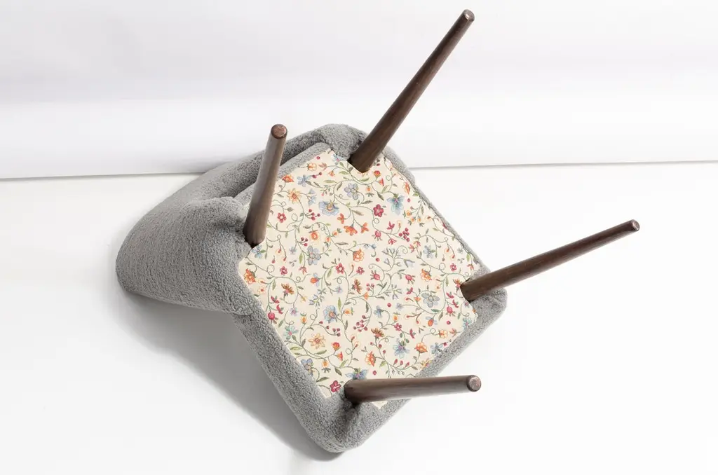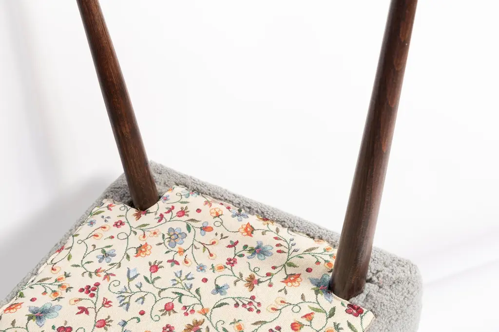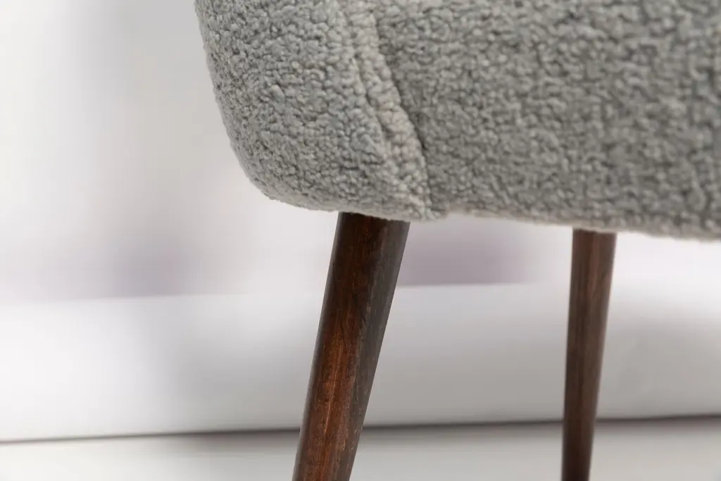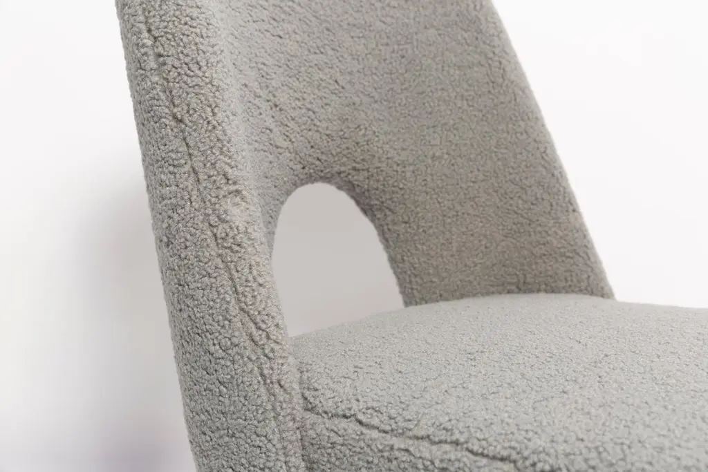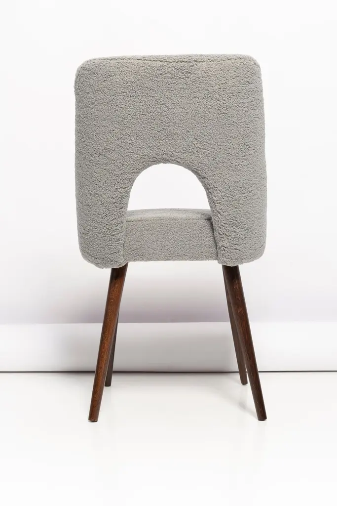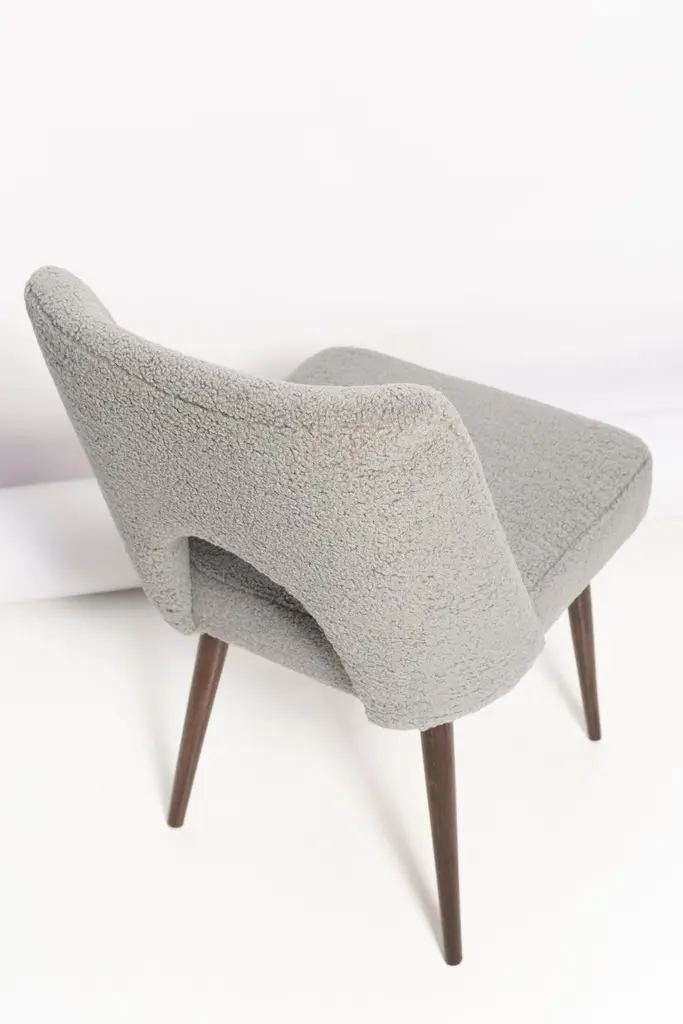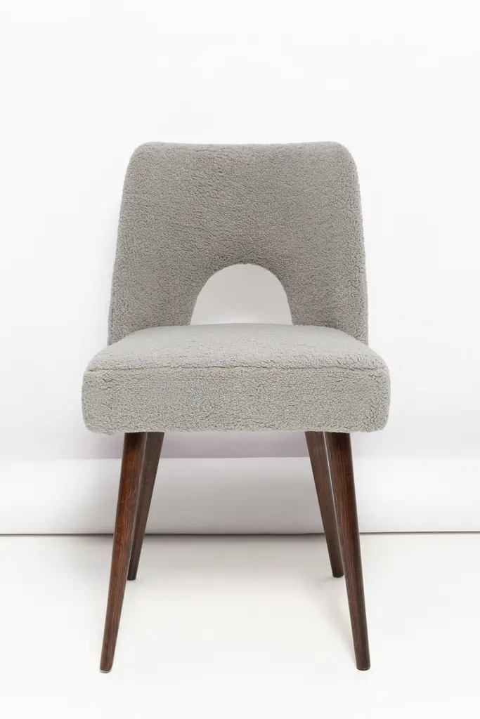 Set of eight beautiful chairs type 1020 colloquially called "shell" produced by the Slupsk centre of furniture industry in the 1960s in Poland. They are after full renovation upholstery and carpentry. Seat and back is dressed in gray (number 06), durable and pleasant to the touch Italian bouclé fabric. We can prepare this chairs in every color of wood and fabric also in bigger sets. Please check the last picture with boucle color samples.
