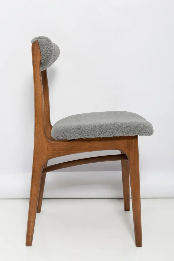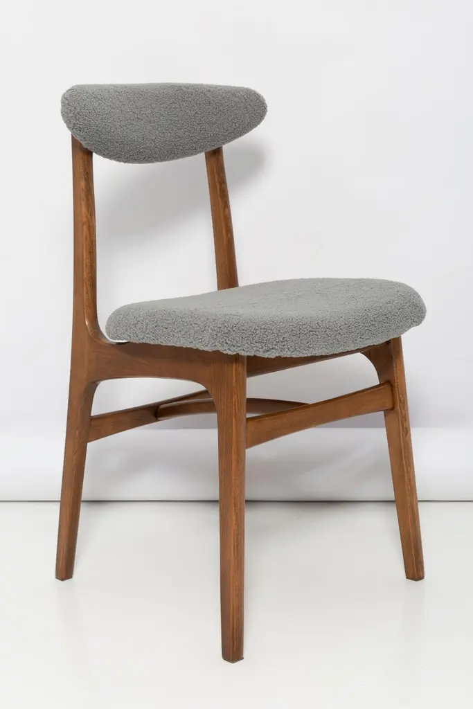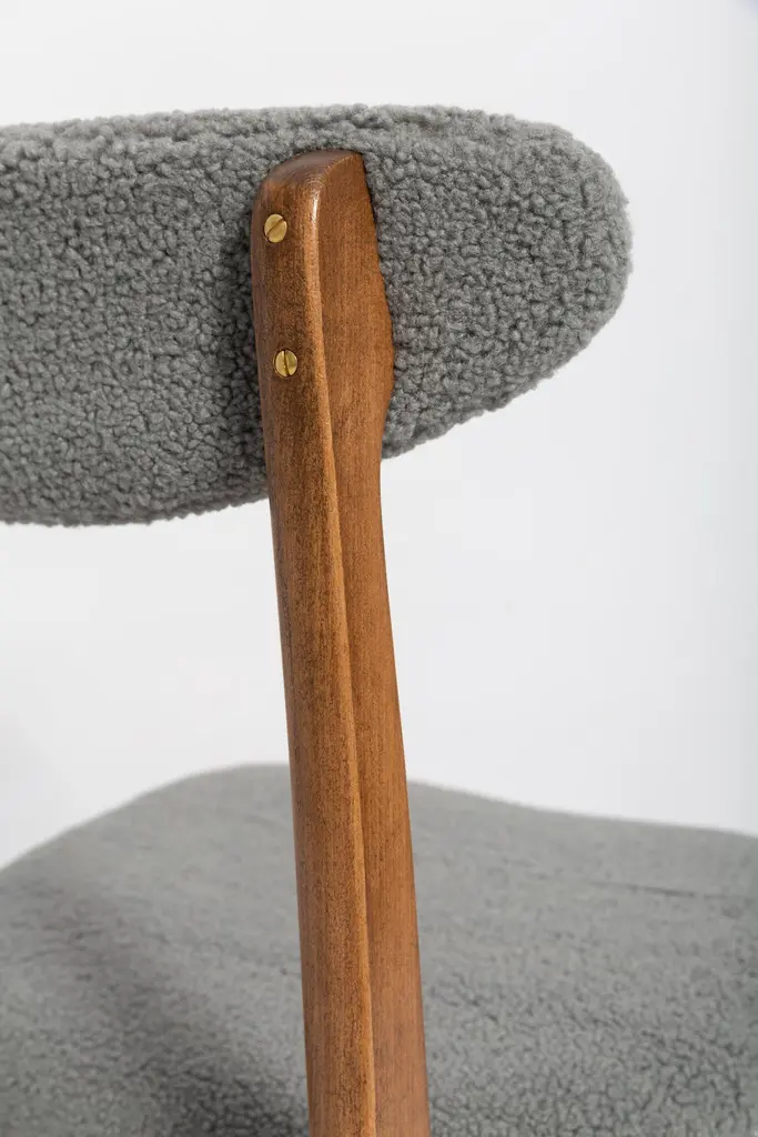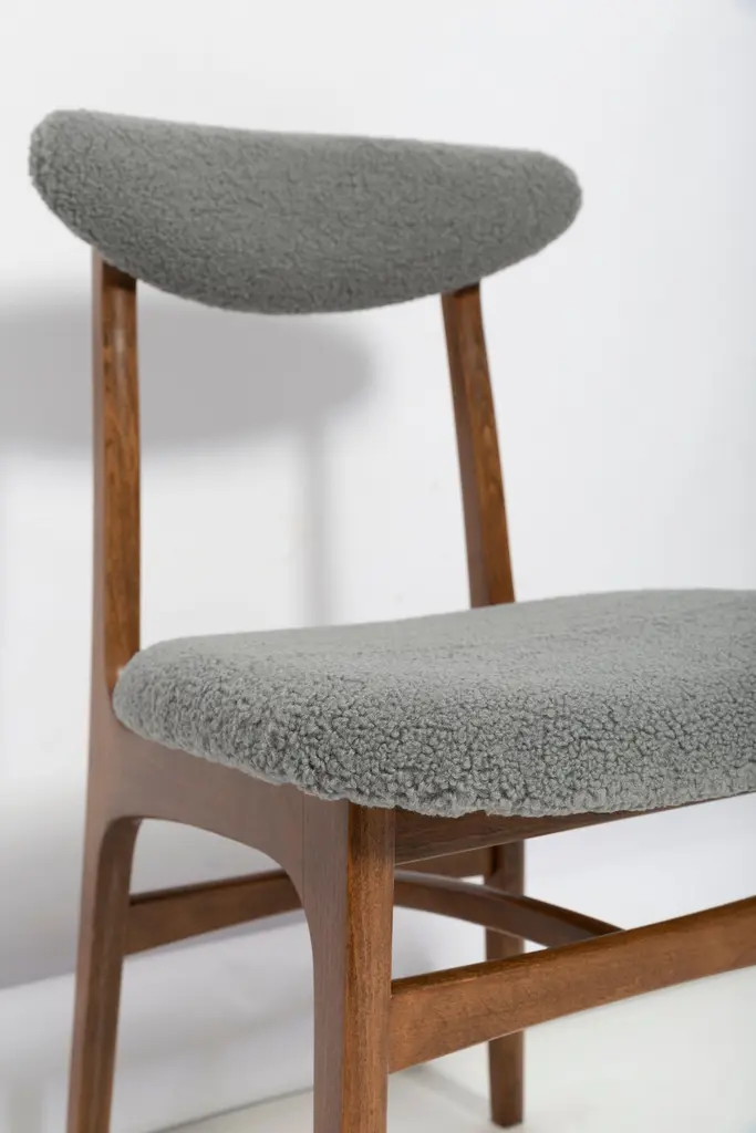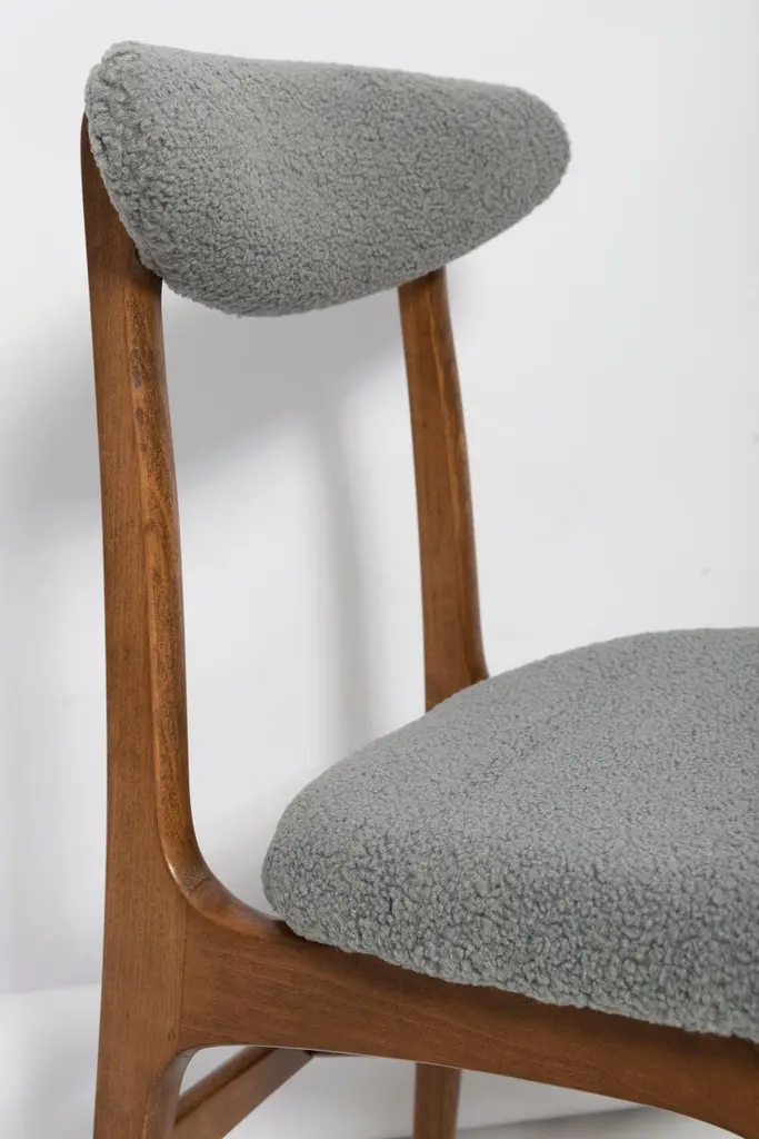 Light form nice vintage chairs designed by Prof. Rajmund Halas. It has been made of beechwood. Designed and produced in Poland. Chairs are after undergone a complete upholstery renovation, the woodwork has been refreshed. Seats and backs were dressed in a gray, durable and pleasant to the touch boucle fabric. The chair is stabile and very shapely. Chair was produced in former furniture factory in Goleniów in the 1960s. We can prepare also set of two, six or more chairs in other fabric and wood color. Check the last pictures with samples.