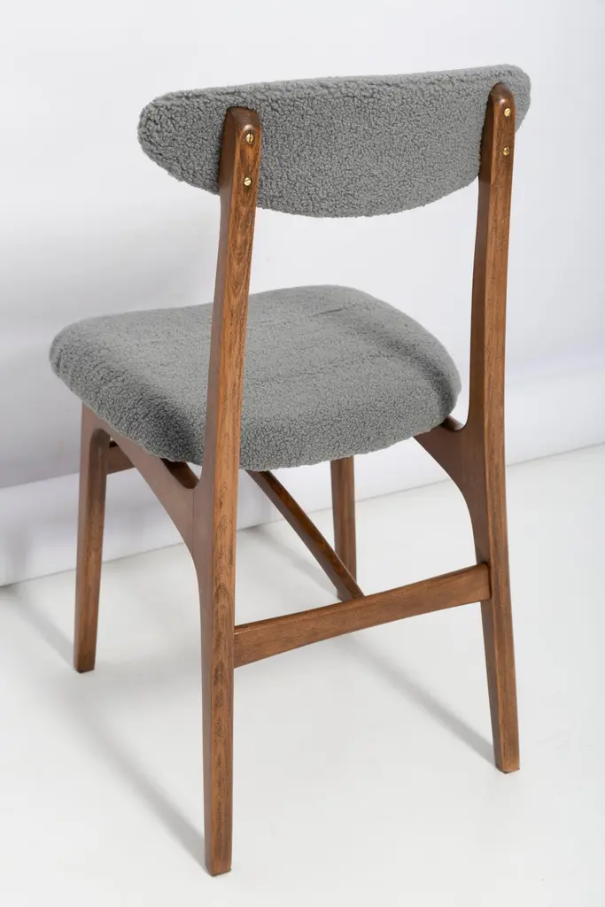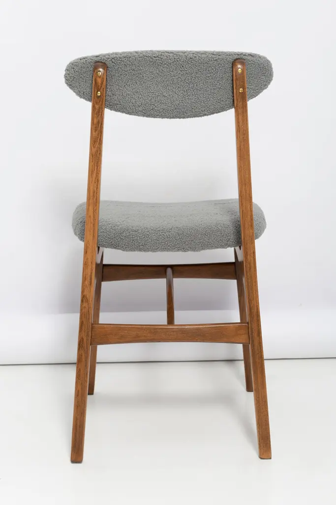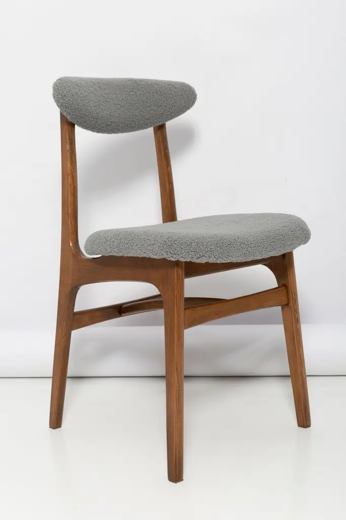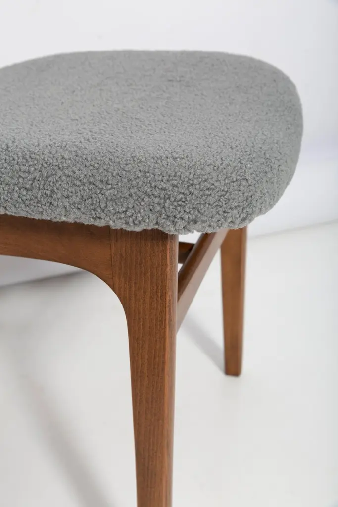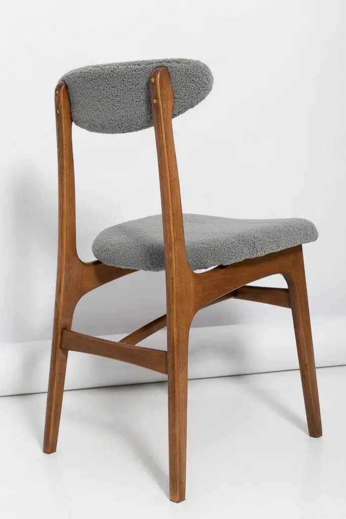 Light form nice vintage chairs designed by Prof. Rajmund Halas. It has been made of beechwood. Designed and produced in Poland. Chairs are after undergone a complete upholstery renovation, the woodwork has been refreshed. Seats and backs were dressed in a gray, durable and pleasant to the touch boucle fabric. The chair is stabile and very shapely. Chair was produced in former furniture factory in Goleniów in the 1960s. We can prepare also set of two, six or more chairs in other fabric and wood color. Check the last pictures with samples.