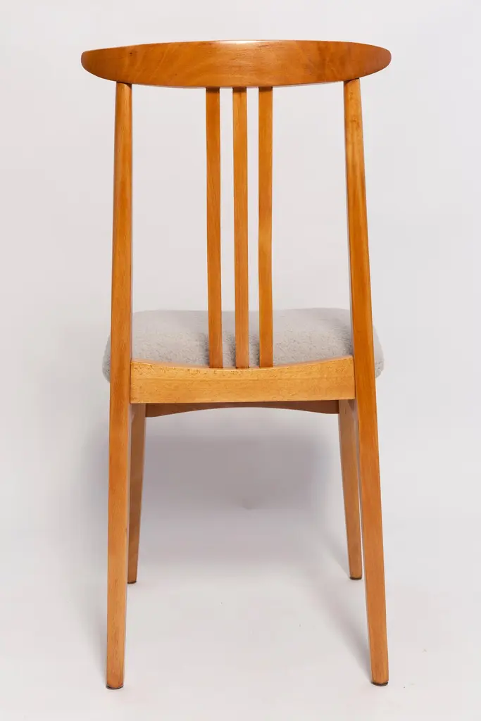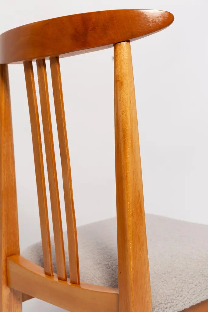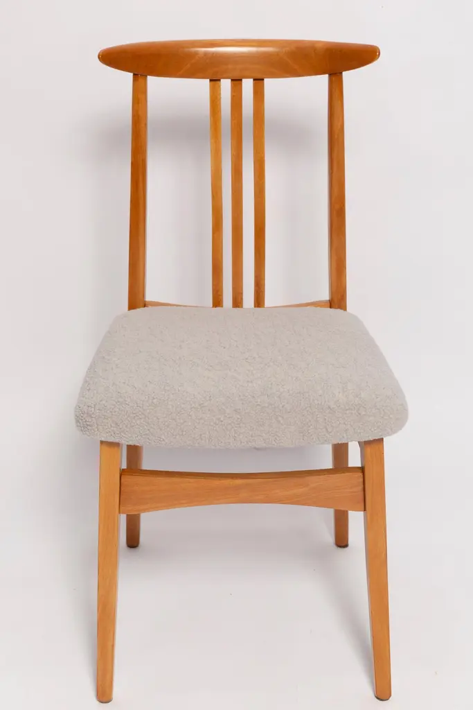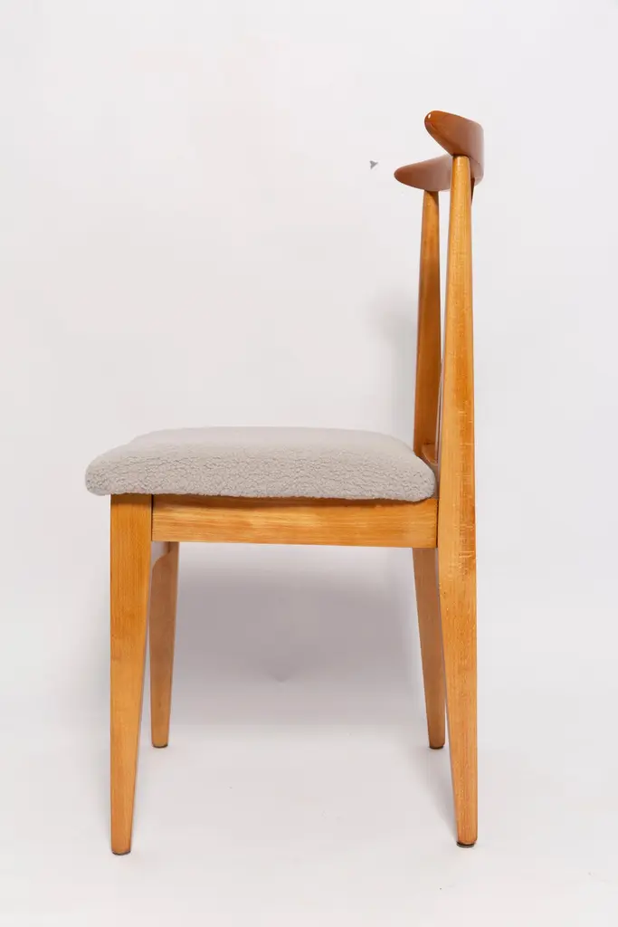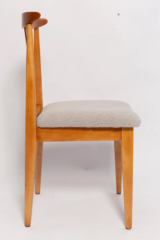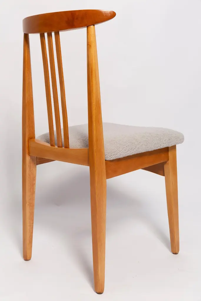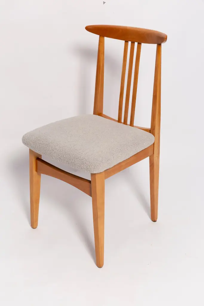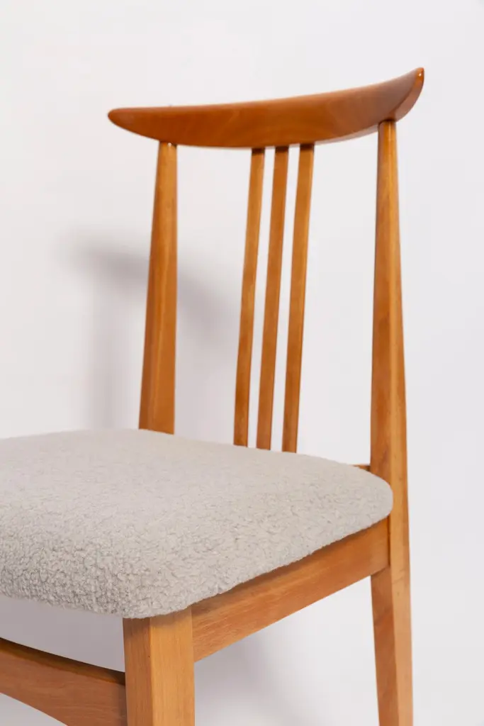 A beautiful beech chair designed by M. Zielinski, type 200 / 100B. Manufactured by the Opole Furniture Industry Center at the end of the 1960s in Poland. The chair is after undergone a complete carpentry and upholstery renovation. Seats covered with high-quality italian light linen boucle fabric (color 08). Beech wood is after full refreshing, varnished in a light brown color lacquer. This model of chair have very nice and organic shape. They have amazing form. Even in small size the Zielinski's chair is very comfortable. We highly recommend them to every type of interior. ecommend them to every type of interior. Here set of 8 chairs is available. We can prepare also smaller or bigger sets in every color of wood and boucle. Waiting time up to 3 weeks. Cheap delivery guaranteed.