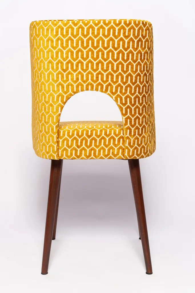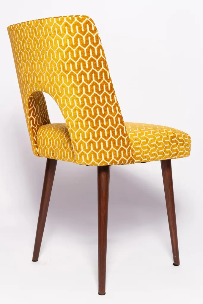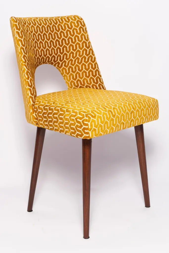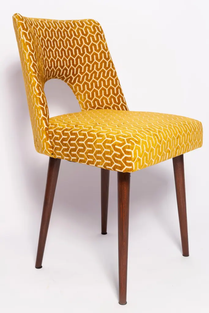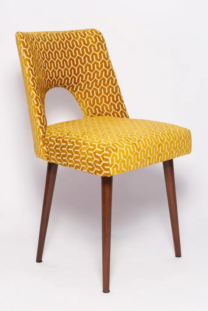 Beautiful chair type 1020 colloquially called "shell" produced by the Slupsk centre of furniture industry in the 1960s in Poland. Designers: Waclaw Lesniewski, Stanislaw Lejkowski. Very unique and unrepeatable model. They are after full renovation upholstery and carpentry. Seat and back is dressed in yellow and beige, durable and pleasant to the touch spanish fabric. We can prepare this chair in every color of wood and fabric also in bigger sets. Please check the last picture with fabric and wood color samples.about the fabric:It is a soft, chenille, jacquard upholstery fabric. Pleasant to the touch, it boasts a graphic meander pattern. The lines are reminiscent of a maze, painted Moroccan ornaments, or house lines in urban structures. Available in 10 colour variants, Recommended for ethnic- and modern-style interiors. Here set of 8 is available.