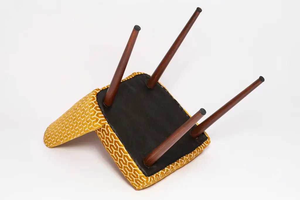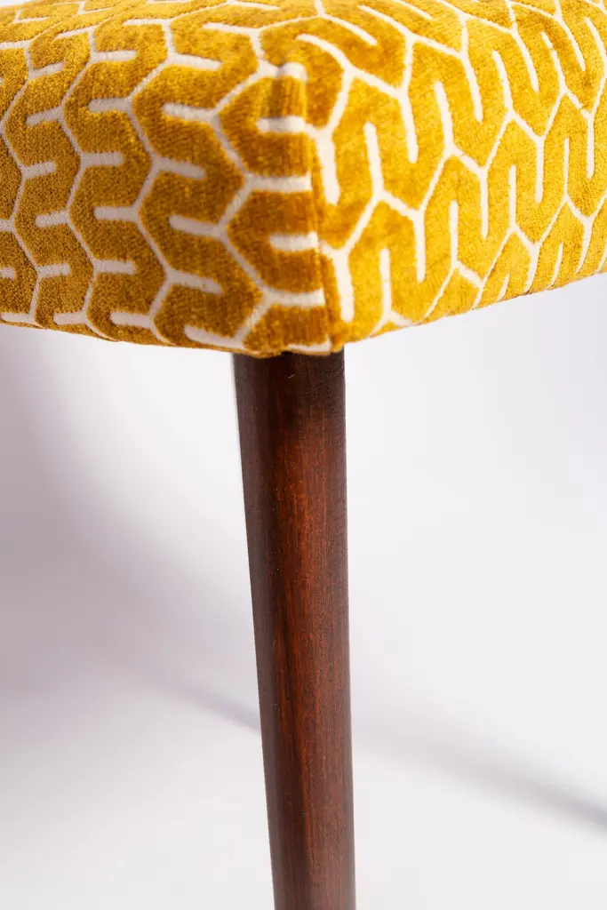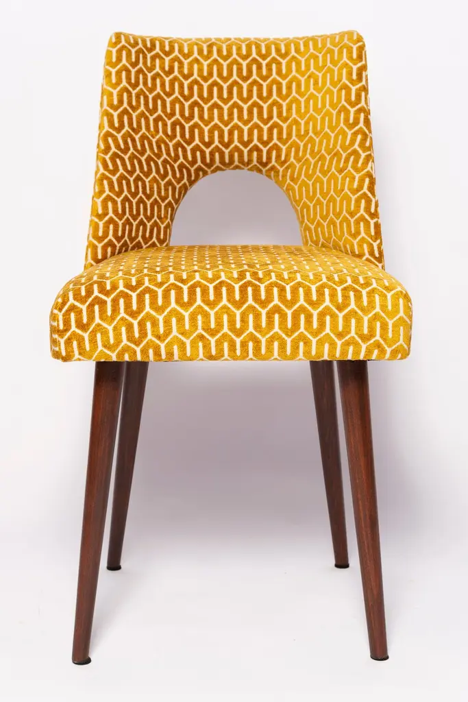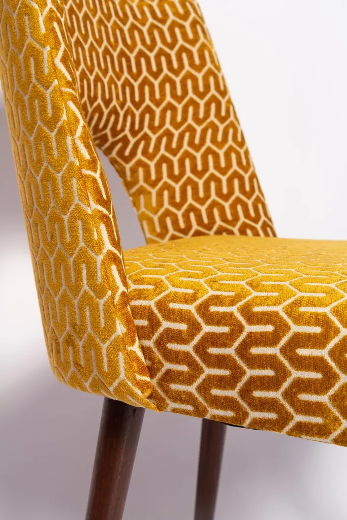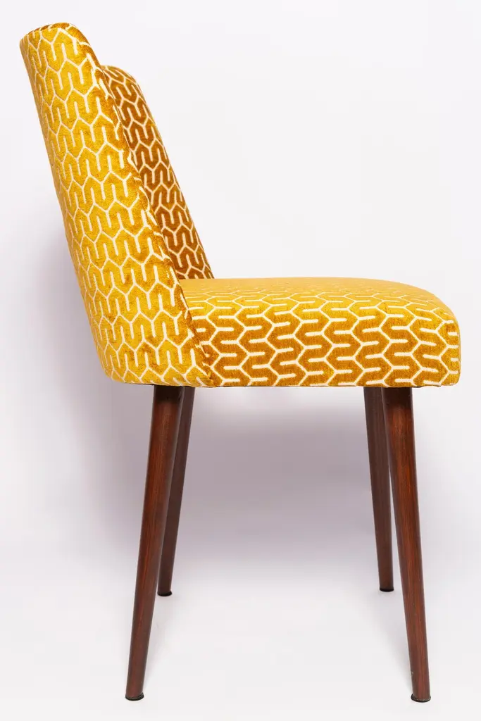Beautiful chair type 1020 colloquially called "shell" produced by the Slupsk centre of furniture industry in the 1960s in Poland. Designers: Waclaw Lesniewski, Stanislaw Lejkowski. Very unique and unrepeatable model. They are after full renovation upholstery and carpentry. Seat and back is dressed in yellow and beige, durable and pleasant to the touch spanish fabric. We can prepare this chair in every color of wood and fabric also in bigger sets. Please check the last picture with fabric and wood color samples.about the fabric:It is a soft, chenille, jacquard upholstery fabric. Pleasant to the touch, it boasts a graphic meander pattern. The lines are reminiscent of a maze, painted Moroccan ornaments, or house lines in urban structures. Available in 10 colour variants, Recommended for ethnic- and modern-style interiors. Here set of 8 is available.
