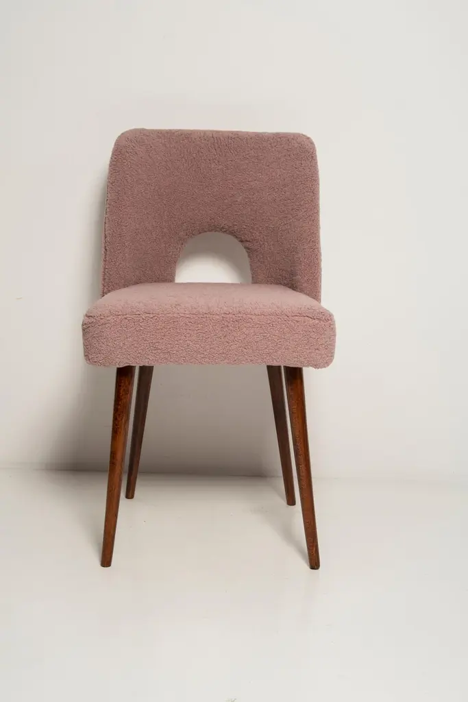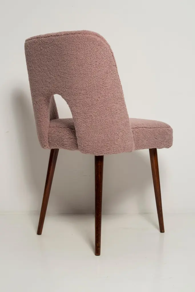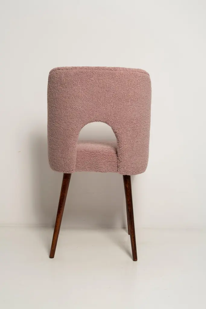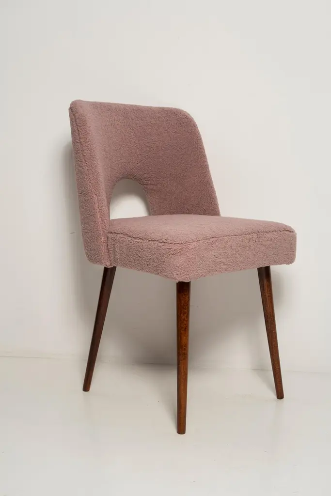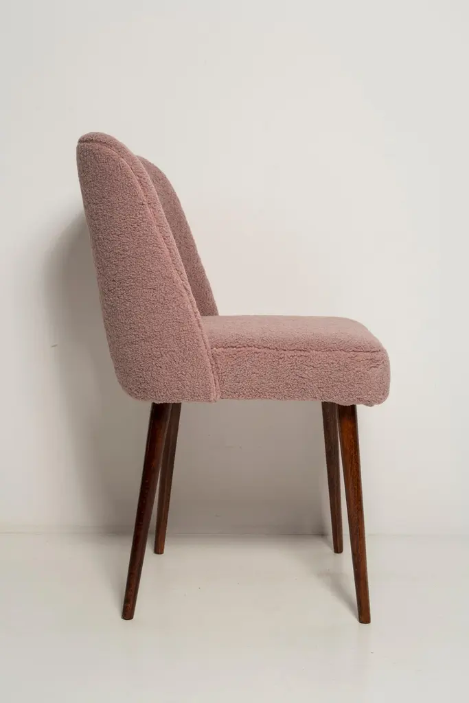 Set of eight beautiful chairs type 1020 colloquially called "shells" produced by the Slupsk centre of furniture industry in the 1960s in Poland. They are after full renovation upholstery and carpentry. Seat and back is dressed in pink (color 03), durable and pleasant to the touch bouclé fabric. We can prepare this set in every color of wood and fabric also in smaller or bigger sets.