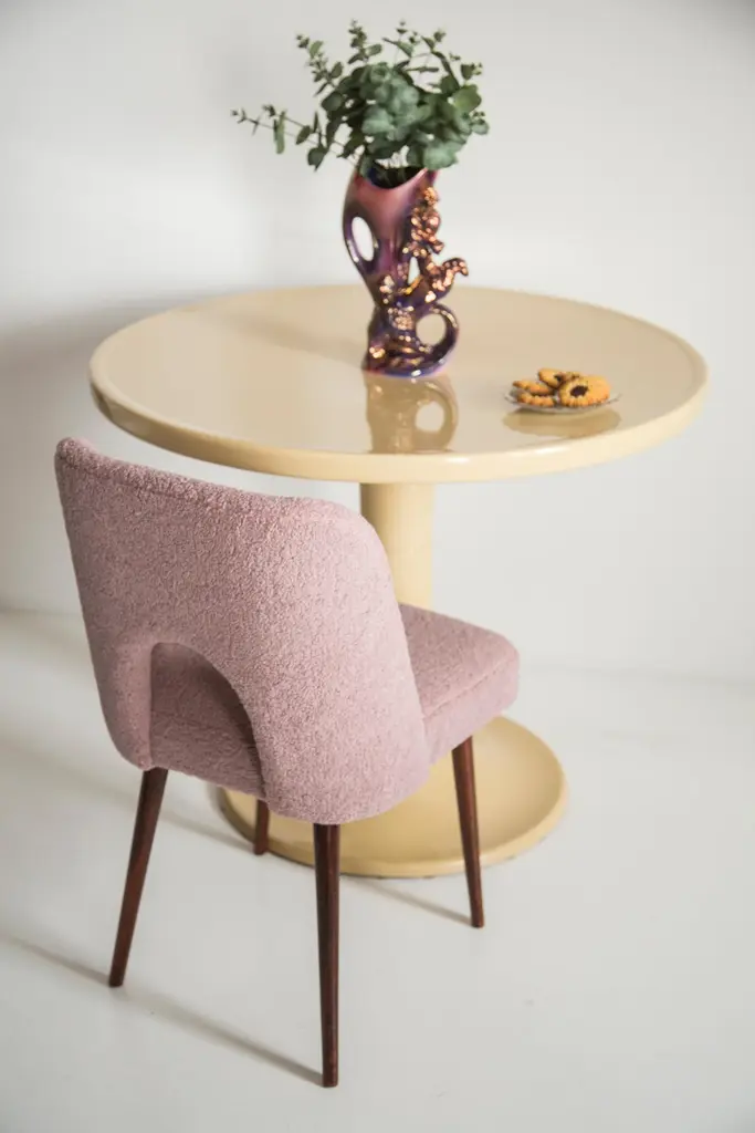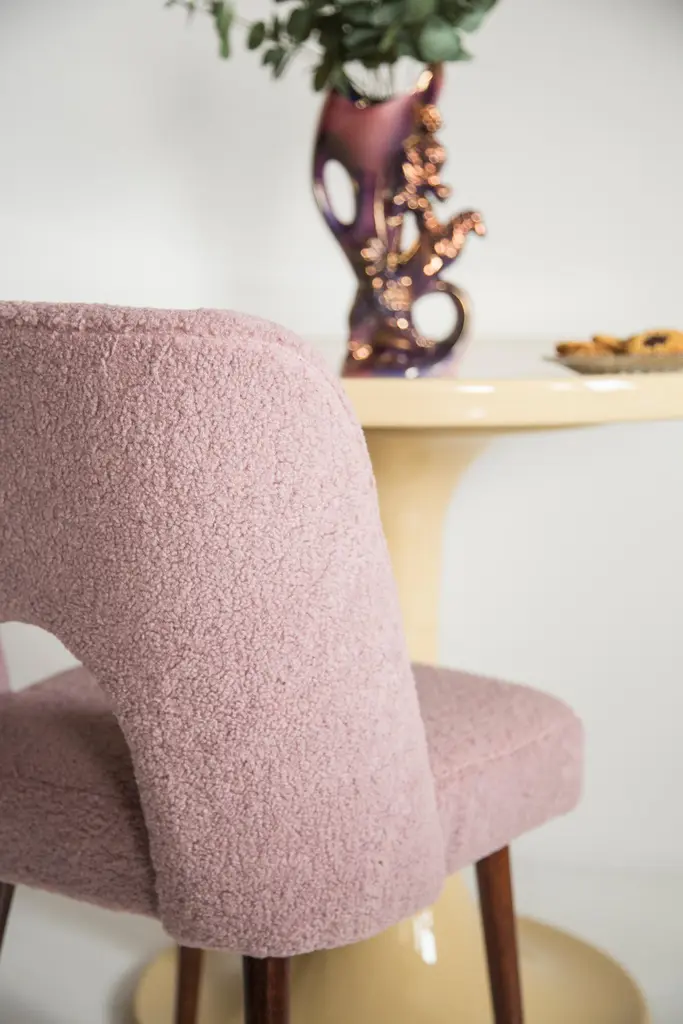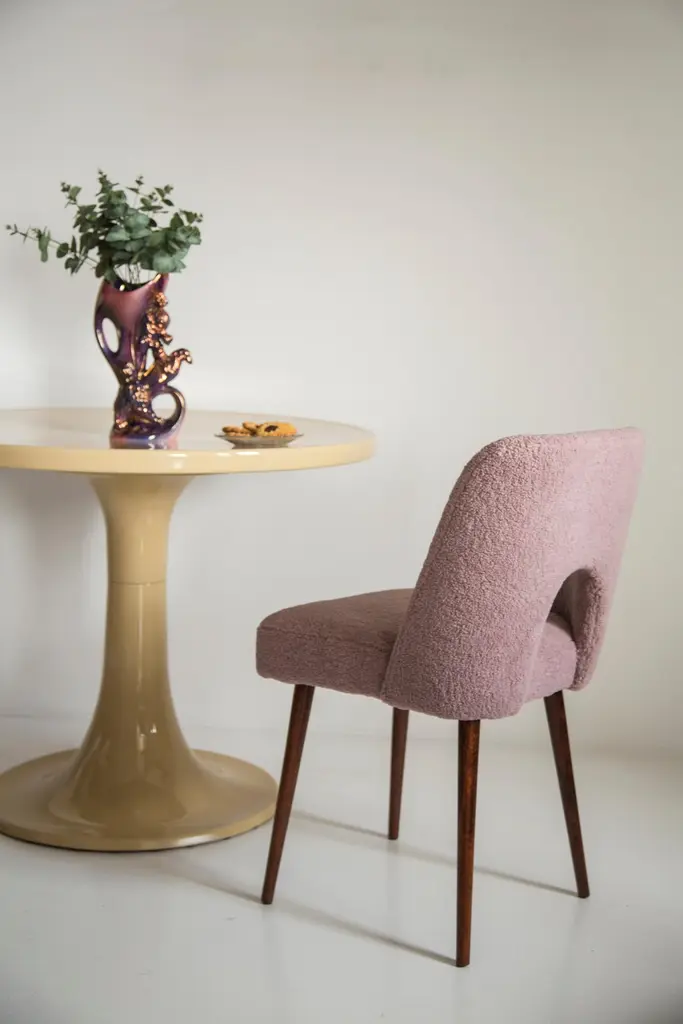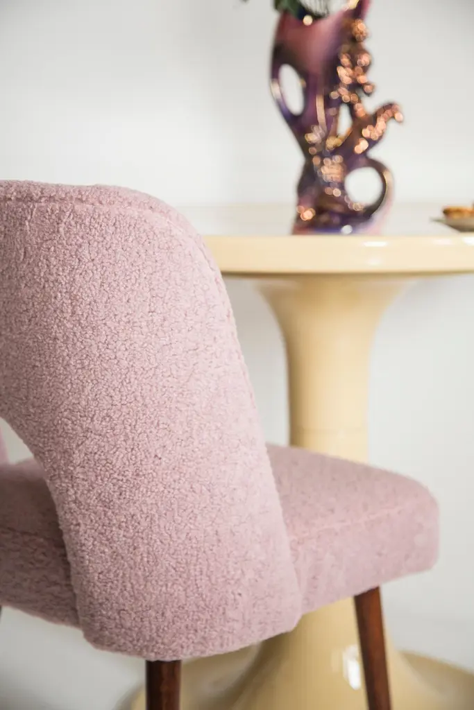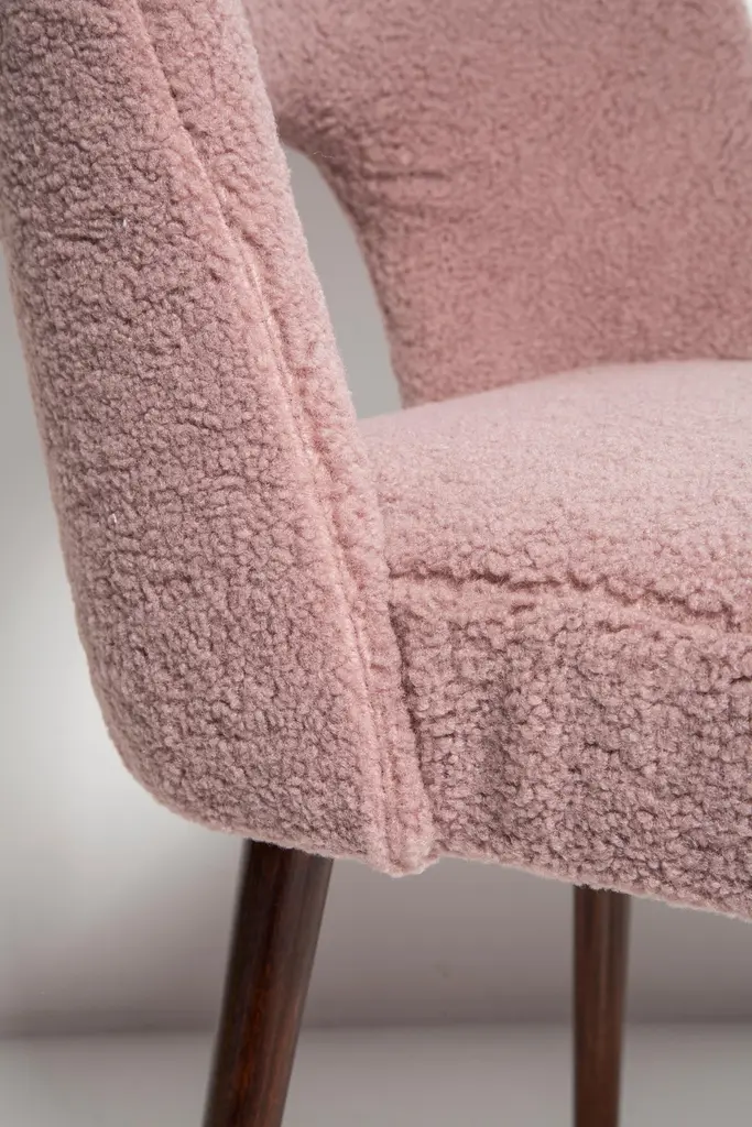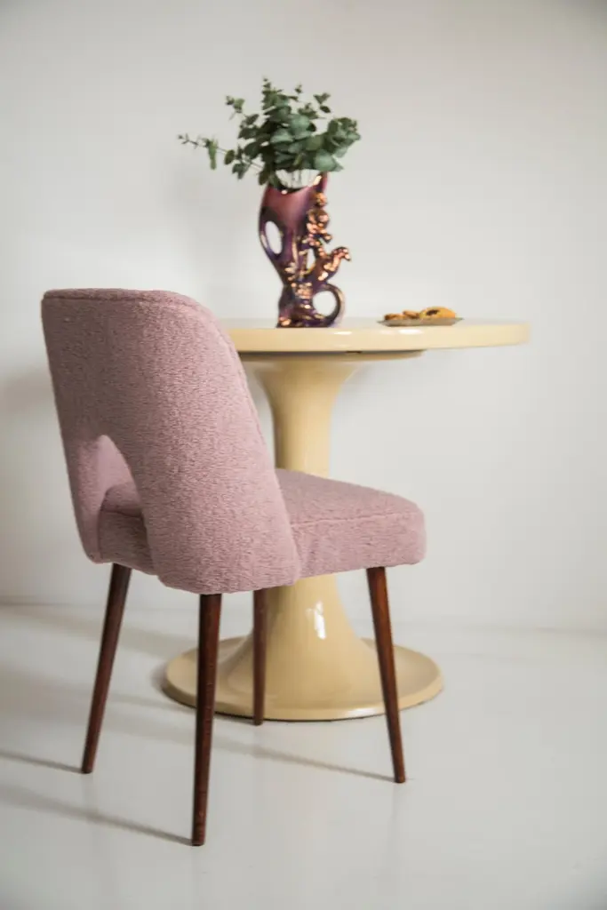 Set of eight beautiful chairs type 1020 colloquially called "shells" produced by the Slupsk centre of furniture industry in the 1960s in Poland. They are after full renovation upholstery and carpentry. Seat and back is dressed in pink (color 03), durable and pleasant to the touch bouclé fabric. We can prepare this set in every color of wood and fabric also in smaller or bigger sets.