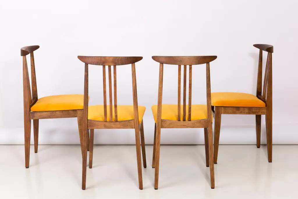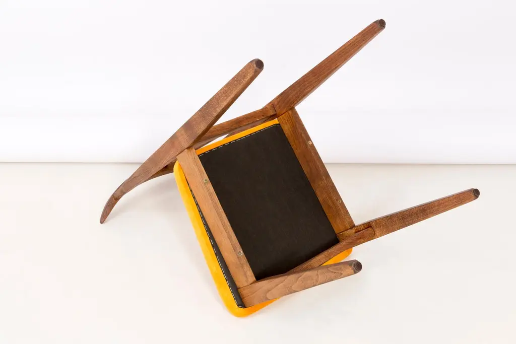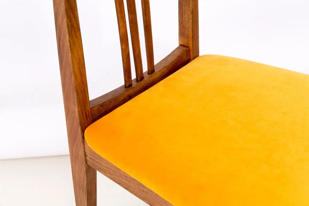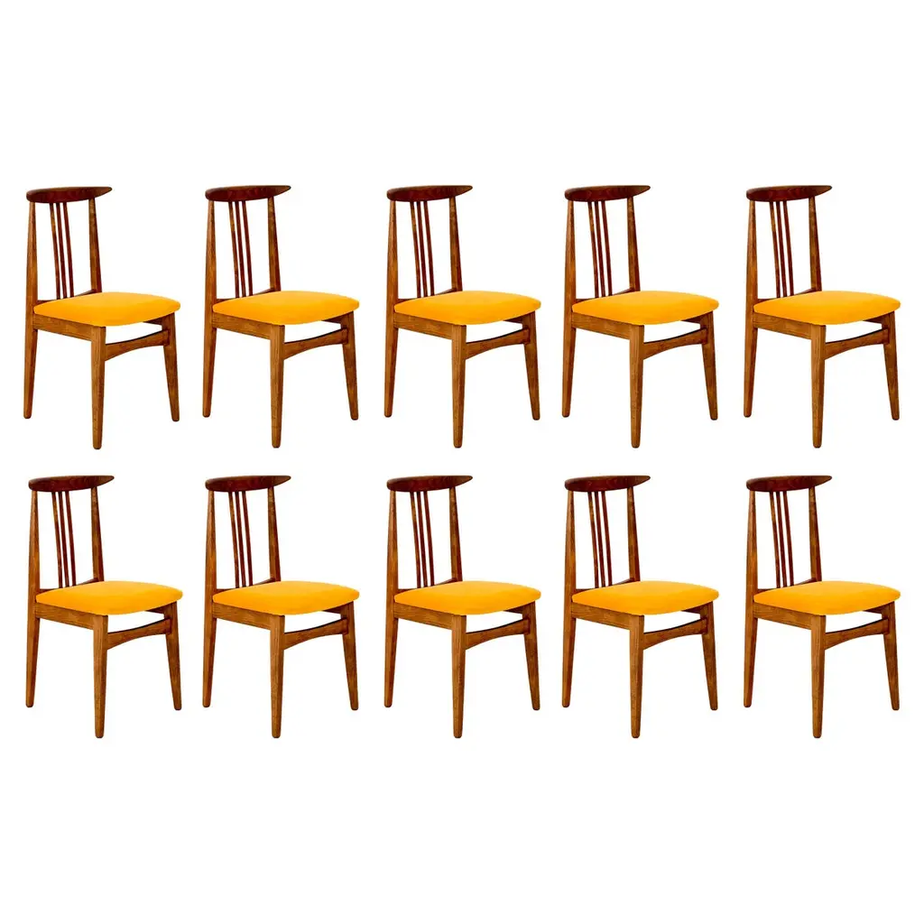 Set of eight beech chairs designed by M. Zielinski, type 200 / 100B. Manufactured by the Opole Furniture Industry Center at the end of the 1960s in Poland. The chairs have undergone a complete carpentry and upholstery renovation. Seats covered with high-quality yellow velvet (color 2212). If you want this set in another wood or fabric color please check the last picture. We can prepare also smaller and bigger sets.
